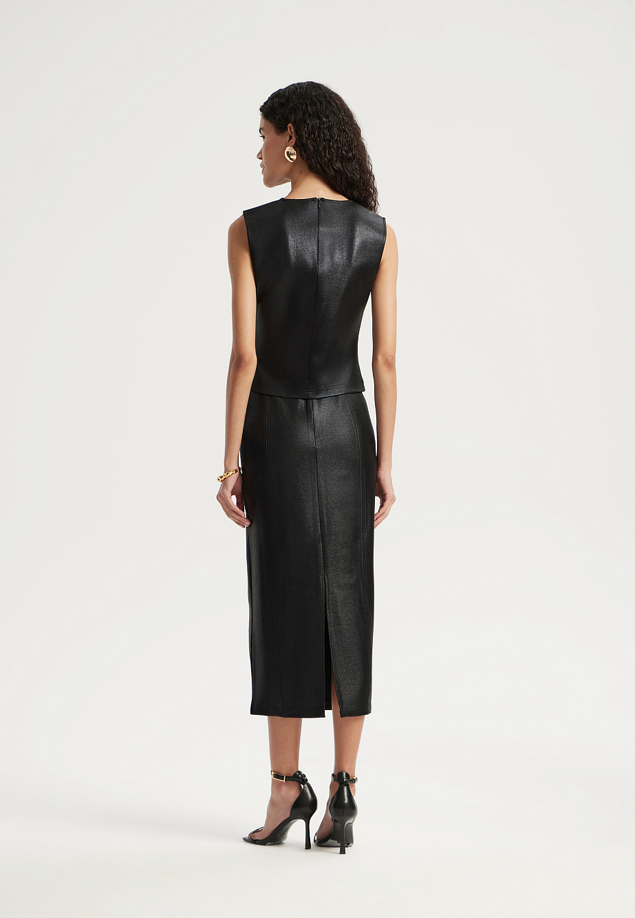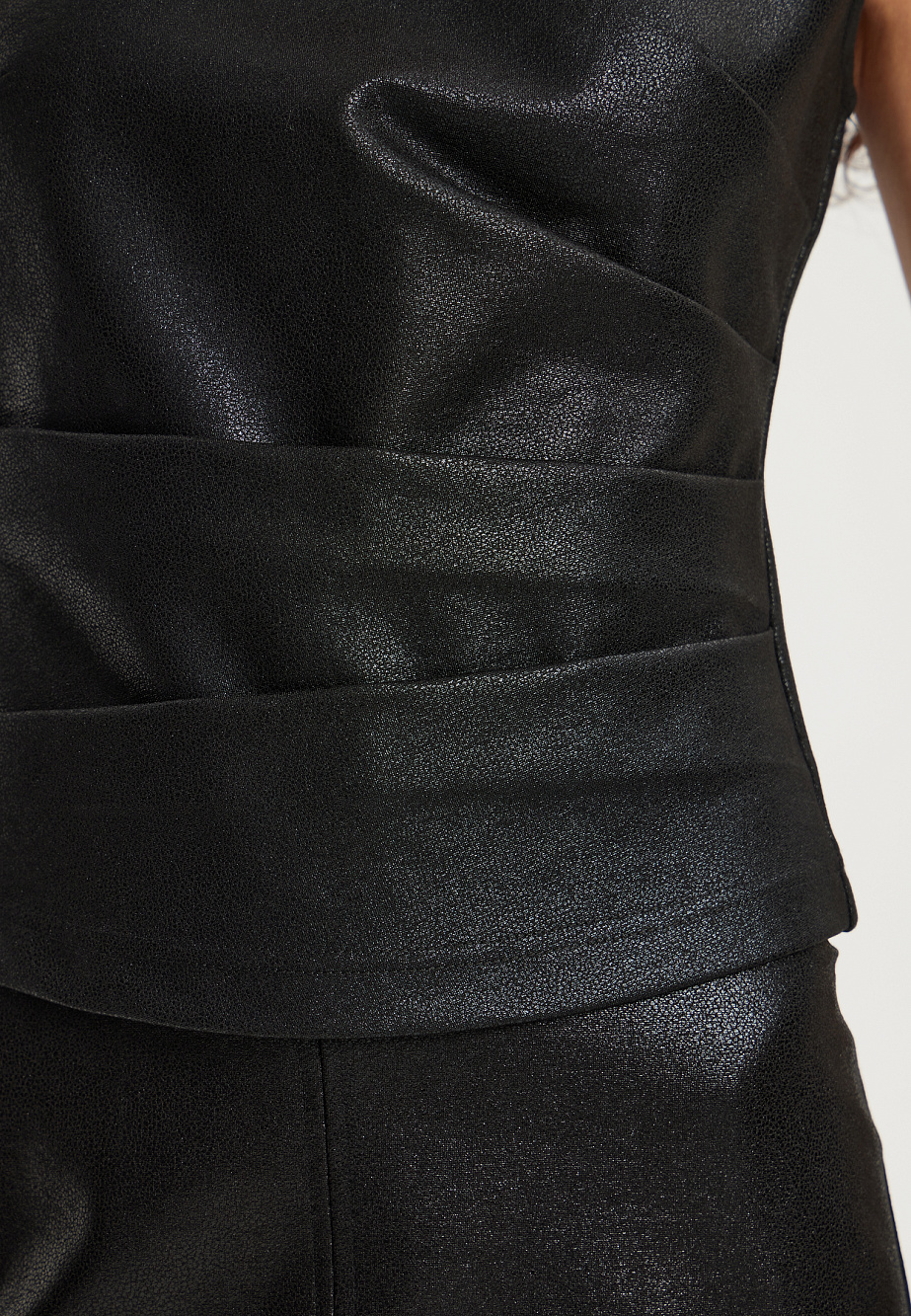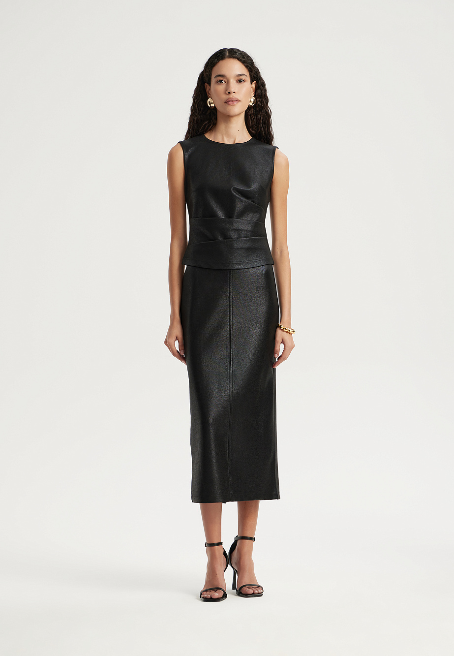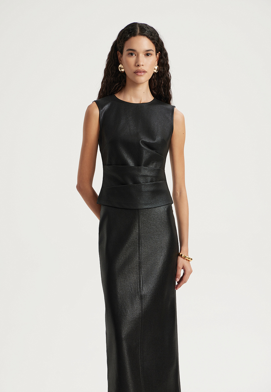 Комплект,состоящий из топа и юбки изготовлен из трикотажа с с высоким содержанием района и с эффектом ламинирования под кожу. Глубокие ассиметричные складки создают неповторимый ритм и продолжаясь на юбке напоминают цельное платье. Каждая вещь комплекта самостоятельно может дополнить гардероб современной женщины. Тактильно приятная фактура ткани , матовый блеск и универсальная посадка за счет высокой эластичности и драпировок , помогают привлечь внимание к женственным формам и создать стильный и привлекательный образ .