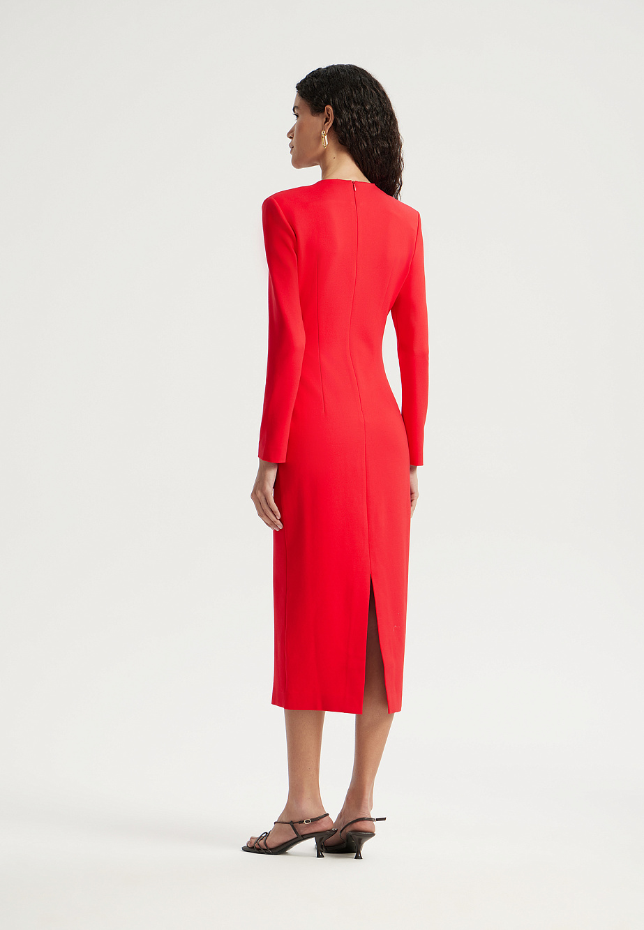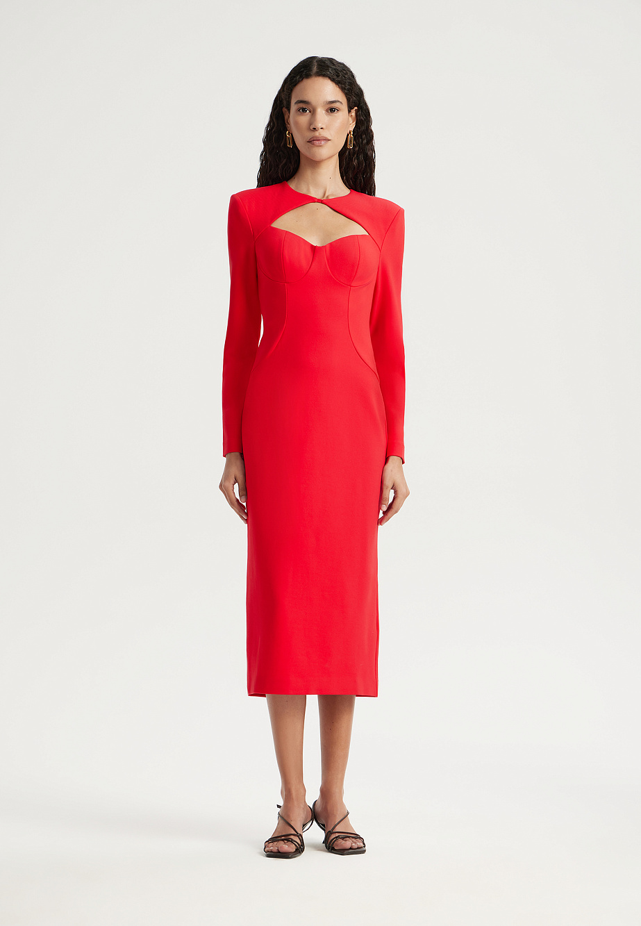 Коктейльное платье по фигуре с акцентом на плечи и декольте из плотного вискозного трикотажа. Казалось бы закрытая модель, но цвет,облегающий силуэт и фигурный вырез на груди притягивают взгляд и придают образу загадку и интригу. Конструкция со встроенными чашечками и фигурными рельефами позволяют добиться идеальной посадки и выгодно подчеркнуть женский силуэт. Платье для смелых дам и эффектных выходов.