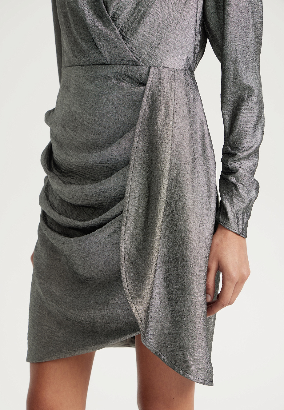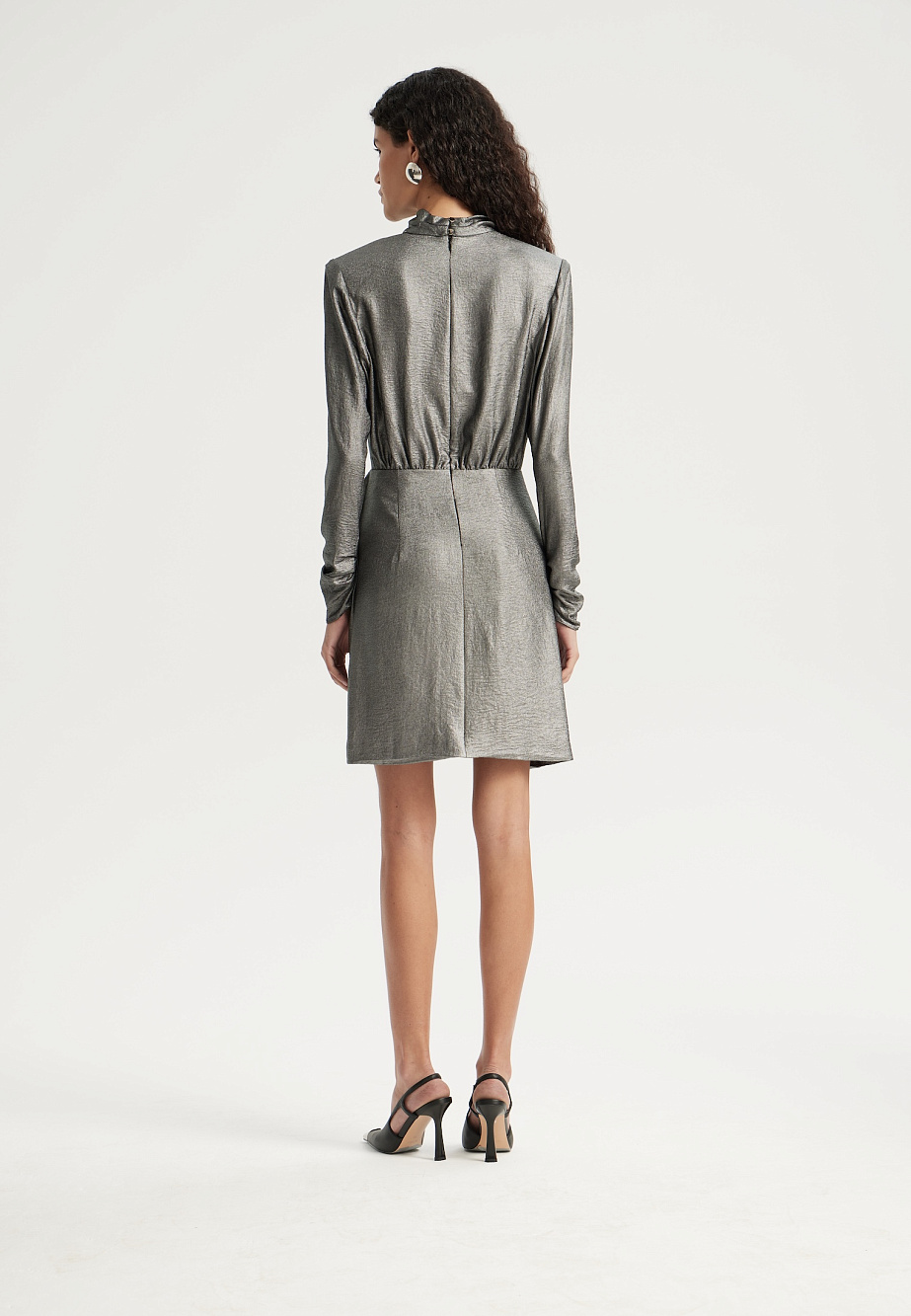 Эффектное мини-платье из ткани с металлическим блеском и эффектом жатости в стиле 90-х. Прямые, нарочито расширенные плечи и объемный верх контрастирует с маленьким объемом юбки и смотрится очень модно и современно. Ассиметричные детали и драпировки, зауженные книзу рукава с молнией,мягкий воротник-стойка, заманчивый вырез и отлетная деталь на юбке-такая необычная конструкция привлечет тех, кто любит что-то необычное.Такой незабываемый и актуальный образ прекрасно подойдетдля новогодней вечеринки или корпоратива .