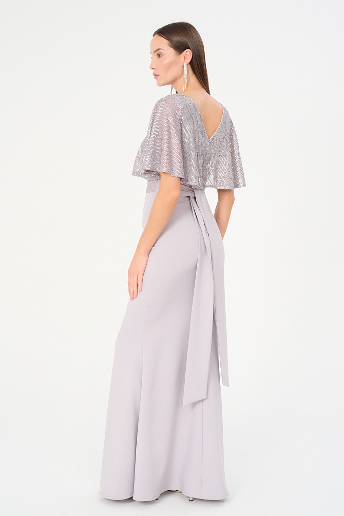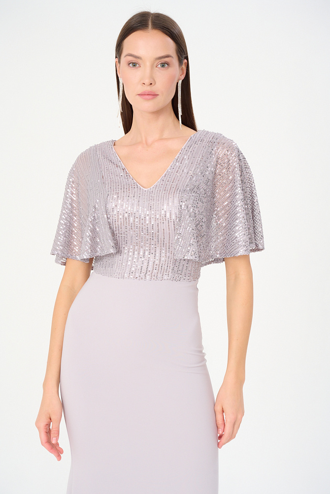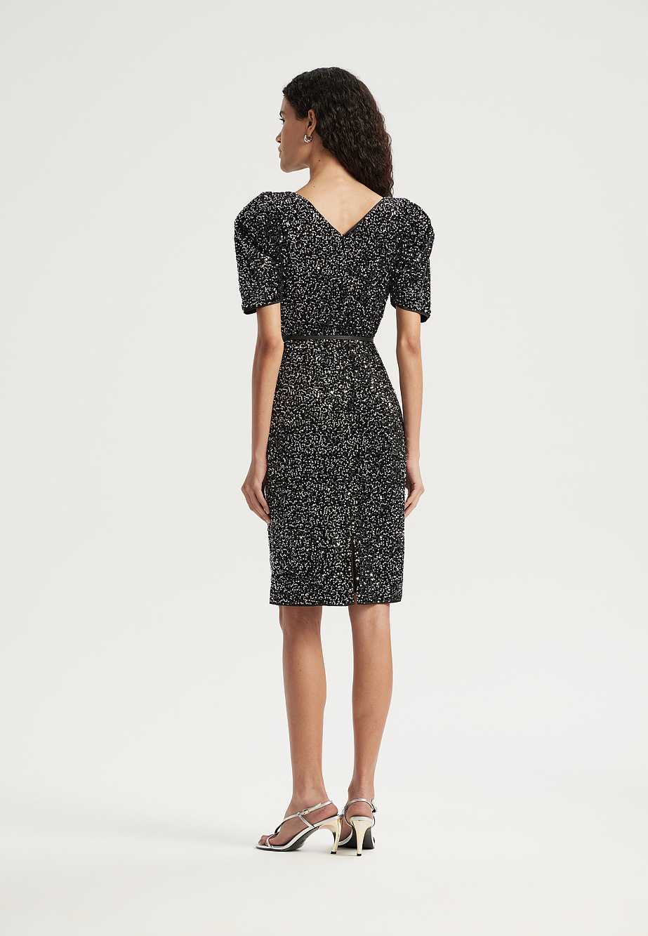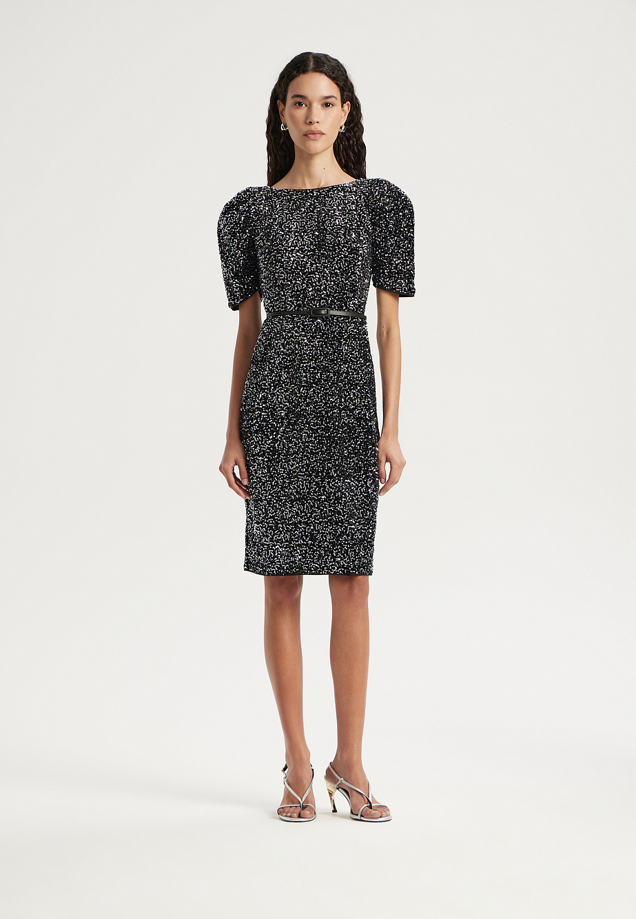 Элегантное платье в стиле диско длиной чуть выше колена и с акцентом на плечах. Сделано из бархата, расшитого пайетками. Модель с эффектными рукавами на защипах и плечевыми накладками создаёт выразительный силуэт. Кожаный ремешок подчеркивает талию. Тонкий сатиновый кант по горловине, эластичная подкладка и обработка внутренних срезов обеспечивают удобство в носке.