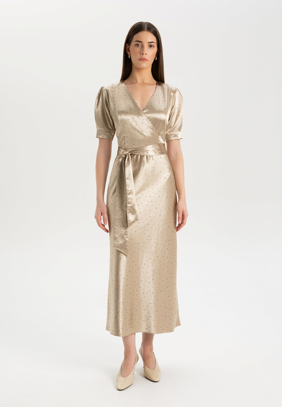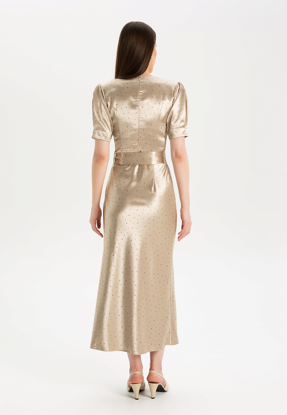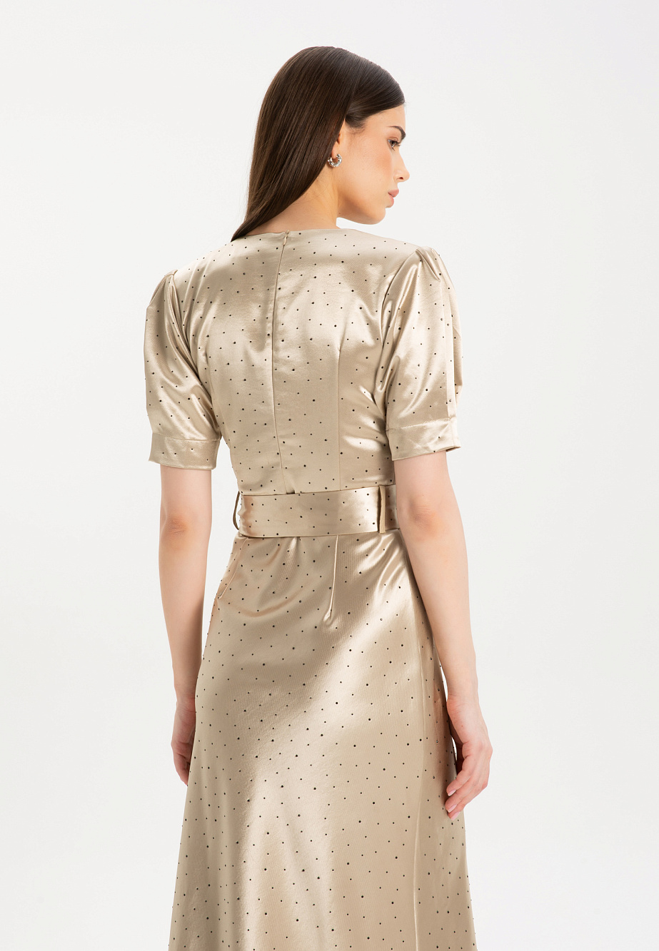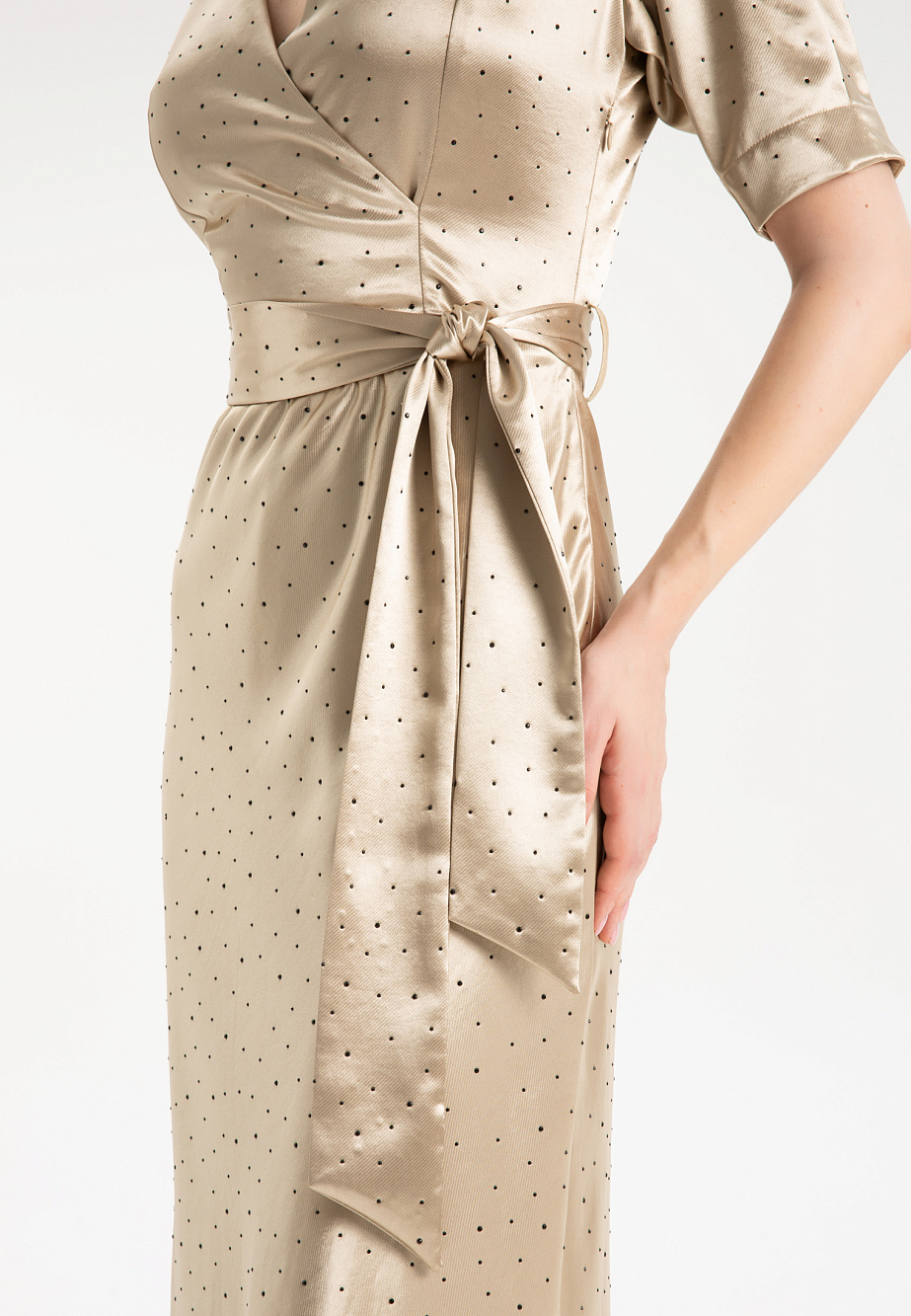 Эффектное платье миди из плотного сатина с диагональным переплетением, декорированное стразами. Модель с акцентными плечами и юбкой, раскроенной по косой, создает динамичный силуэт. Имитация запаха на лифе и рукава со складками подчеркивают сложный крой. Мягкий пояс выделяет талию, а стрейч-подкладка и потайные молнии на спинке и cбоку обеспечивают идеальную посадку и удобство.