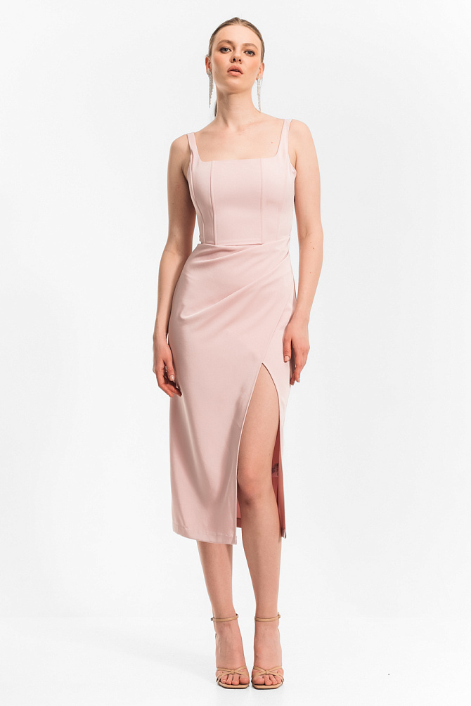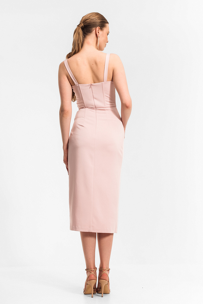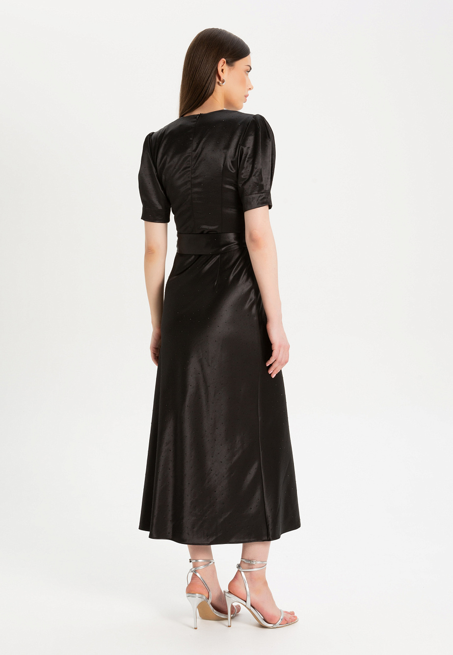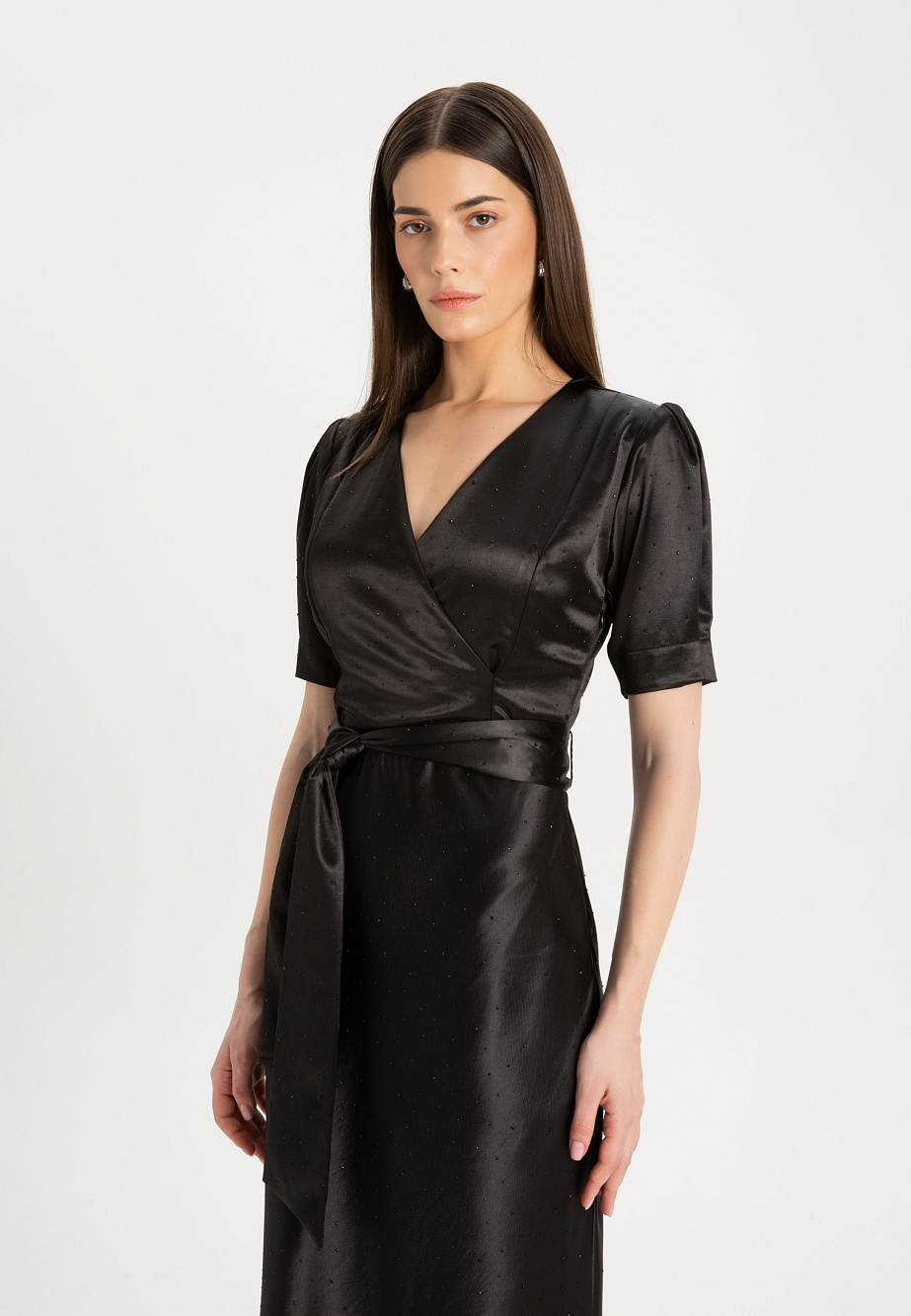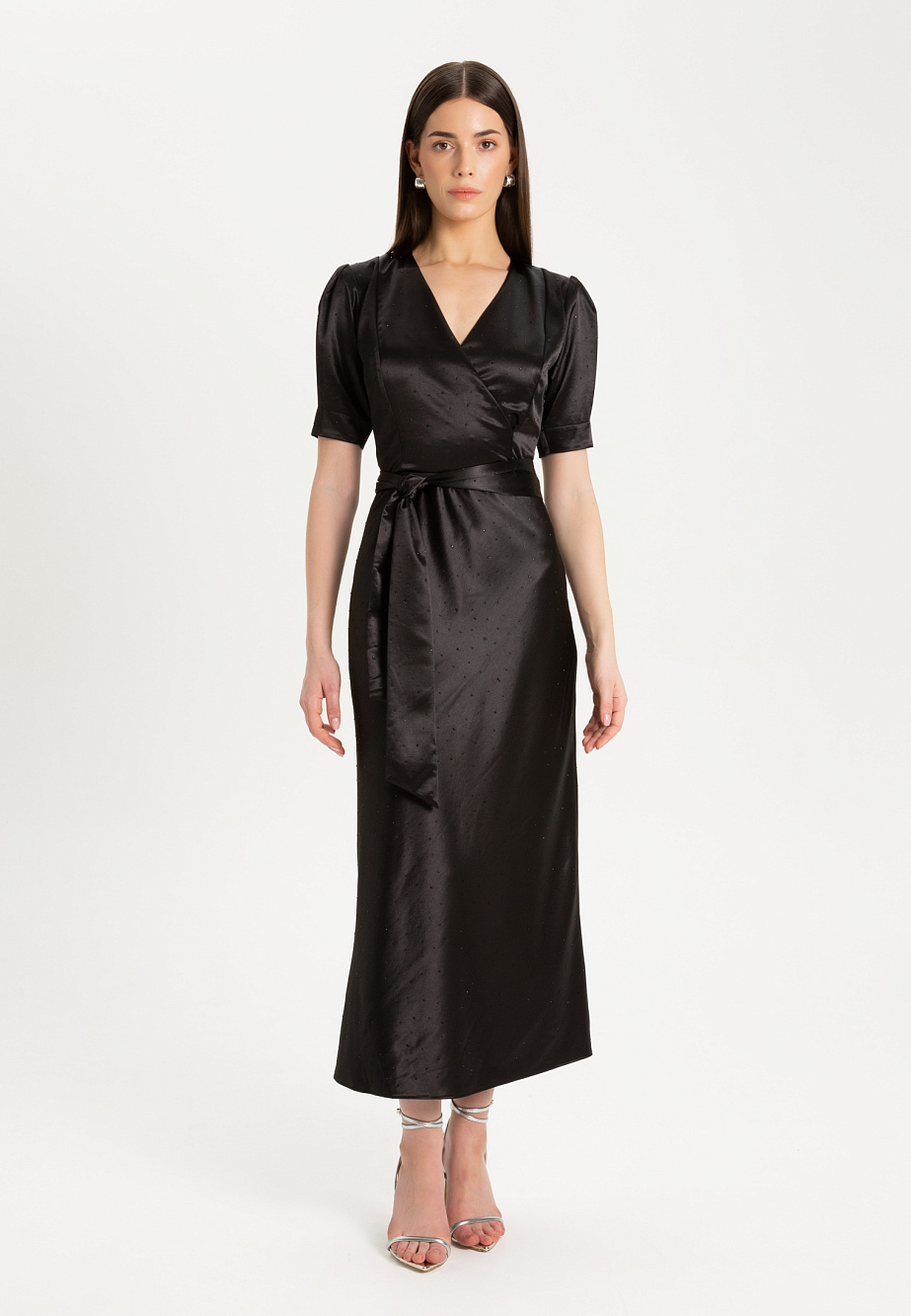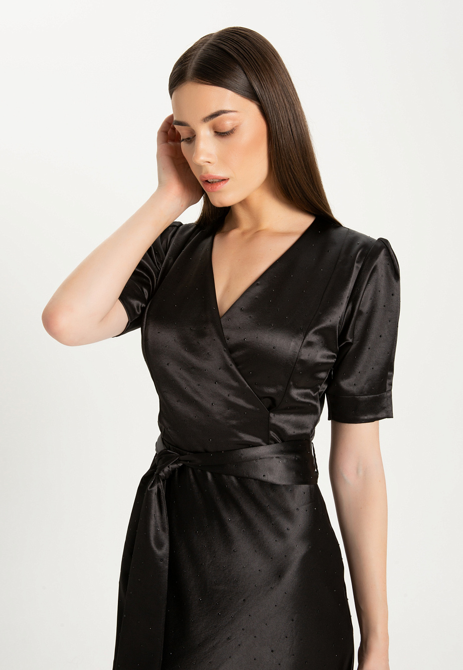 Эффектное платье миди из плотного сатина с диагональным переплетением, декорированное стразами. Модель с акцентными плечами и юбкой, раскроенной по косой, создает динамичный силуэт. Имитация запаха на лифе и рукава со складками подчеркивают сложный крой. Мягкий пояс выделяет талию, а стрейч-подкладка и потайные молнии на спинке и cбоку обеспечивают идеальную посадку и удобство.