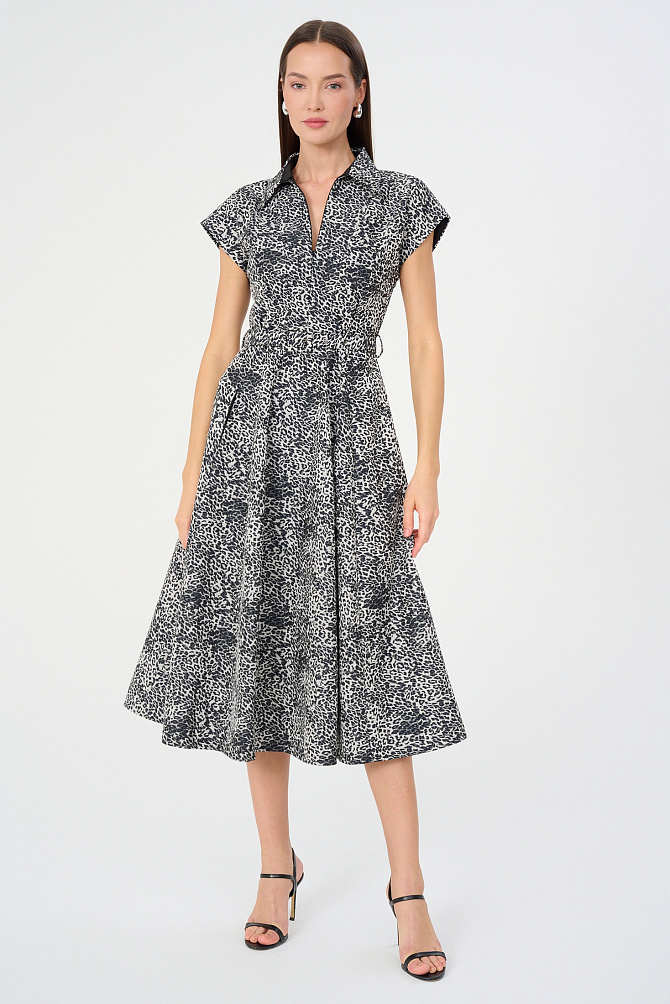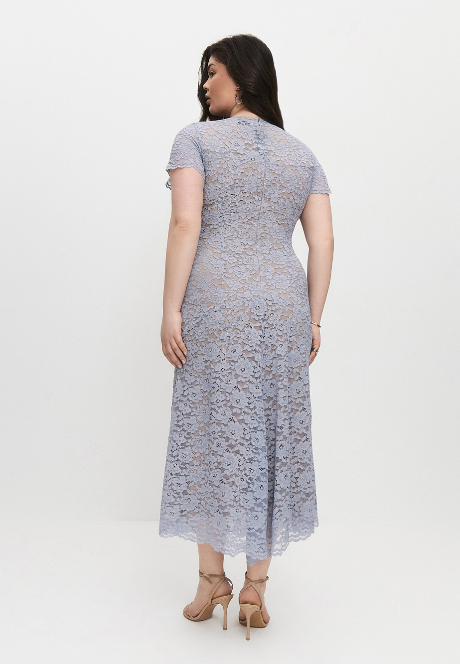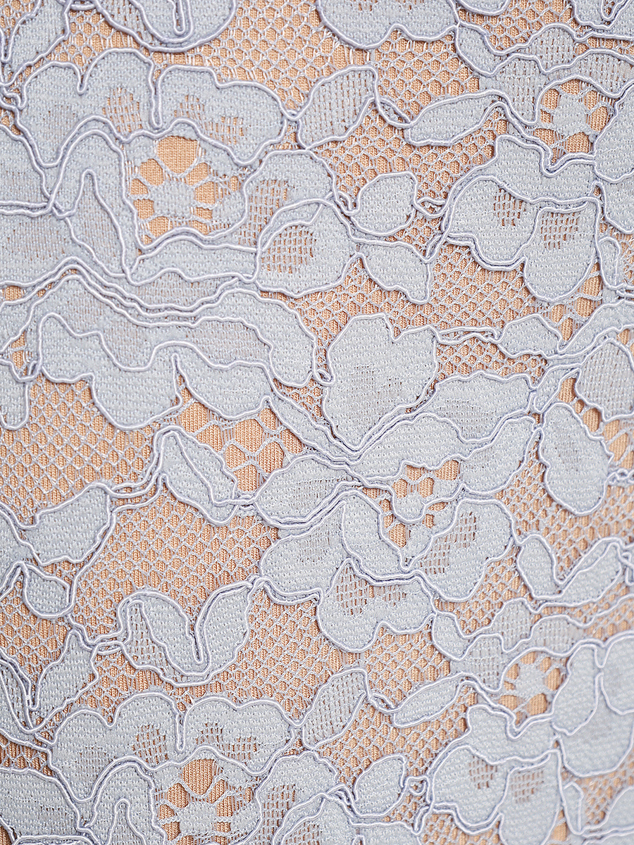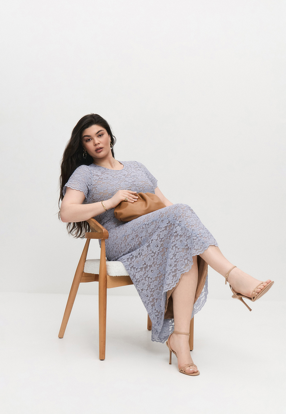 Лаконичное платье из хлопкового фактурного кружева с коротким рукавом и расклешенным книзу силуэтом. Рукава и низ платья заканчиваются изящными фестонами кружева. Фигурный подрез по низу платья позволяет добиться равномерного и красивого расклешения в мягкие изящные фалды. Платье с трикотажной подкладкой из района.