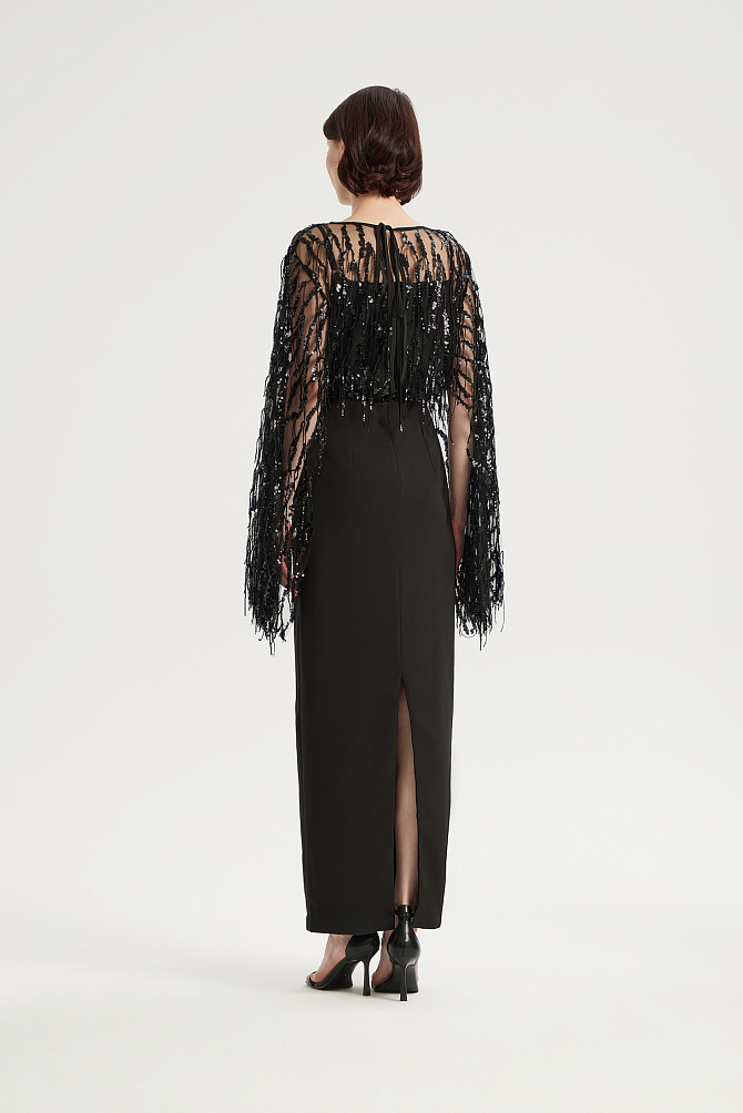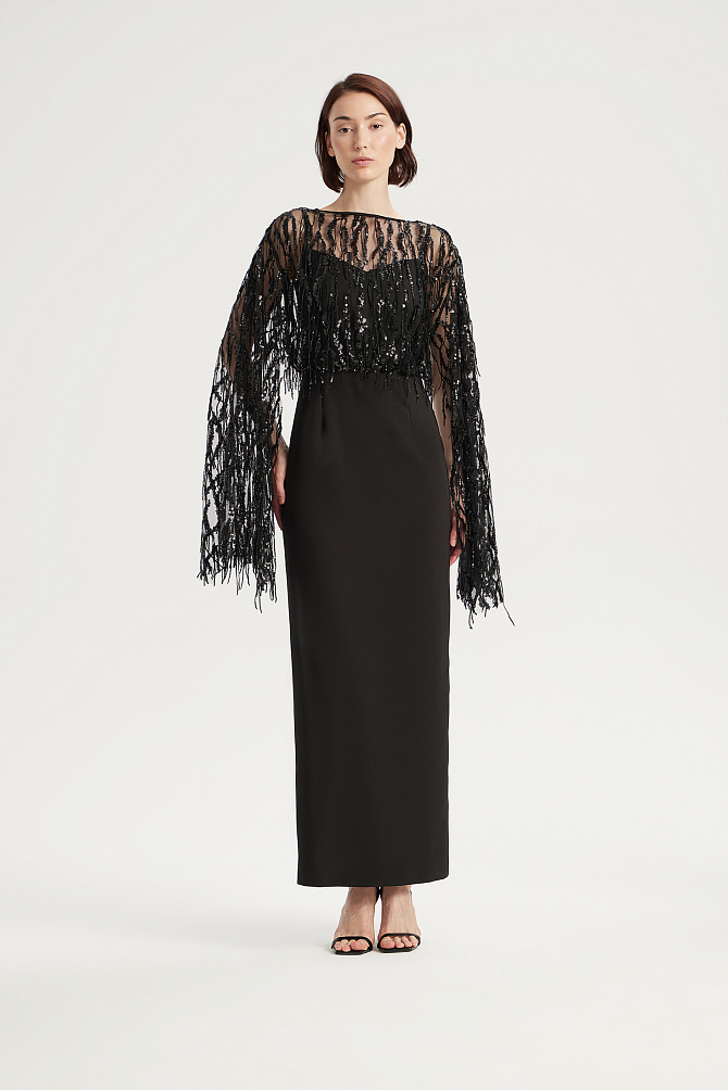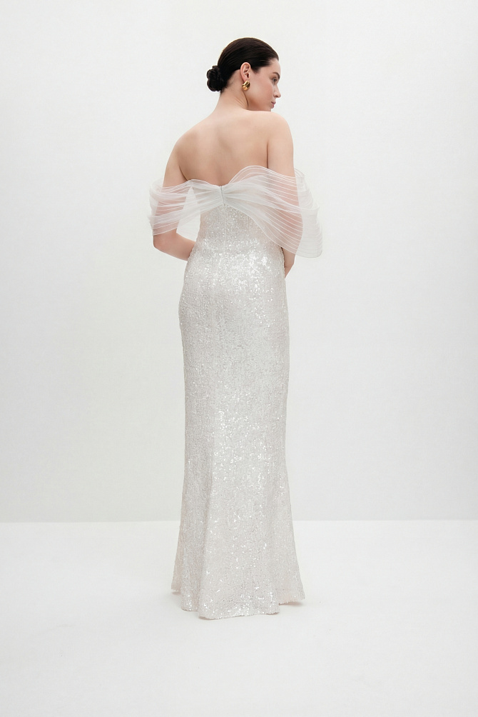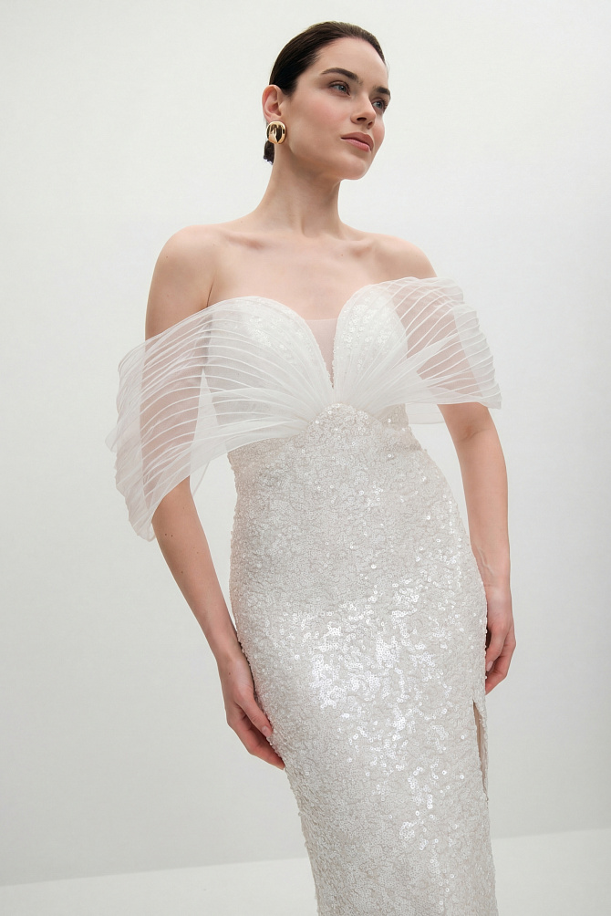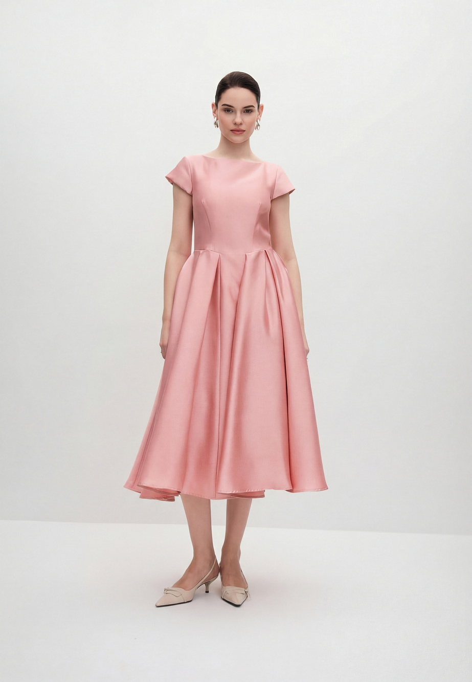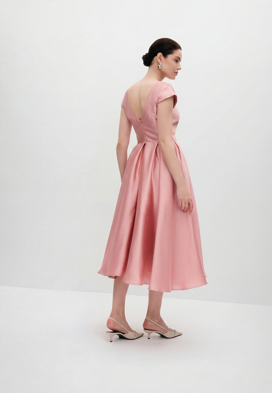 Платье в стиле Диор из формоустойчивой ткани с эффектом тафты. Фигурный вырез-спереди лодочка,сзади V-образный, короткий рукав, характерная для этого стиля отрезная линия талии и роскошная расклешенная юбка,заложенная в глубокие бантовые складки. Комфорт и удобство достигается с помощью мягких чашечек на лифе, подкладкой из района и карманов в боковых швах. Платье застегивается с помощью потайной молнии в среднем шве спинки. Длина от линии талии 83см.