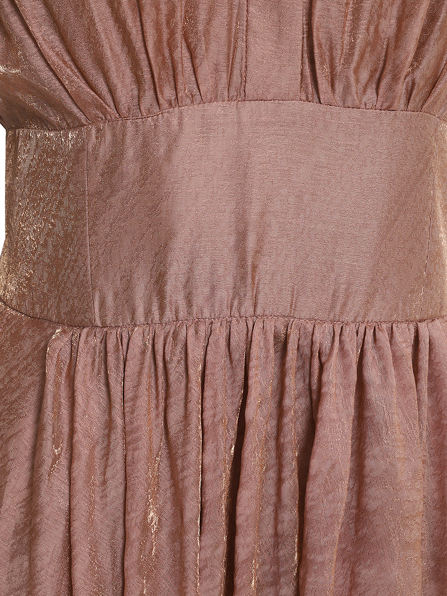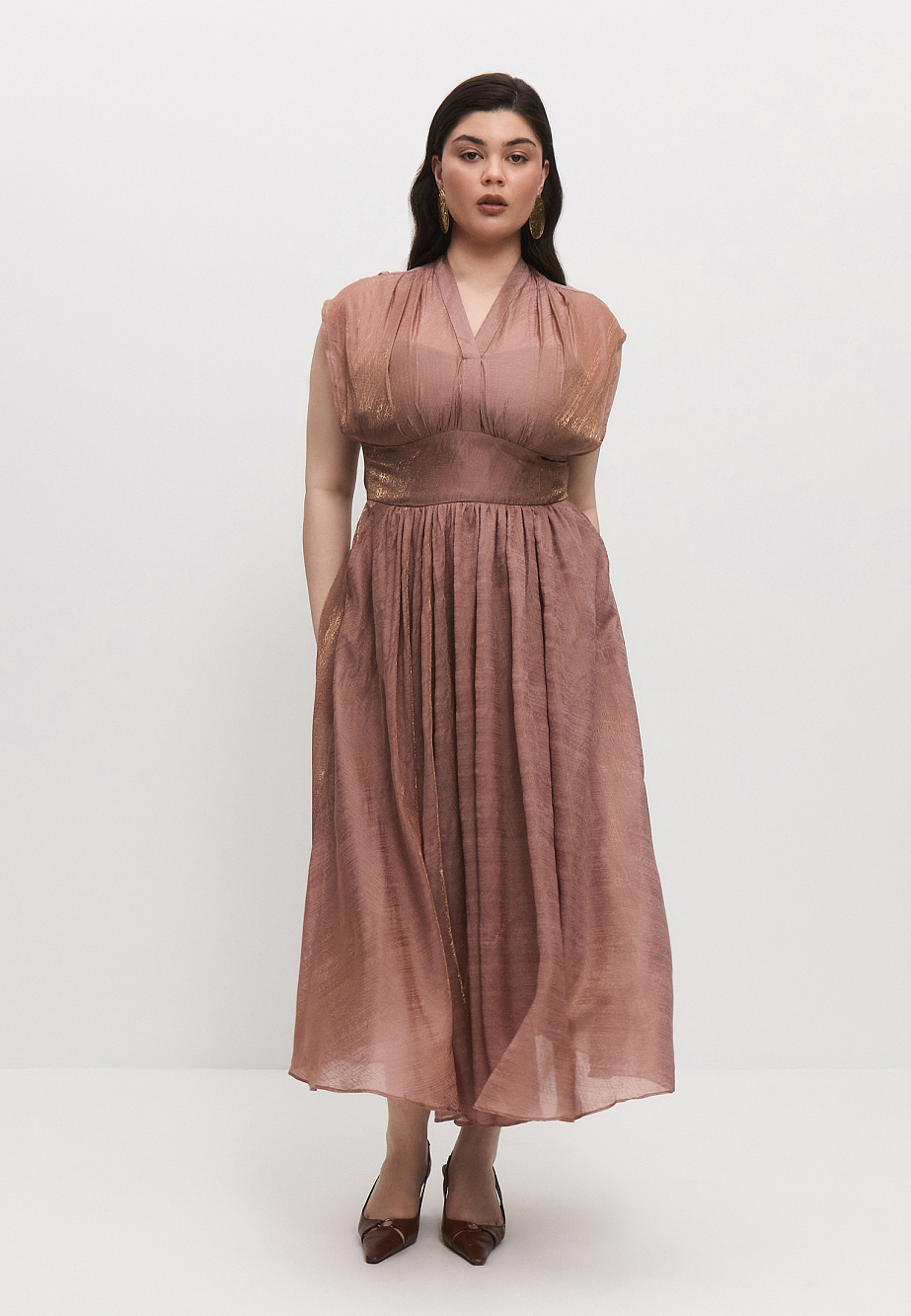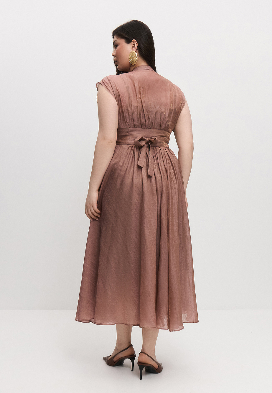 Платье из мягкой сияющей ткани с высоким содержанием тенселя, с акцентным широким поясом, расклешенной, собранной на талии юбкой и удобными карманами.Верх платья с мягкими сборками на плечах и под грудью создают выразительный объем в верхней части. Глубокая пройма и слегка расширенная линия плеч позволяют чуть прикрыть руки. Благодаря легкости ткани и мерцающему блеску, платье смотрится воздушно,женственно и универсально по назначению. Длина юбки от талии 88см.