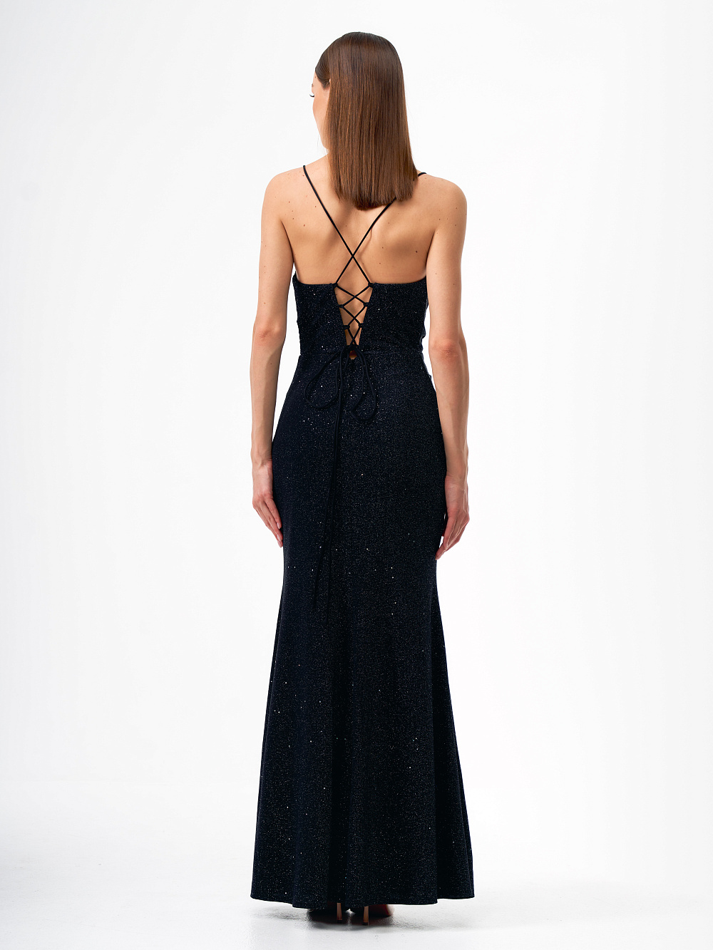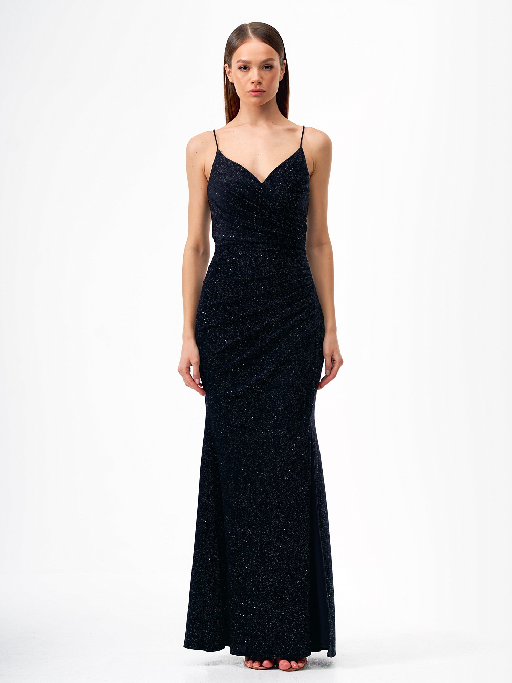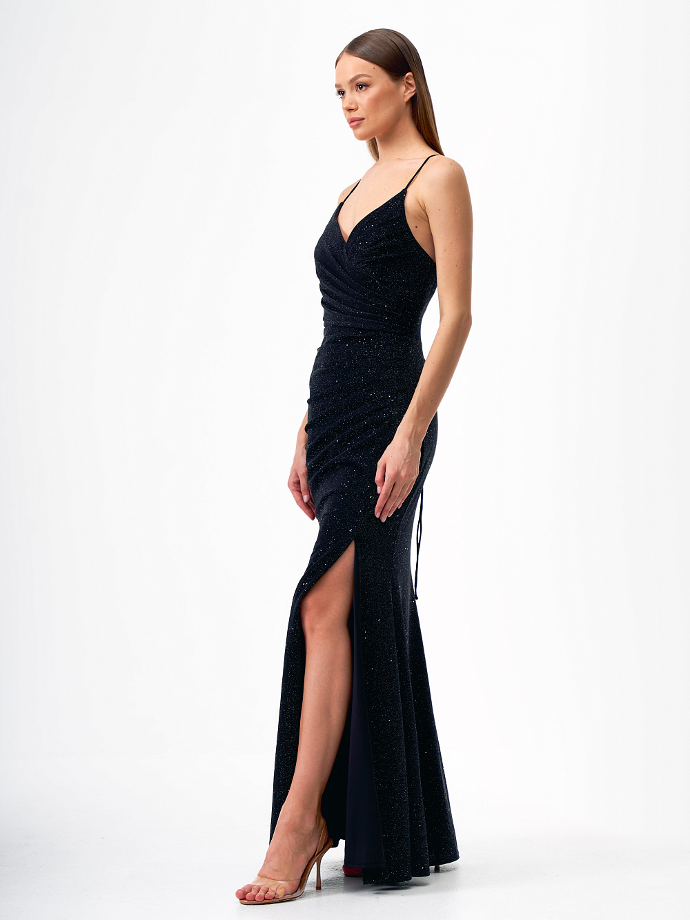 Эффектное коктейльное платье из мягкого мерцающего трикотажа с щедрой драпировкой по талии и бедрам. Конструкция платья со встроенными чашечками и бретелями, переходящими в шнуровку по спинке идеально корректирует фигуру и доводит женские пропорции до совершенства, создавая удивительно притягательный и элегантный образ. Длина макси и выразительный разрез по ноге актуальны как никогда и выигрышно смотрятся для создания вечернего аутфита.