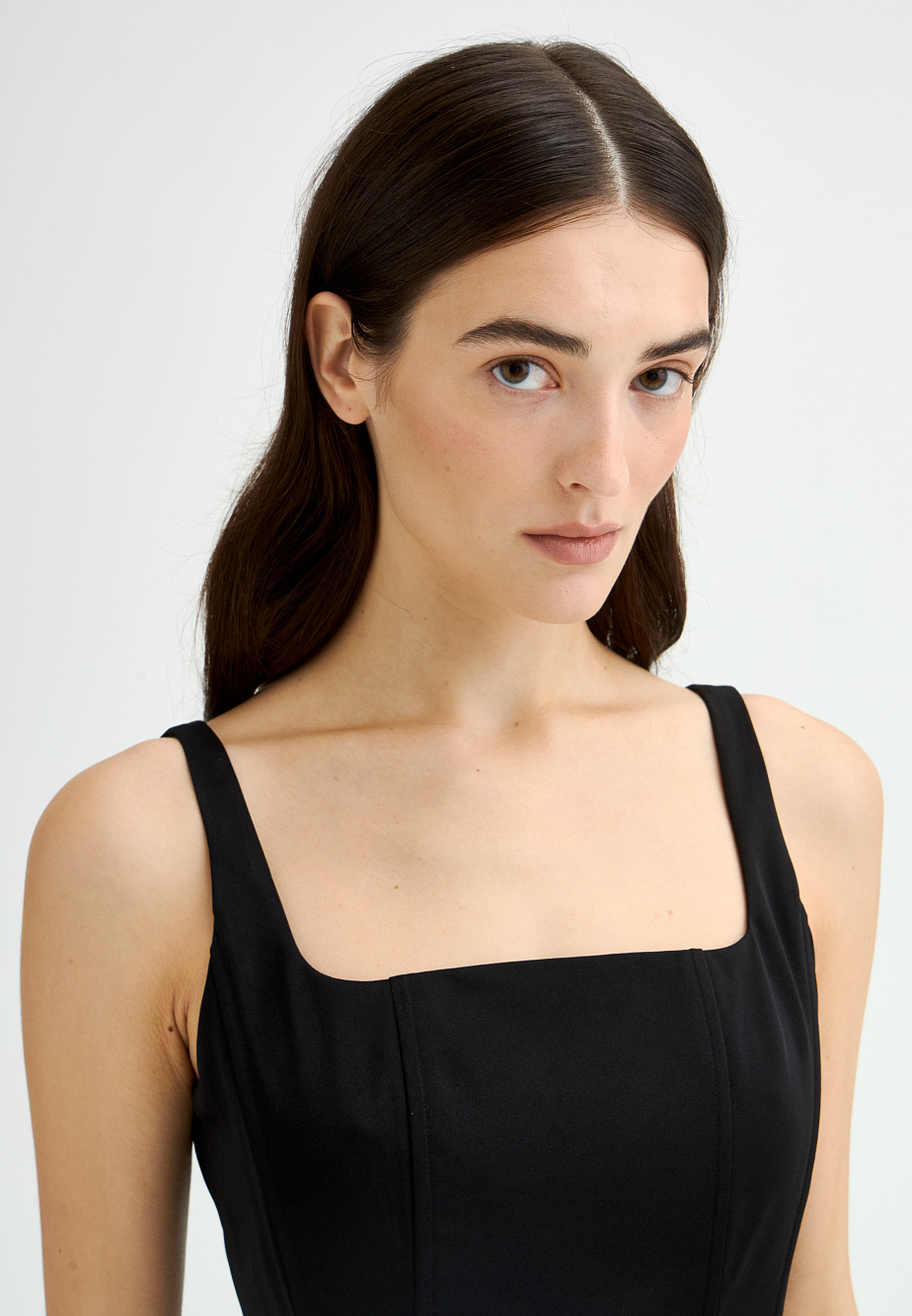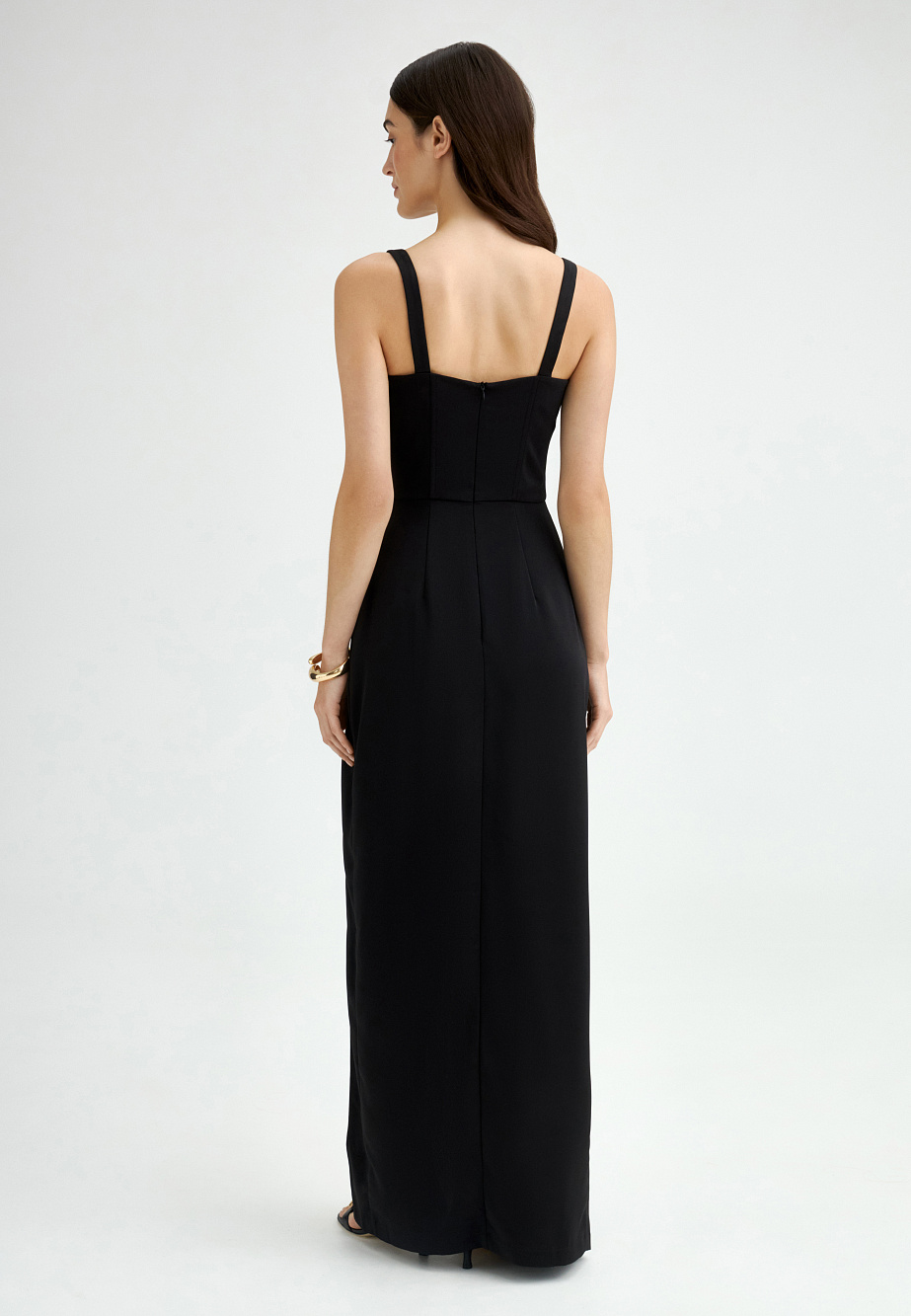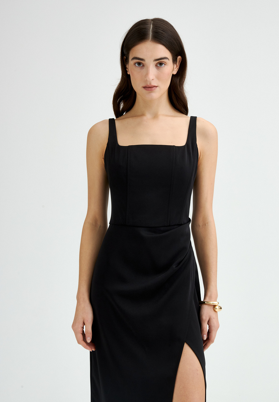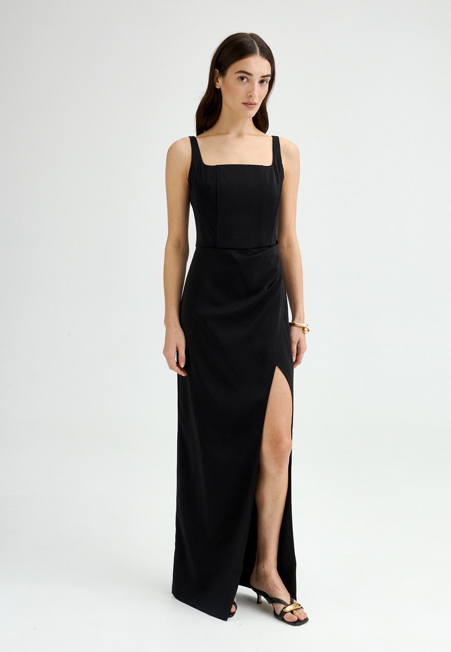 Платье из стрейч-сатина с корсетом и юбкой актуальной и востребованной длины макси достойно самого эффектного выхода в свет, и сделает ваш образ самым стильным и незабываемым. Продуманная конструкция корсета с регилином в рельефах, юбка с асимметричными защипами и высоким разрезом по ноге повышают градус торжественности, делая силуэт выше и создавая необычайно стильный, лаконичный и востребованный образ. Качественное исполнение, плотная комфортная ткань, выверенные пропорции подчеркивают все достоинства своей обладательницы. Запас по длине бретелей позволяет найти комфортное положение для нужной посадки по фигуре.