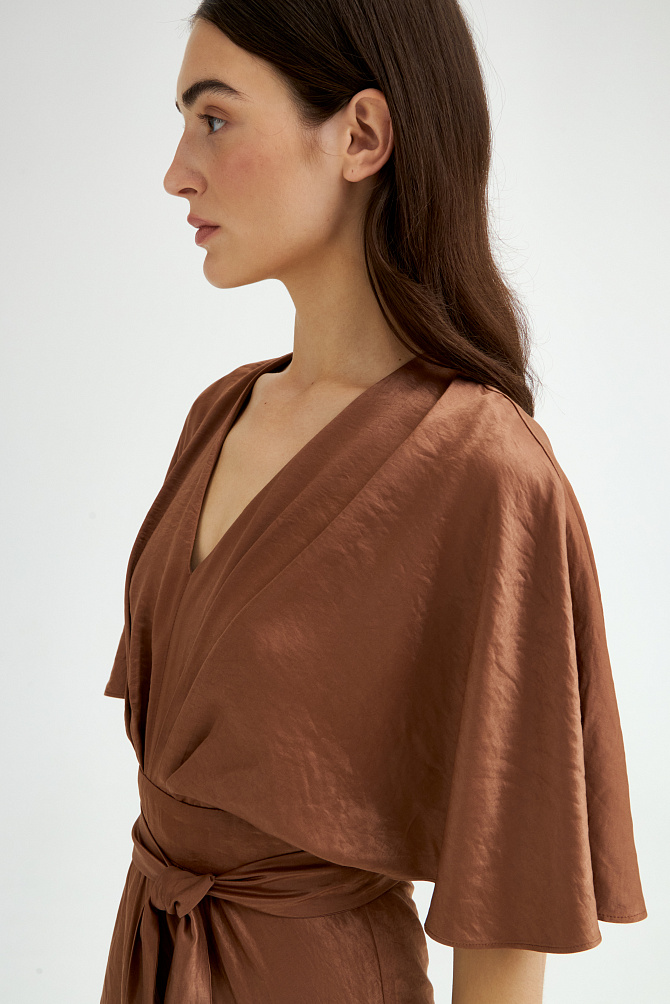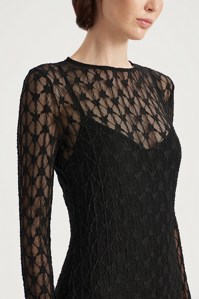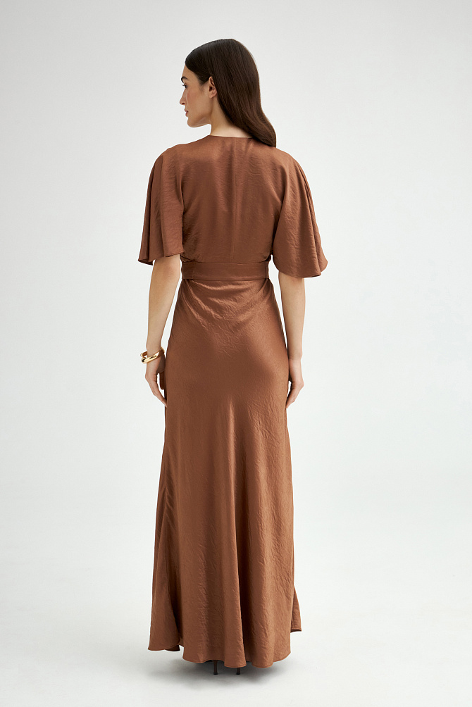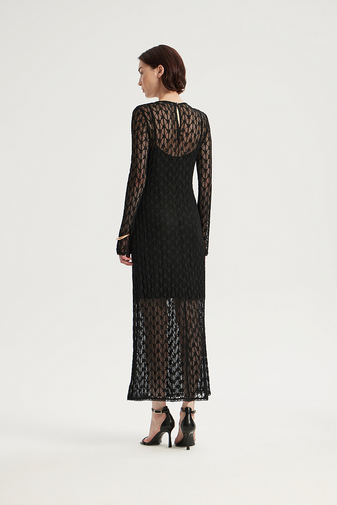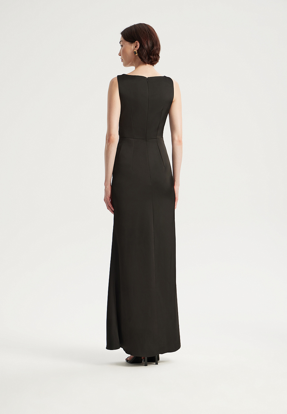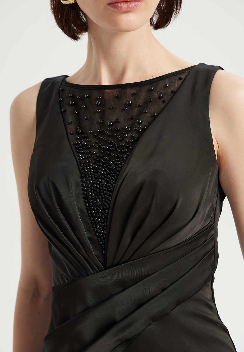 Элегантное длинное платье из сатина создает выразительный образ благодаря контрасту плотной ткани и ажурной сетки с бусинами. Облегающий силуэт с асимметричной драпировкой на талии и фигурными подрезами. Глубокое декольте и разрез по переду юбки подчеркиваются вставками из сетки, декорированными бусинами. Расклешенный низ юбки, потайная молния на спинке и мягкие чашки обеспечивают идеальную посадку и удобство в носке.
