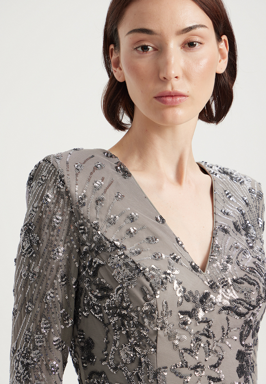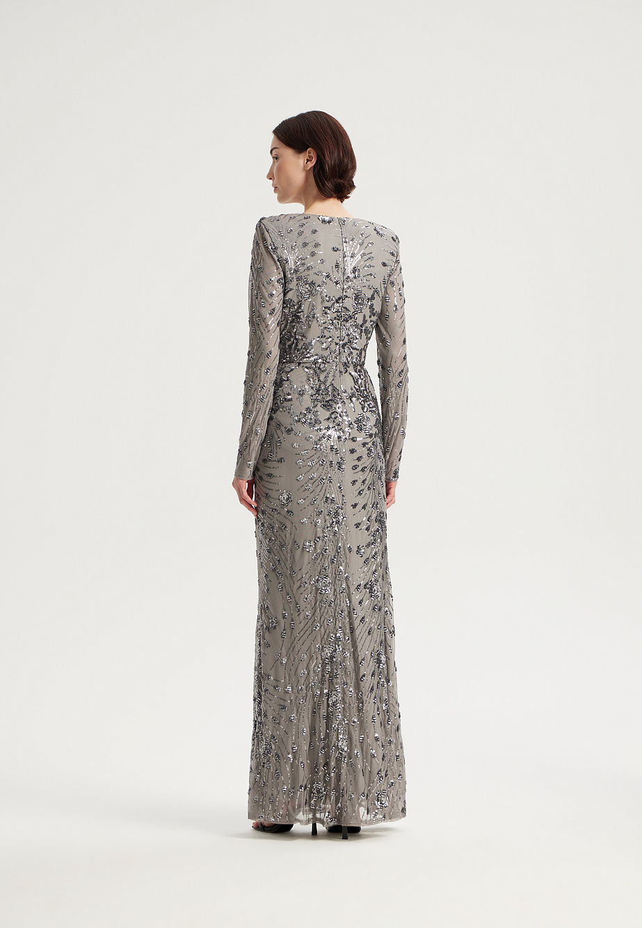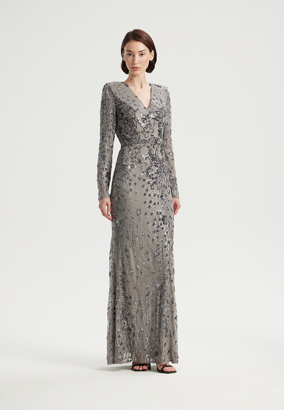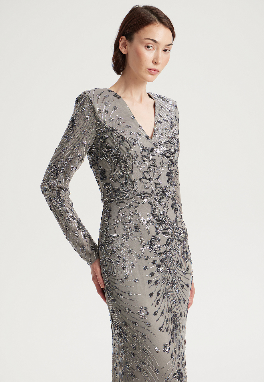 Элегантное вечернее платье-макси из ажурной сетки, богато украшенной вышивкой пайетками. Модель с V-образным вырезом горловины и длинными расклешенными рукавами с акцентом на плечи благодаря мягким накладкам. Юбка платья мягко расклешена к низу, создавая динамичный силуэт. Для удобства в носке все внутренние срезы обработаны, горловина дополнена мягким кантом, а потайная молния на спинке обеспечивает идеальную посадку. Платье на подкладке.