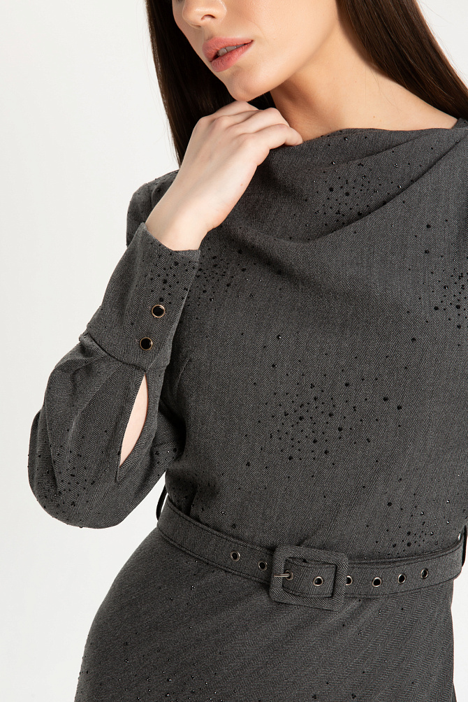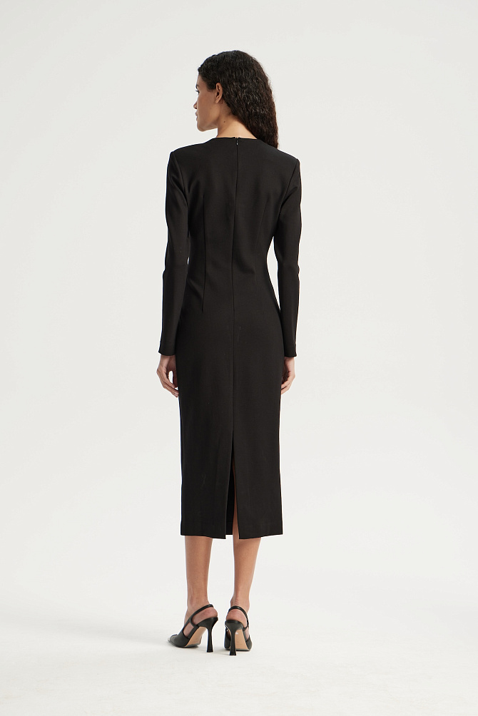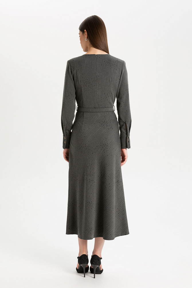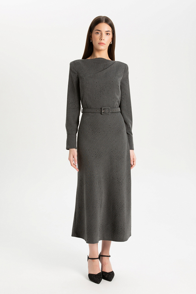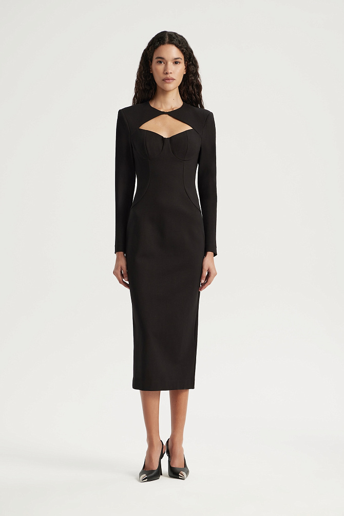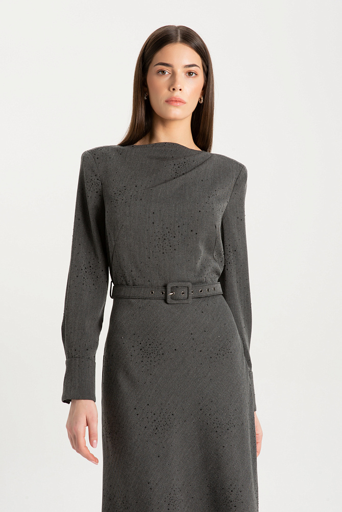 Элегантное вечернее платье-макси из ажурной сетки, богато украшенной вышивкой пайетками. Модель с V-образным вырезом горловины и длинными расклешенными рукавами с акцентом на плечи благодаря мягким накладкам. Юбка платья мягко расклешена к низу, создавая динамичный силуэт. Для удобства в носке все внутренние срезы обработаны, горловина дополнена мягким кантом, а потайная молния на спинке обеспечивает идеальную посадку. Платье на подкладке.