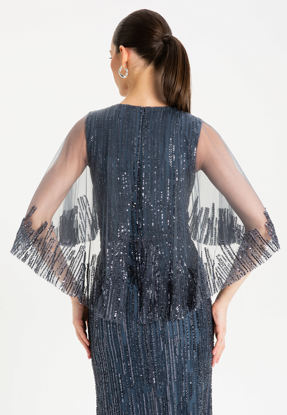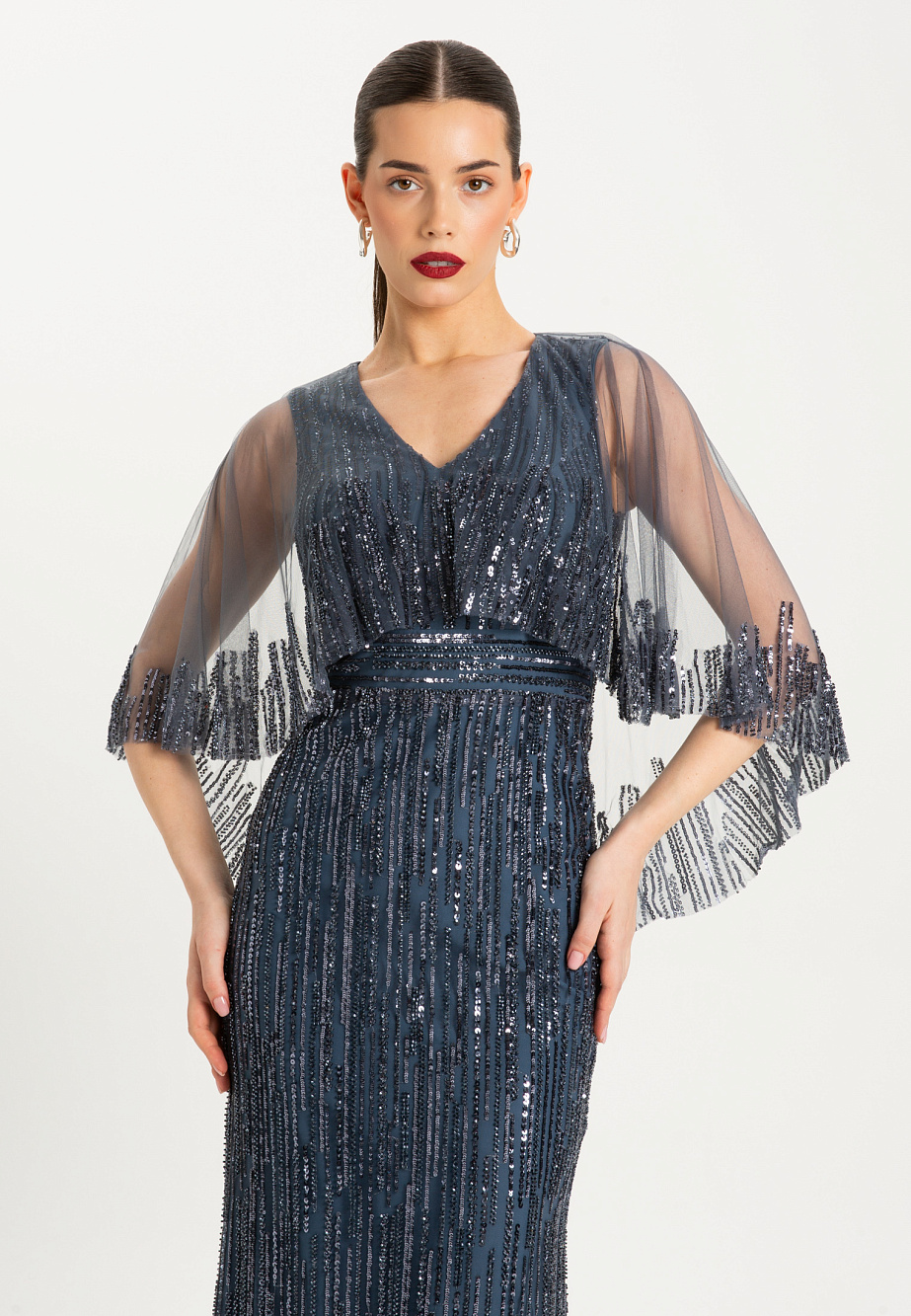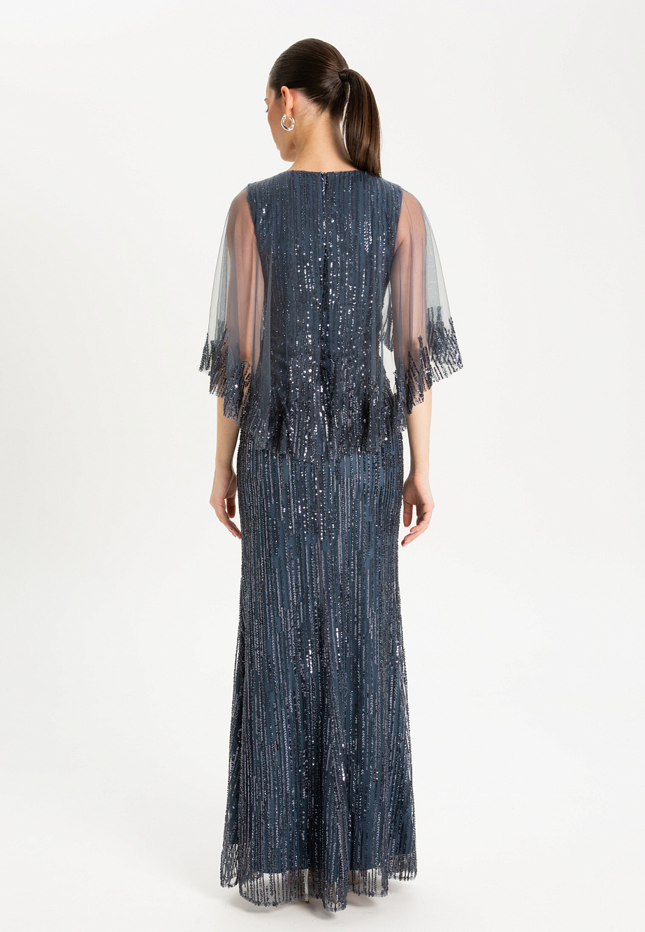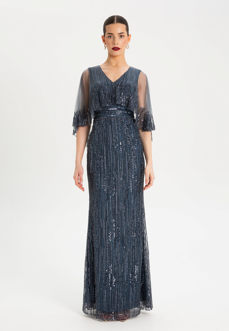 Струящееся вечернее платье макси, украшенное изысканной вышивкой из бисера и пайеток, словно уносит нас в эпоху ар-деко и золотого века Голливуда. Модель с драгоценной фактурой в двух благородных оттенках подчеркивает фигуру благодаря встроенным мягким чашкам и выверенным пропорциям. Ручной крой и тонкая работа с деликатной тканью создают вневременной образ утонченной роскоши.