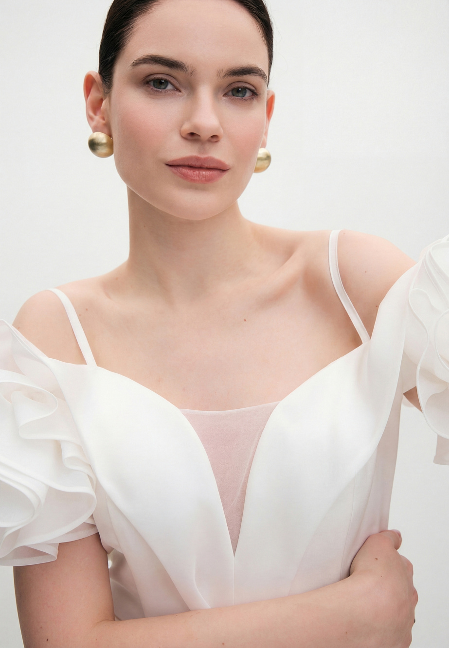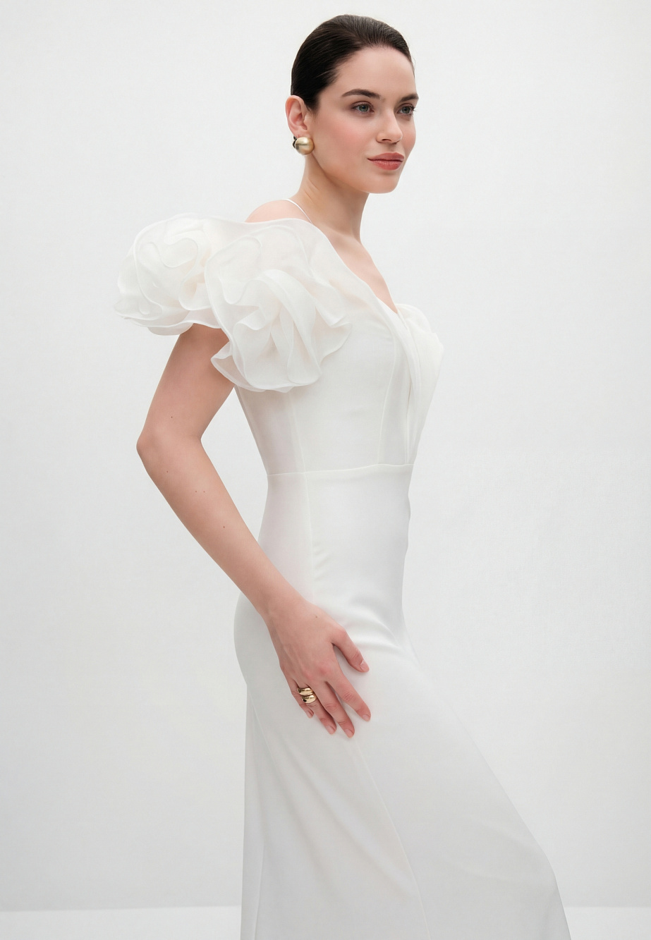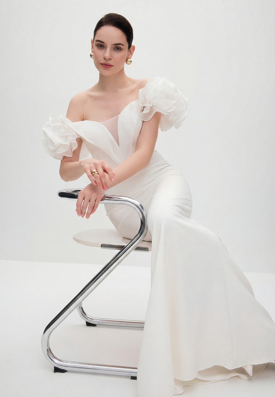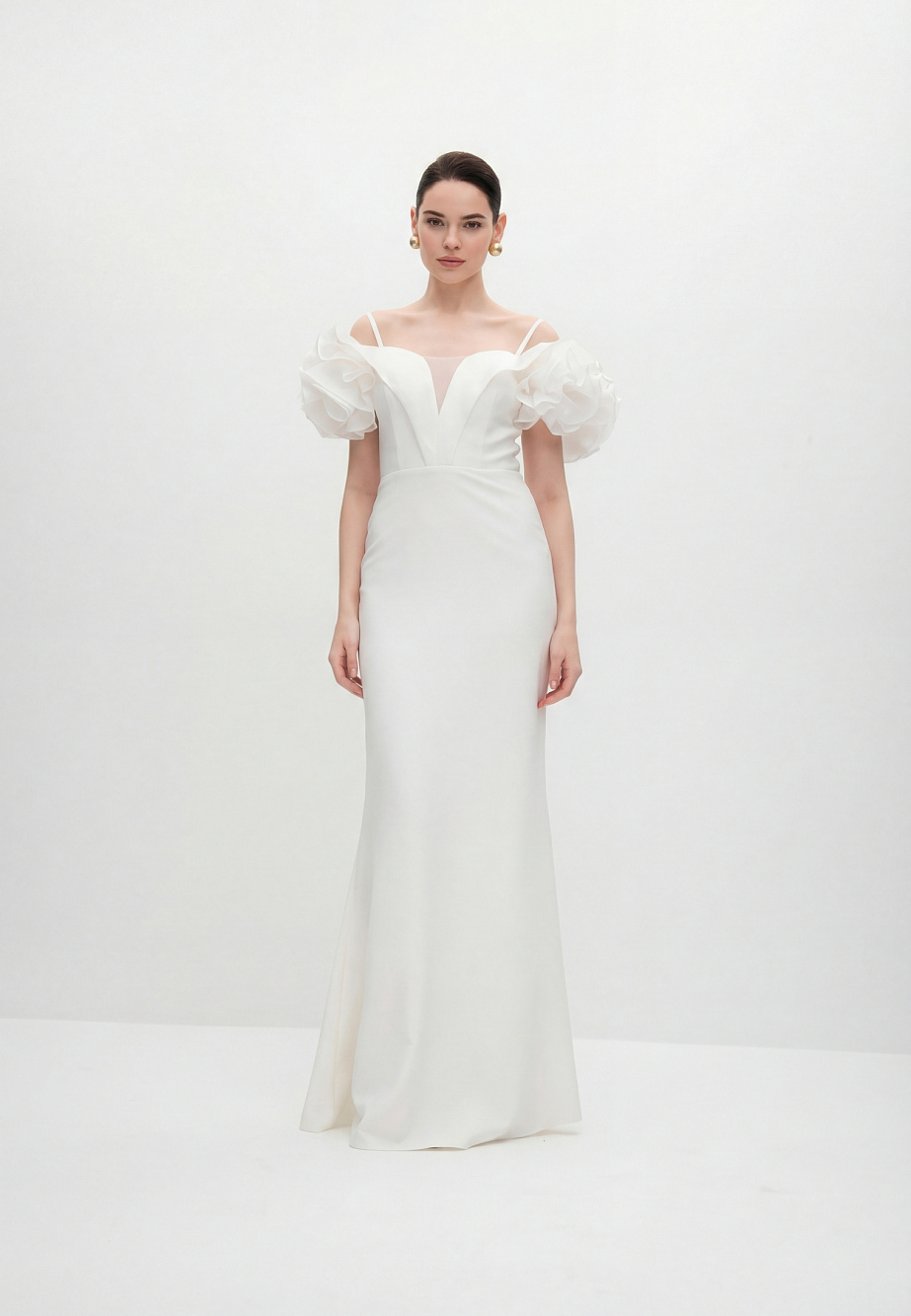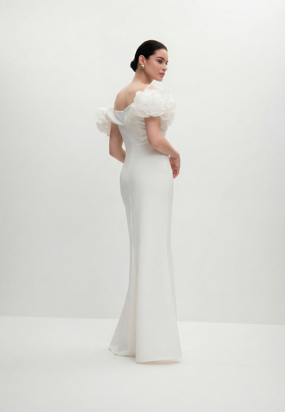 Роскошное вечернее платье длиной макси,приталенного кроя, повторяющего силуэт фигуры. В модели продумано все до мелочей так, чтобы платье создавало wow-эффект и при этом было легкое и комфортное. Платье корсетного типа, конструкция учитывает его носку без белья, в лифе есть встроенные чашечки и вставленный в рельефы регилин для уверенной фиксации. Модель ассоциируется с цветком - отвороты по V-образному вырезу в виде листьев и цветы, выполненные из плотной органзы эффектно прикрывают плечи, что придает шарм и женственность и созвучно с ДНК бренда.