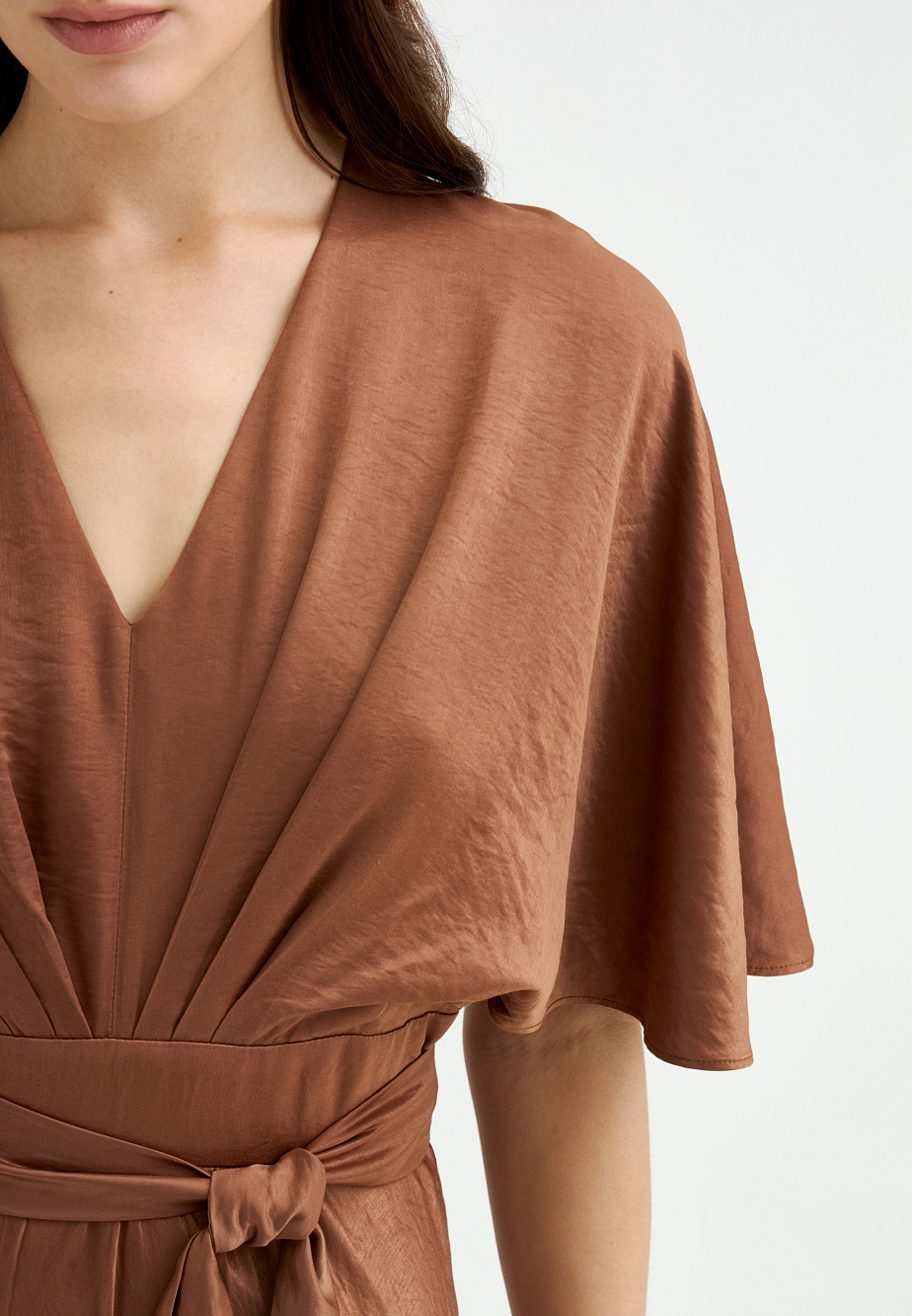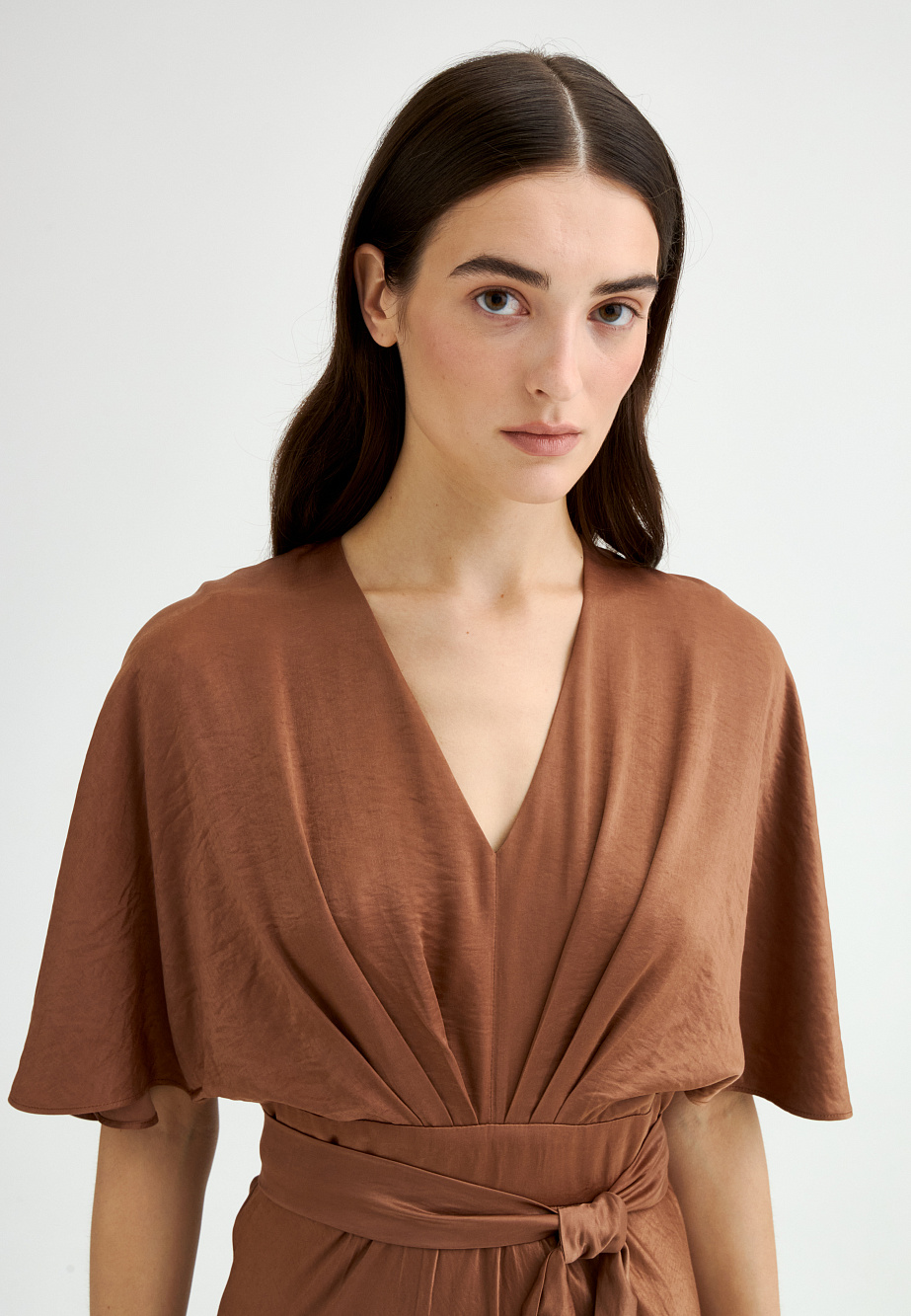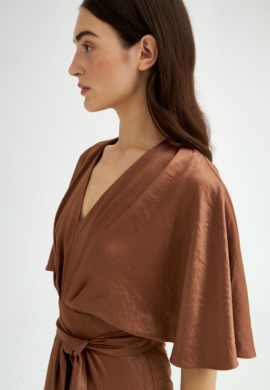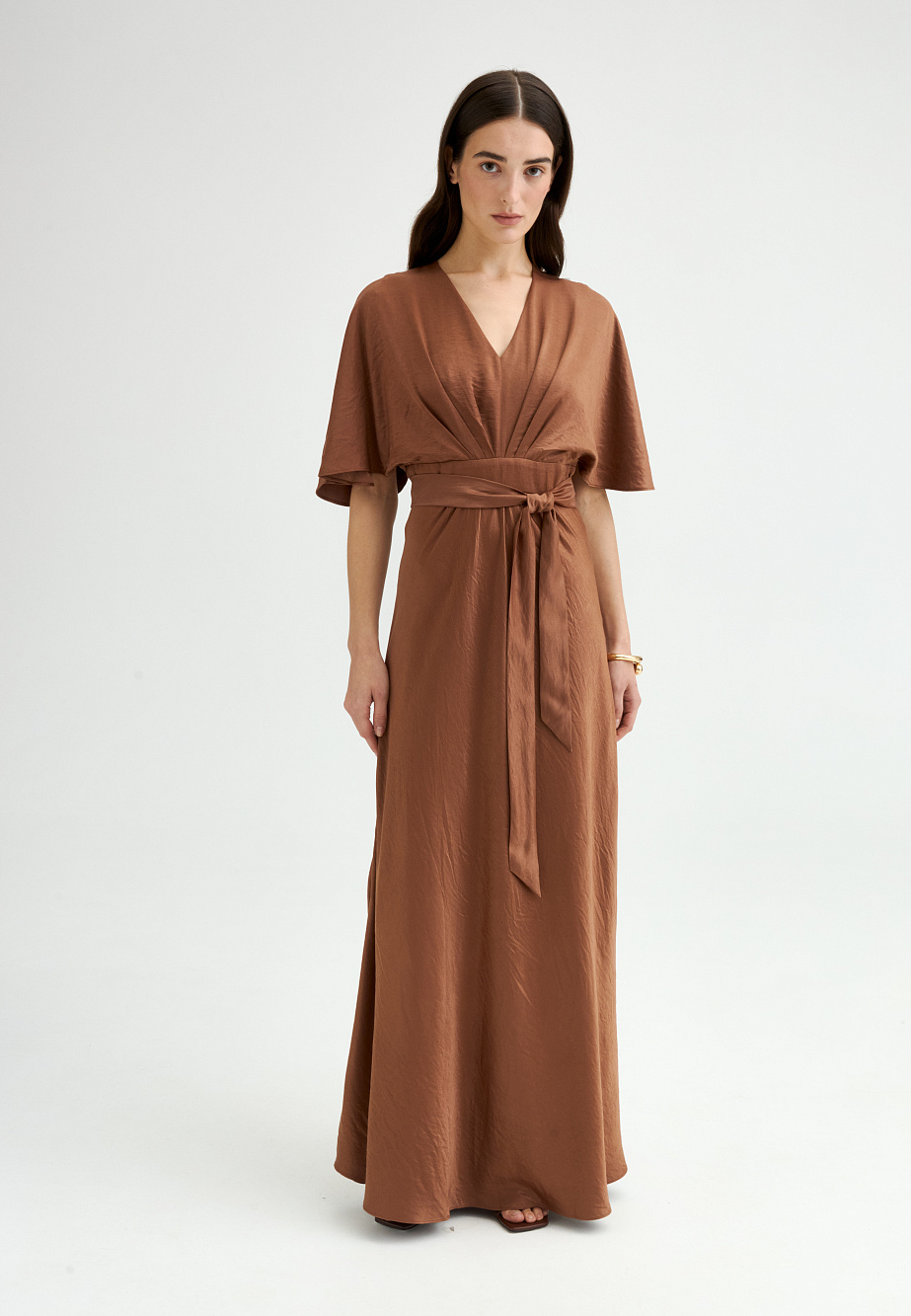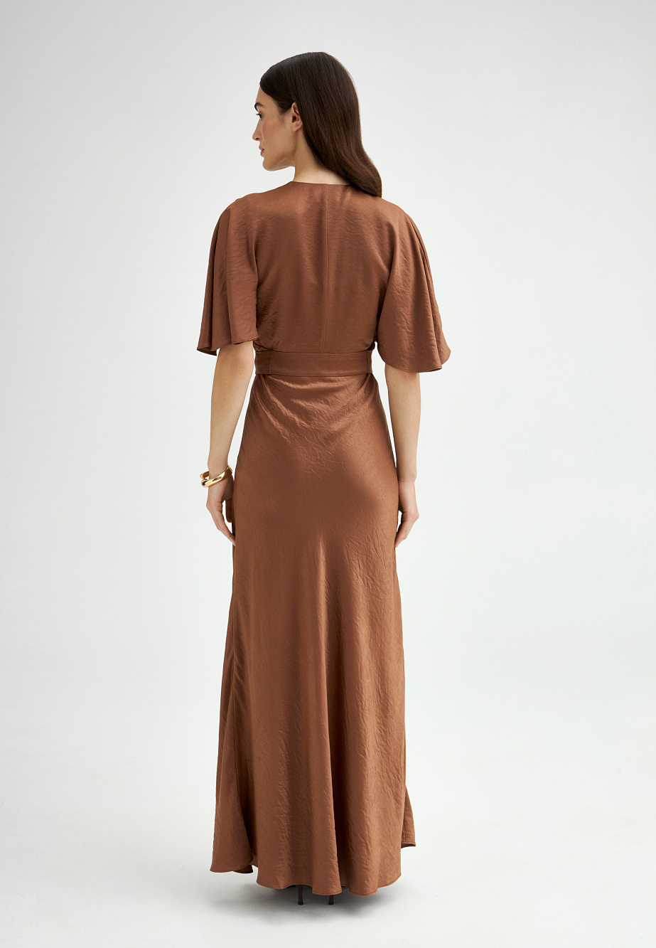 Женственное и элегантное платье длиной макси из струящейся ткани с районом станет идеальным вариантом для вашего праздника и светского раута. Матовый блеск шелка, а также его крэш-эффект облегчает уход и делает образ более современным, избавляя от излишнего пафоса, но сохраняя градус нарядности и торжественности. Дизайнер предлагает его в двух интересных оттенках- медном и универсальном оттенке перламутра. Свободный рукав-пелерина, складки на лифе,заложенные веером, пояс, регулирующийся завязками и юбка, скроенная по косой идеально подстроятся под особенности своей обладательницы.