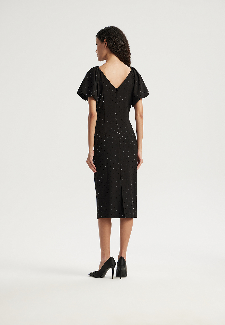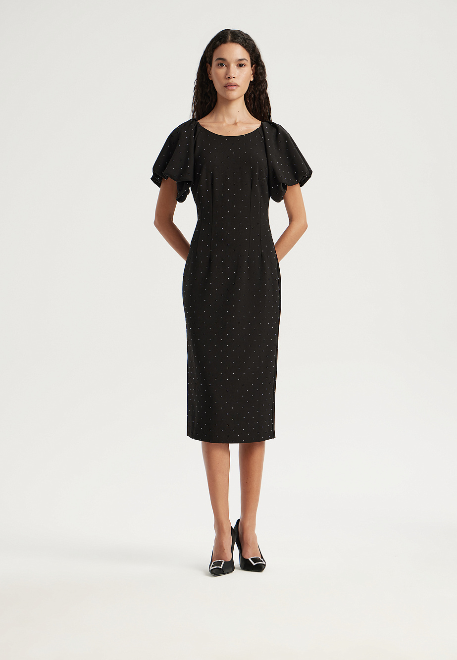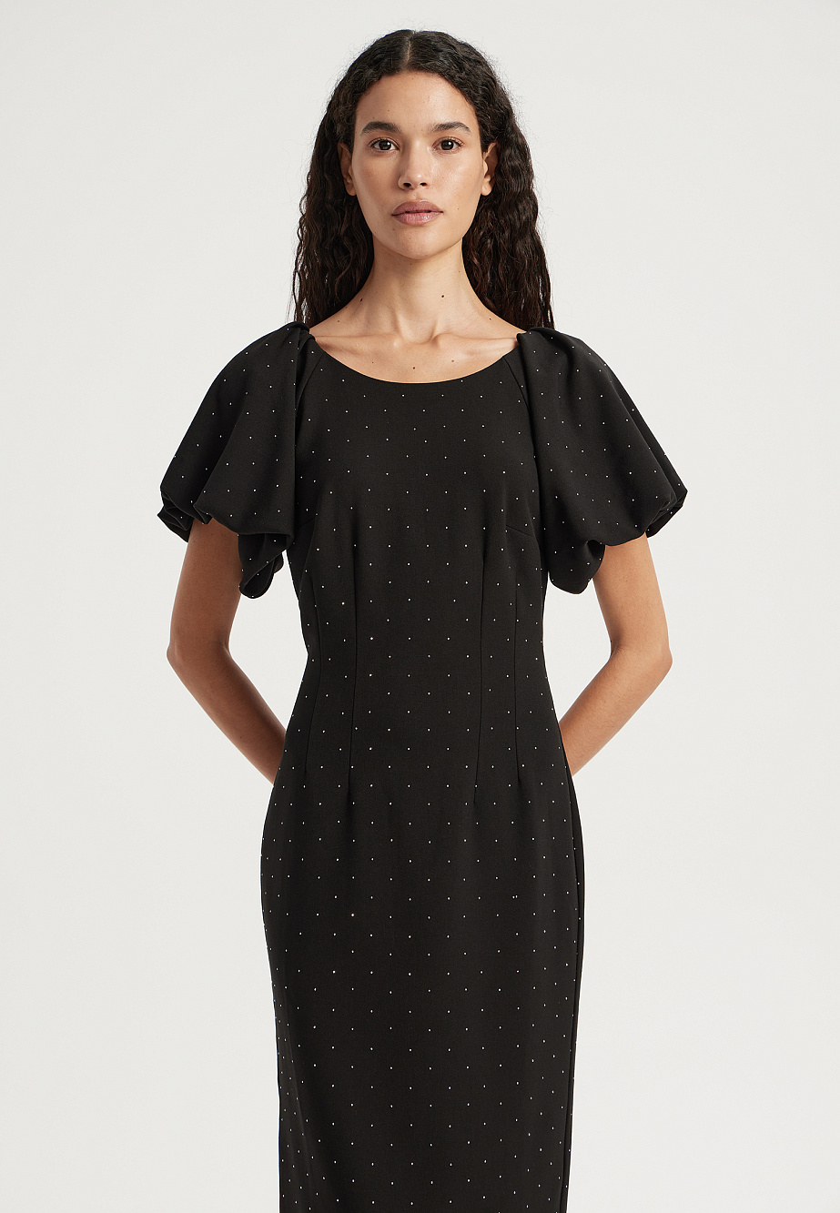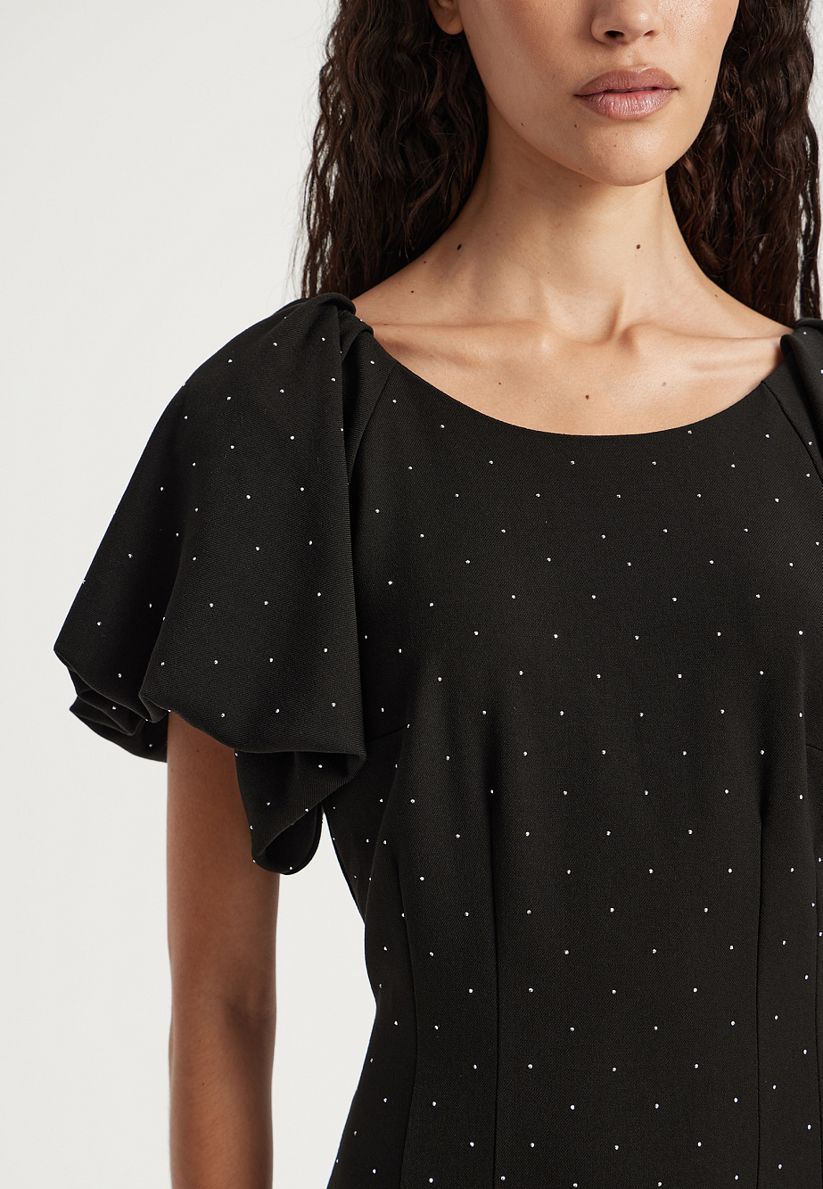 Платье - футляр из формоустойчивой ткани с содержанием хлопка и украшенное россыпью страз, прекрасно подойдет для торжественных выходов и особых случаев. Стразы -модный сверкающий элемент, который активно читается в модных трендах, как в одежде, так и в аксессуарах и помогает любой образ сделать блистательным. Объемные рукава, заложенные в щедрые складки украшают классический стиль и лаконичный крой этого платья, а вырез-лодочкой пикантно открывает ключицы и