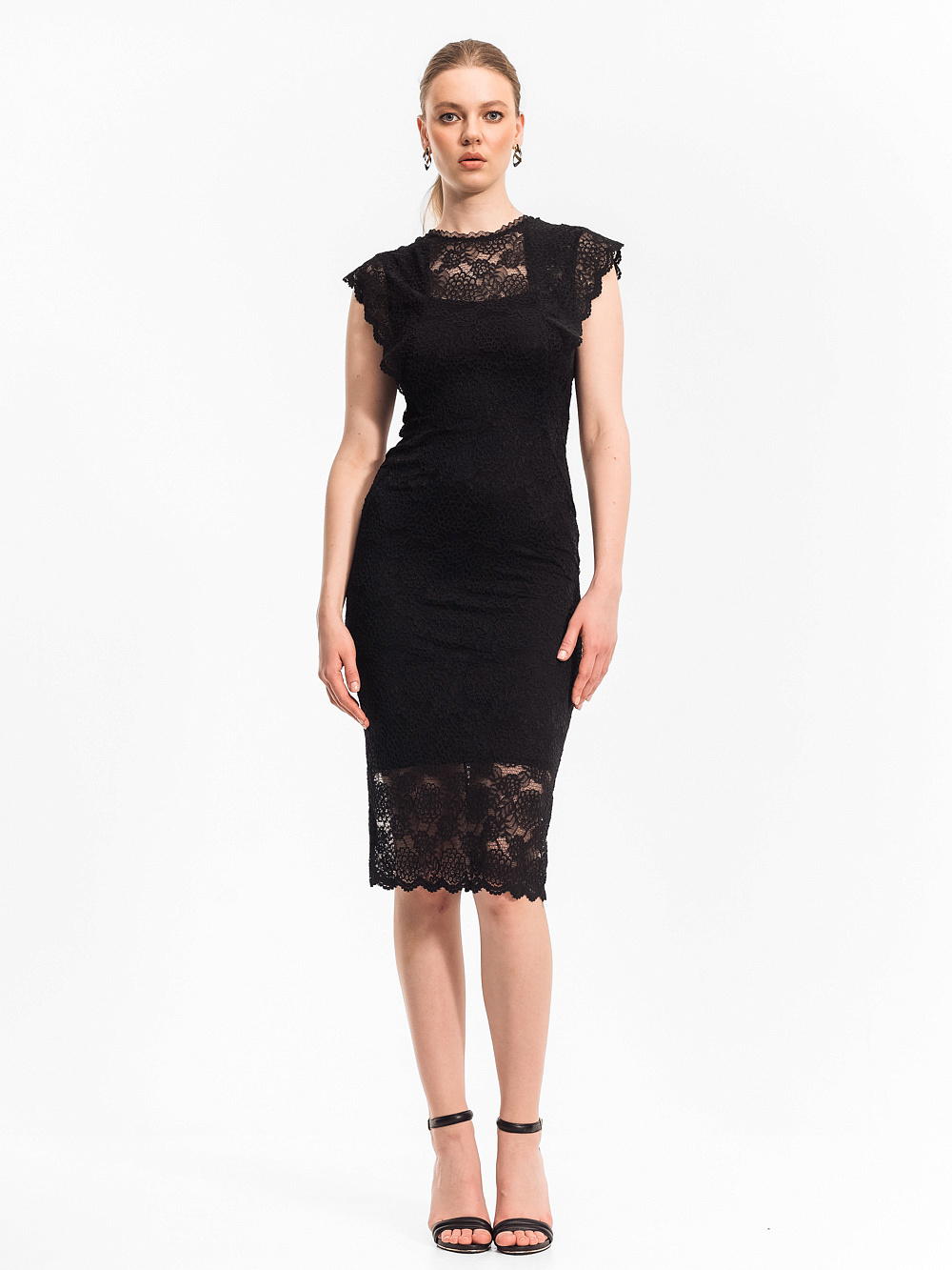 Платье - футляр из эластичного гипюра с фигурными деталями в рельефах,выполняющих функцию декора и рукавов-крылышек. Модель , в лучших традициях стиля Dolce & Gabbana , подкупает своей безусловной женственностью и аристократизмом, продуманностью в деталях с использованием фестонного края по низу платья и крылышкам, что предполагает точность кроя и подгонку по рисунку. Чистота и изысканность линий достигнуты благодаря продуманности конструкции и обработки изделия в целом. Платье выполнено на подкладе из трикотажного модала, что придает ему комфорт и функциональность.
