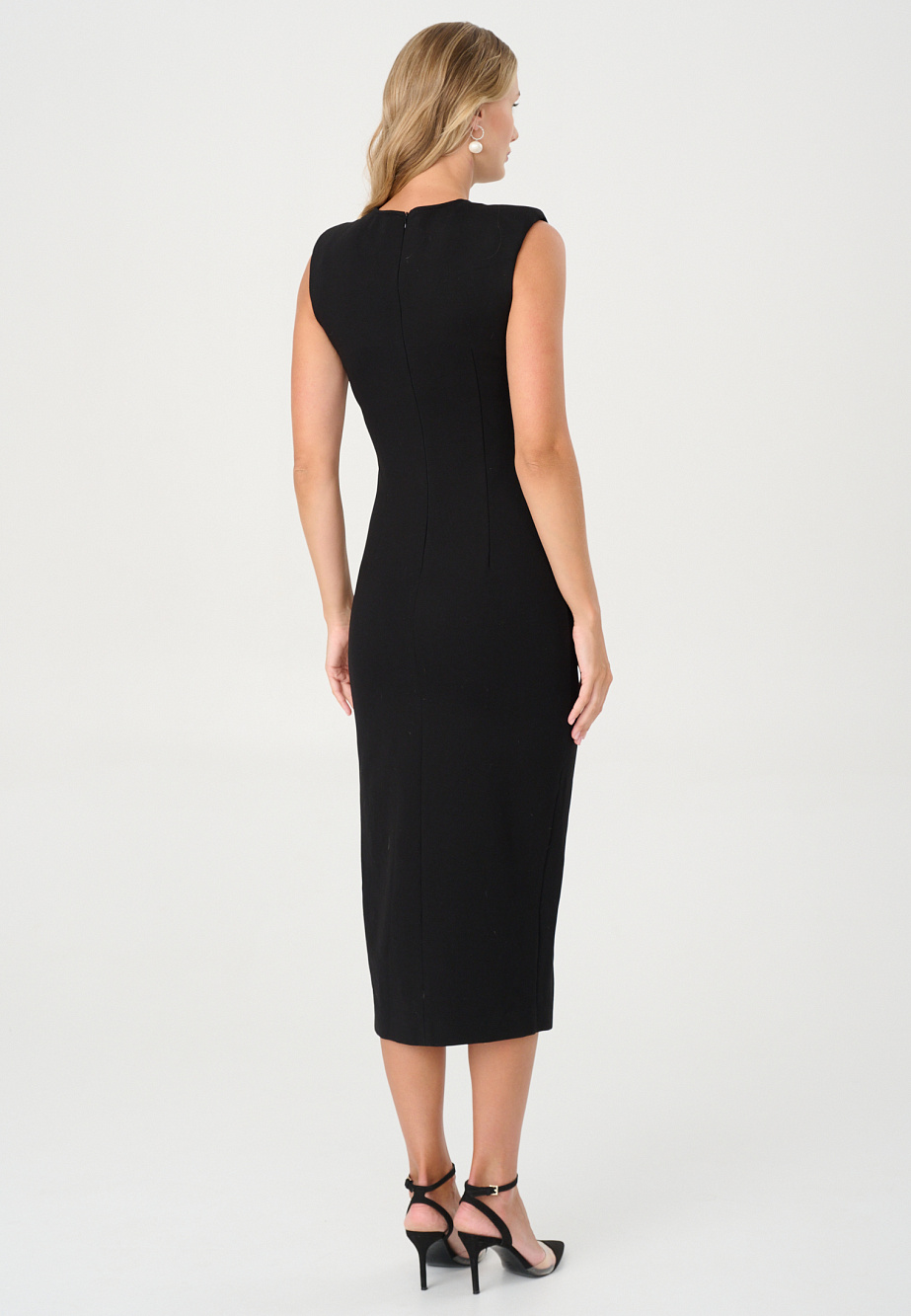 Черное приталенное платье-футляр из плотного трикотажа с высоким содержанием района. Расширенная линия плеч и плечевые накладки делают платье современным и актуальным,а также создают красивый геометрический силуэт и подчеркивают визуально талию. Ассиметричная кокетка с прорезью и декоративной булавкой придают таинственность и стильность образу.Заведенный вперед боковой шов переходит в высокий разрез, делая силуэт притягательным. Такие интересные детали добавляют акценты и привлекают внимание.