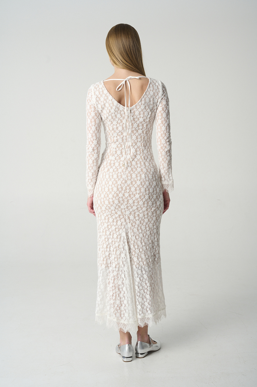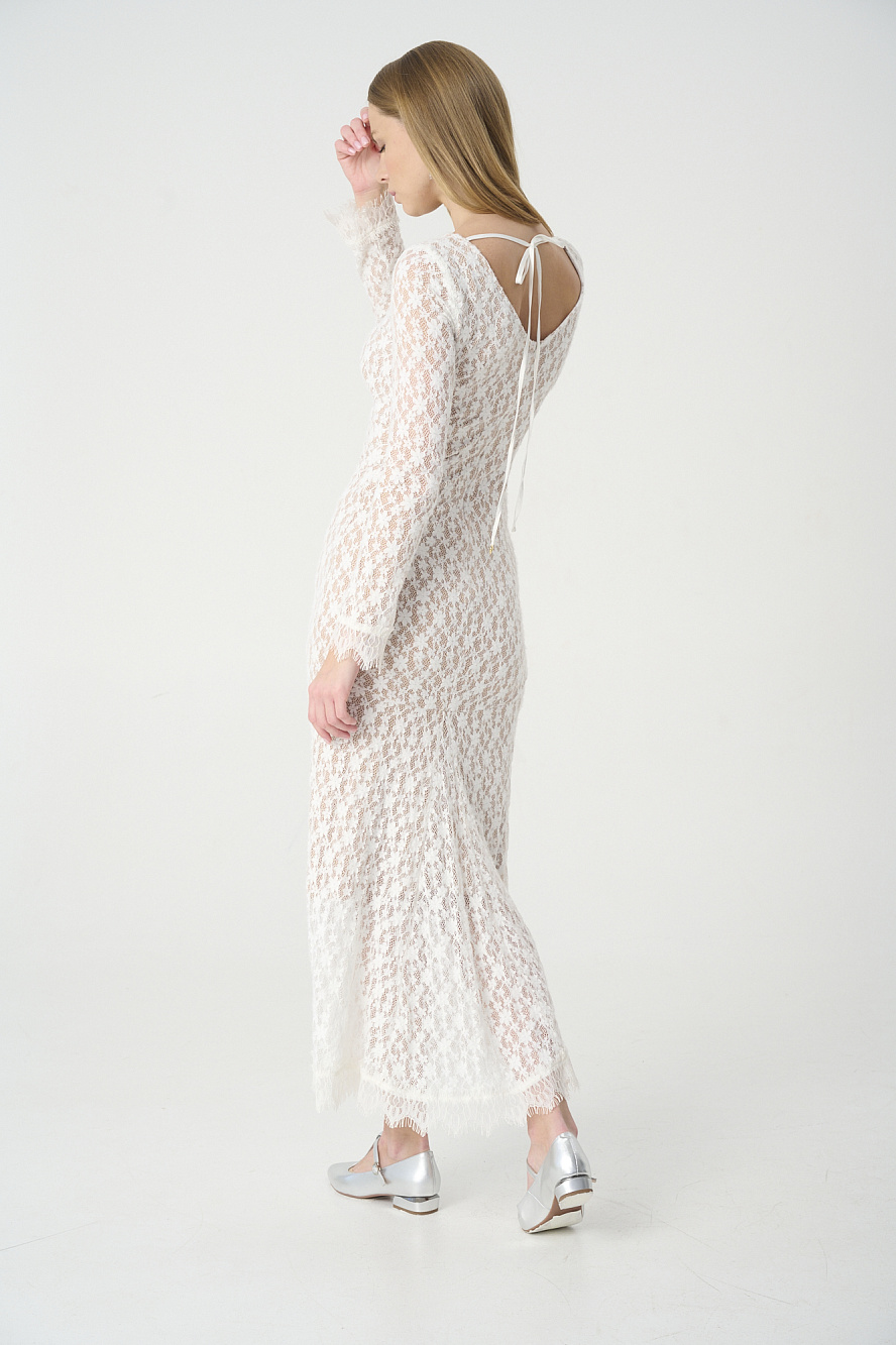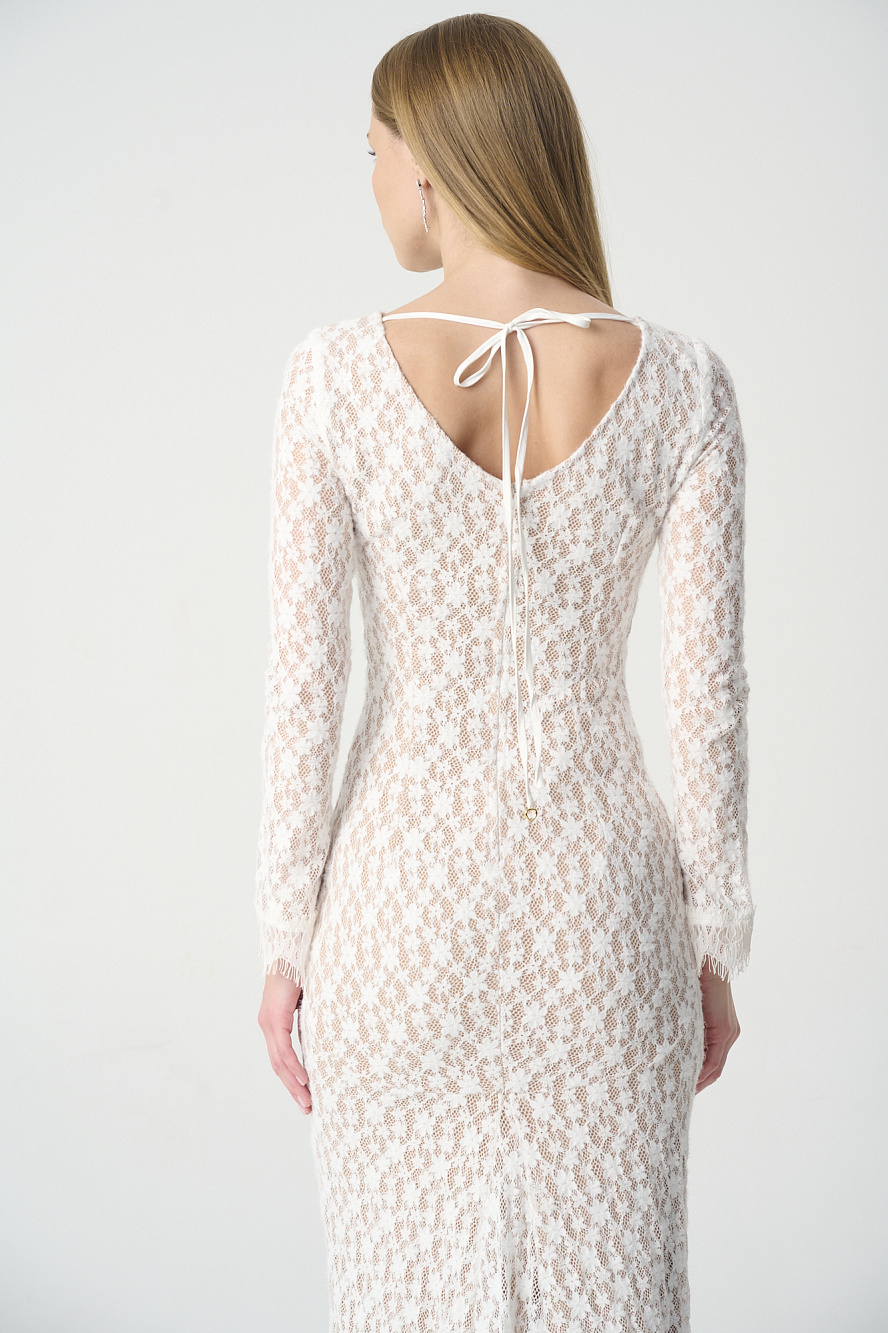 Платье из эластичного кружева, прилегающего силуэта,на подкладе цвета нюд,который создает эффект обнаженного тела и передает красоту и ажурный рисунок этого кружева. Стоит обратить внимание на интересный крой юбки-годе по спинке,который изысканно подчеркивает силуэт фигуры, а также на расклешенные книзу рукава и богатое кружево с фестонами по низу платья и рукавов. Закрытая горловина переда очень эффектно переходит в V-образный вырез на спинке, который можно зафиксировать декоратичными завязками и гармонично контрастирует с фасоном платья в целом. Трикотажный подклад из мягкого и очень приятного района создает не только эффектный образ, но и очень комфортный, что очень важно в демисезонный период. Такое платье смотрится безупречно и притягивает взгляды.
