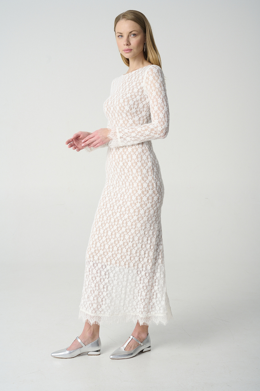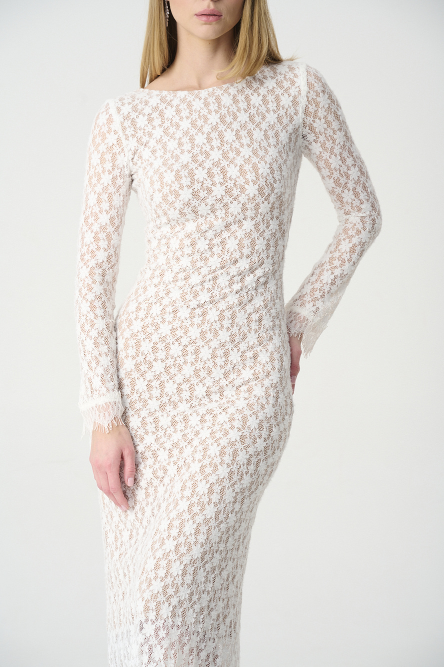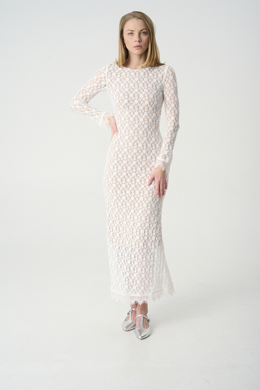 Платье из эластичного кружева, прилегающего силуэта,на подкладе цвета нюд,который создает эффект обнаженного тела и передает красоту и ажурный рисунок этого кружева. Стоит обратить внимание на интересный крой юбки-годе по спинке,который изысканно подчеркивает силуэт фигуры, а также на расклешенные книзу рукава и богатое кружево с фестонами по низу платья и рукавов. Закрытая горловина переда очень эффектно переходит в V-образный вырез на спинке, который можно зафиксировать декоратичными завязками и гармонично контрастирует с фасоном платья в целом. Трикотажный подклад из мягкого и очень приятного района создает не только эффектный образ, но и очень комфортный, что очень важно в демисезонный период. Такое платье смотрится безупречно и притягивает взгляды.