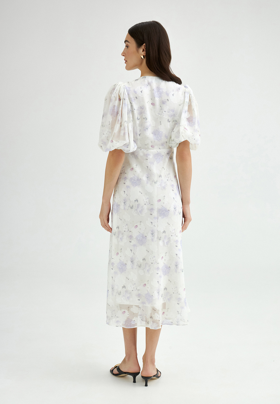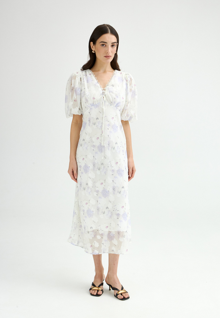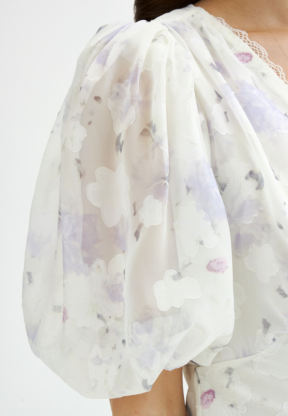 Платье из легкого шифона с нежным акварельным принтом и жаккардовой фактурой, на подкладе с высоким содержанием вискозы. Модель с кроем юбки по косой, подрезом под грудью, шнуровкой по горловине и изысканным кружевом навевает романтичное настроение. Пышный рукав, подчеркнутый филером из сетки по окату для объема,придает платью актуальность и является модным акцентом. Полуприлегающий силуэт платья позволяет непринужденно себя чувствовать в течении дня.