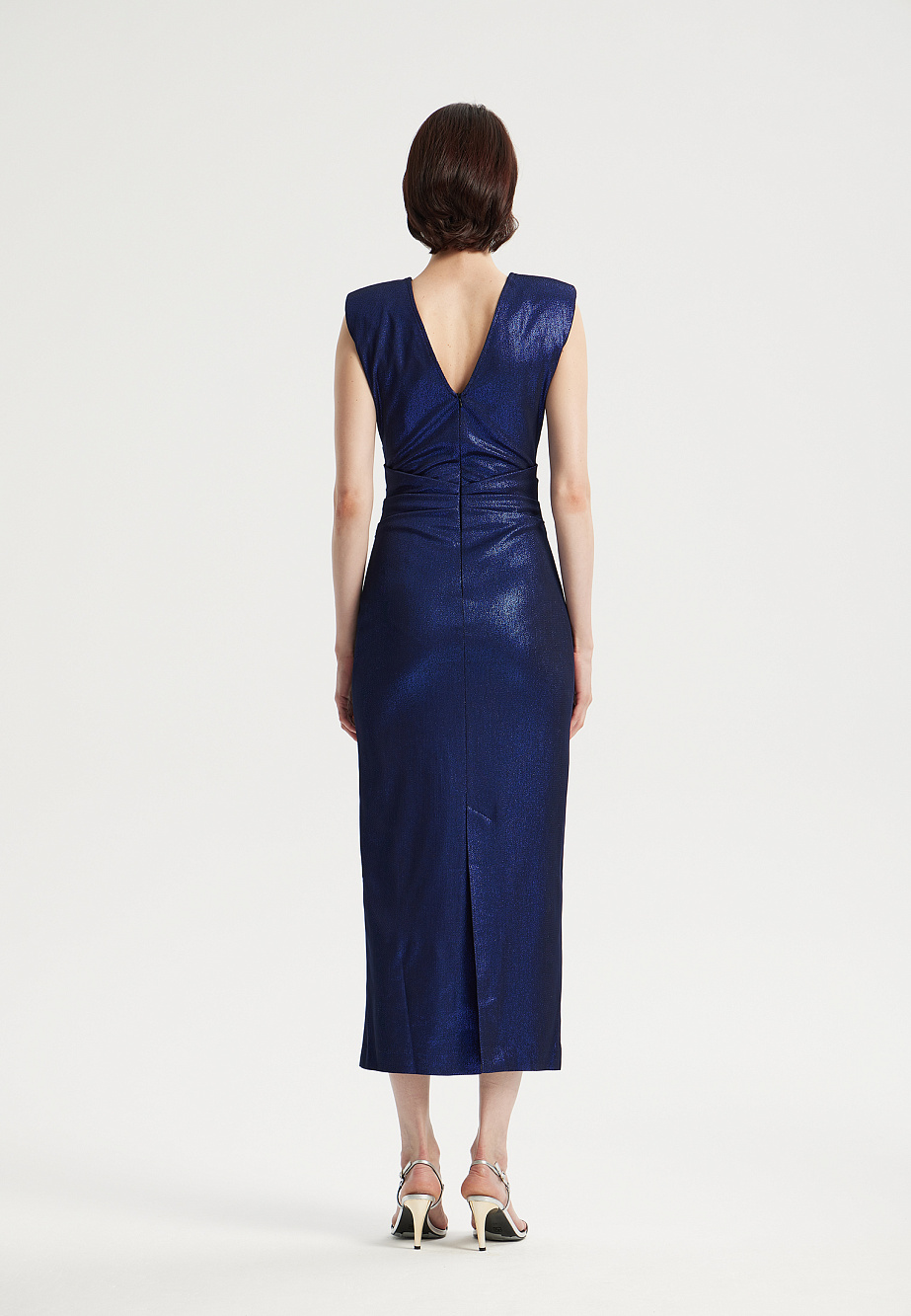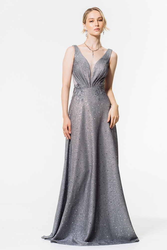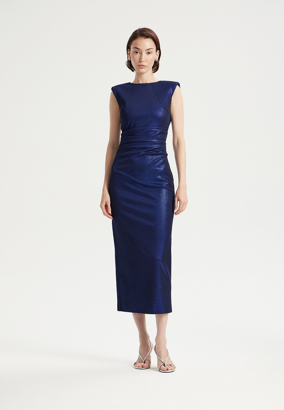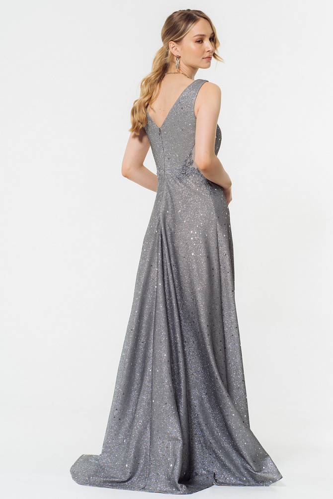 Современное платье, актуального фасона из мерцающей эластичной ткани длиной макси. Благородный с отливом синий цвет, графичный силуэт с акцентной линией плеч и лаконичный крой прямой юбки с высоким разрезом делают платье очень элегантным и создают безупречный силуэт. Драпировка на талии усиливает эффект коррекции фигуры, преображая ее до совершенства. Такой образ достоен самого торжественного случая и создаст беспроигрышное впечатление.