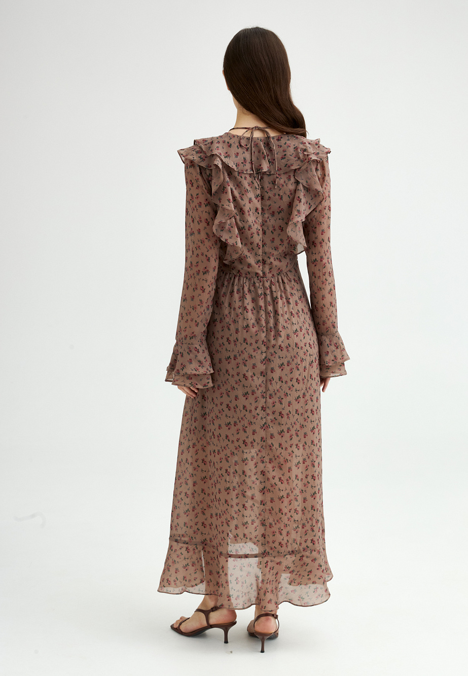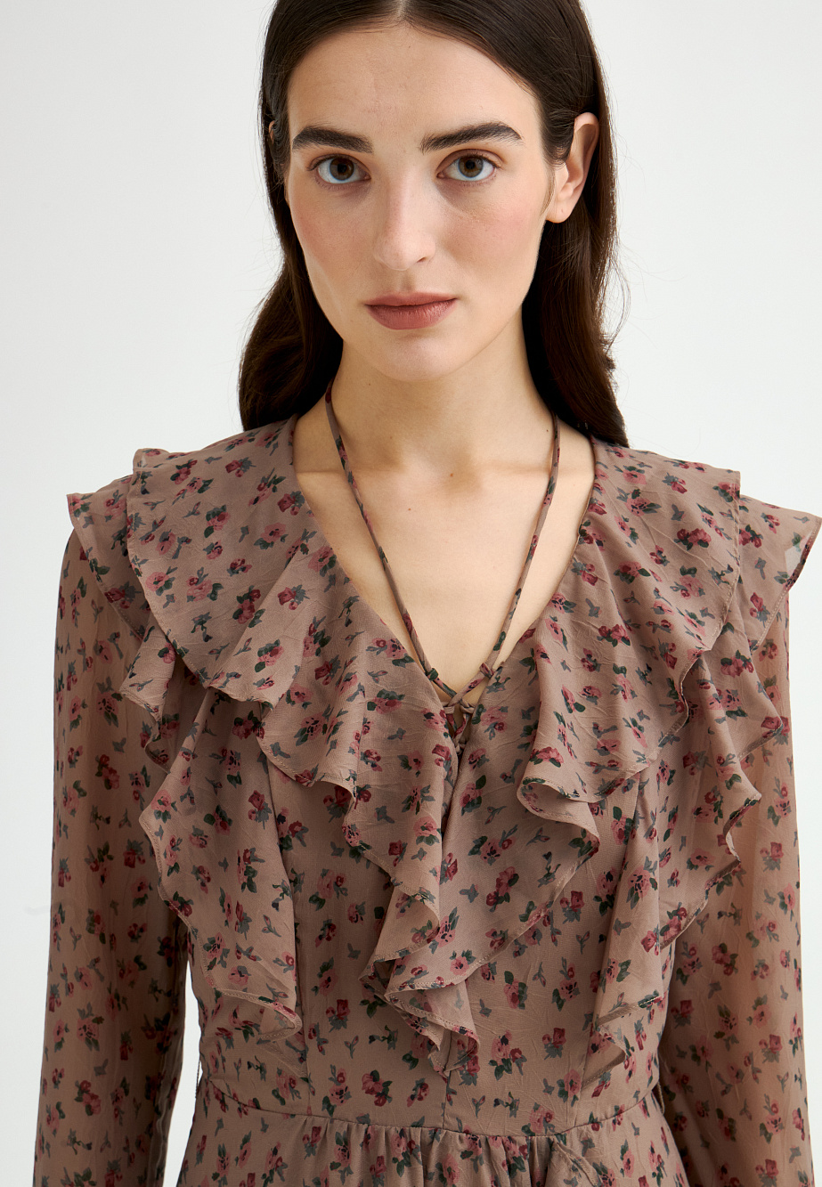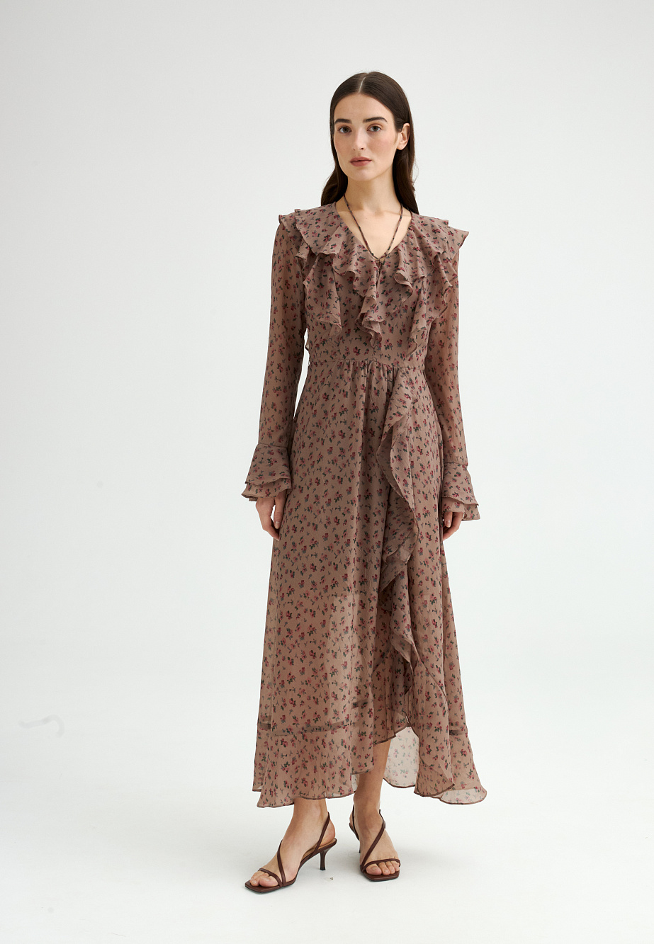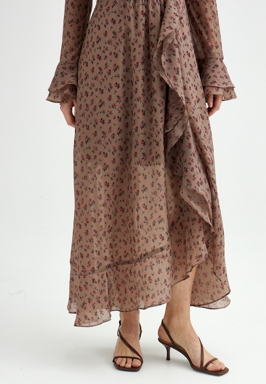 Романтичное платье из мягкого жатого шифона в мелкий цветочный принт с обилием воланов и оборок, очень женственное в стиле бохо с элементами стилистики вестерн. Такой симбиоз стилей позволит выразить вашу безграничную индивидуальность. Шнуровка на груди, воланы, широкая и длинная юбка с разрезом по ноге придают образу свободолюбивый характер. Модель идеально впишется в осеннюю коричнево- бордовую гамму и поможет составить интересные аутфиты с базовыми вещами и кожаными аксессуарами. Ремень из натуральной кожи с золотой пряжкой в модном оттенке бордо отражает актуальность и гарантирует востребованность среди современных женщин, чутких к актуальным трендам. Мягкий вискозный состав подклада нежно обнимет вашу фигуру и придаст ощущение уюта в осенний непогожий день.