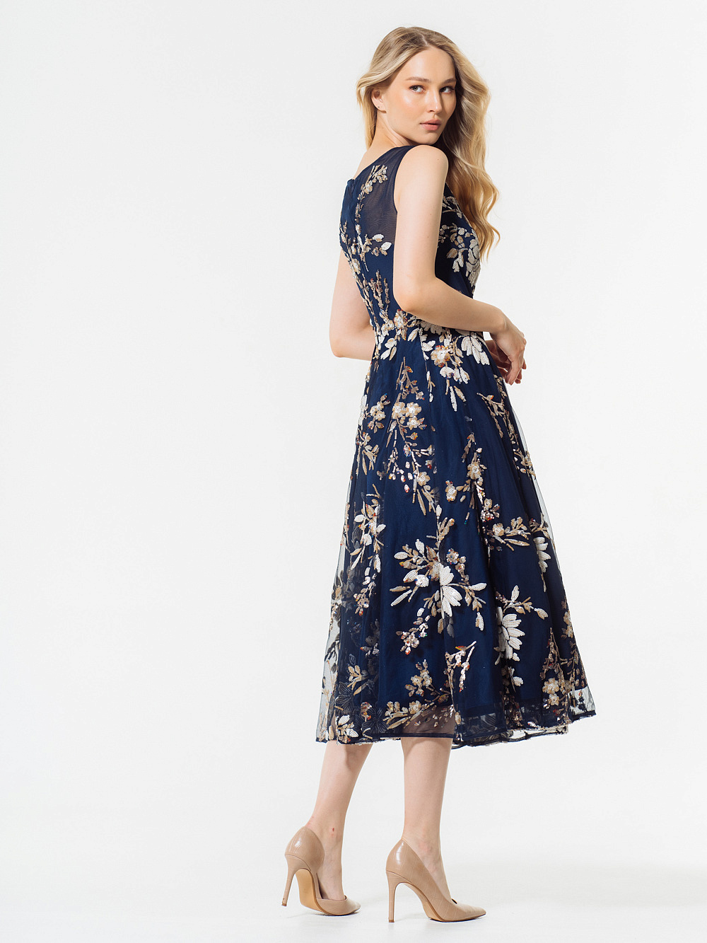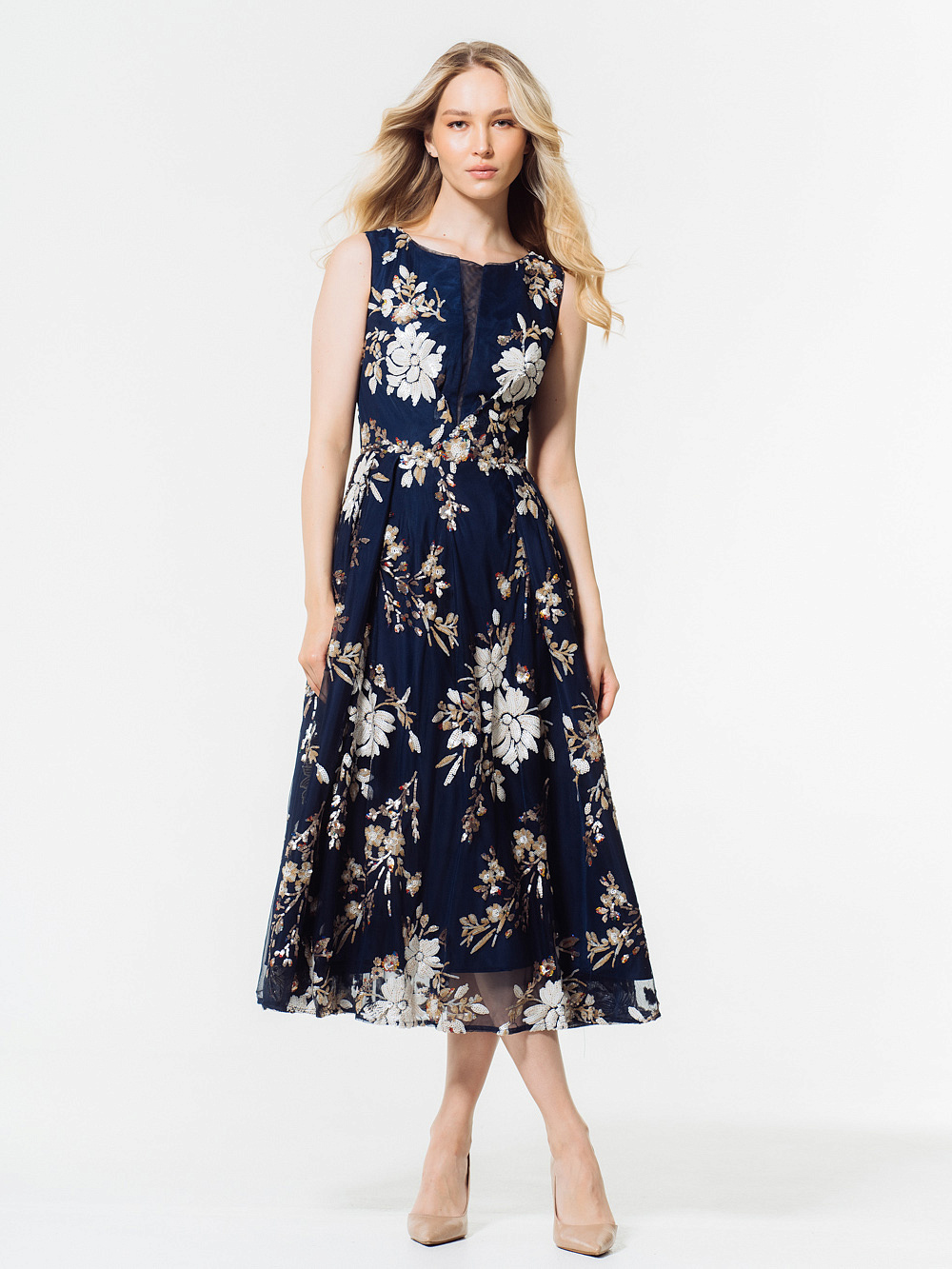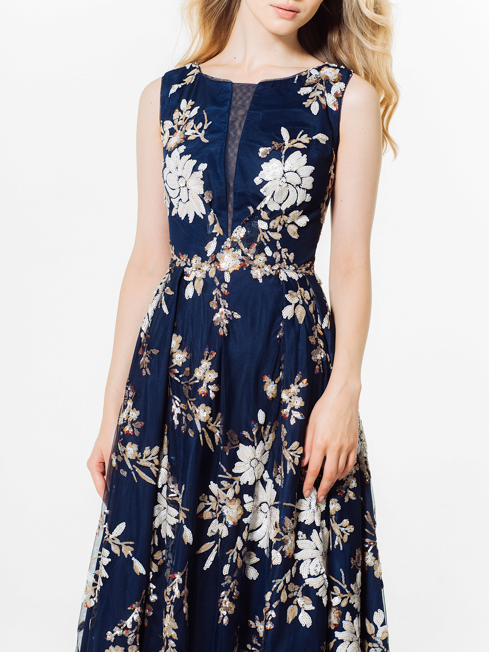 Идеальное платье для торжественных церемоний с цветочным принтом из пайеток и вышивки ручной работы. Вырез лодочкой и прозрачная вставка из сетки на лифе смотрятся изящно и загадочно,расклешенная юбка эффектно подчеркивает силуэт.Застежка сзади на молнию.