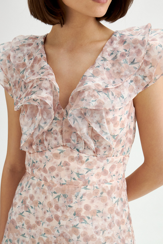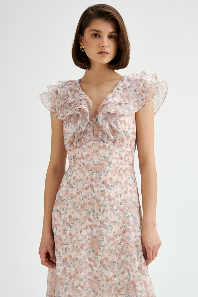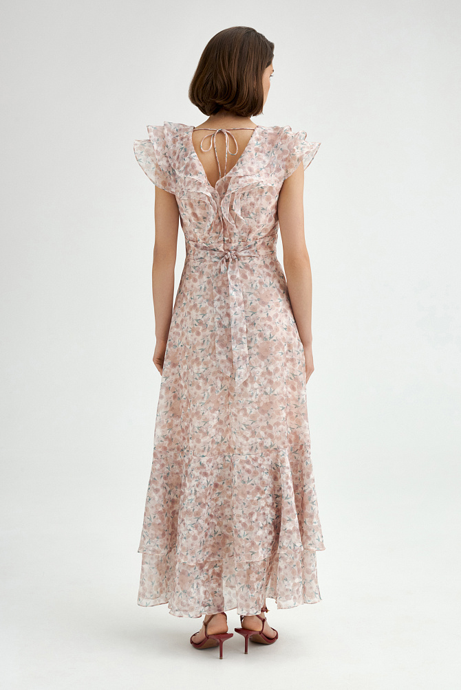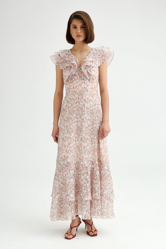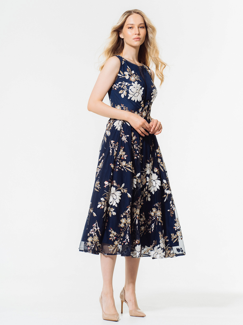 Идеальное платье для торжественных церемоний с цветочным принтом из пайеток и вышивки ручной работы. Вырез лодочкой и прозрачная вставка из сетки на лифе смотрятся изящно и загадочно,расклешенная юбка эффектно подчеркивает силуэт.Застежка сзади на молнию.