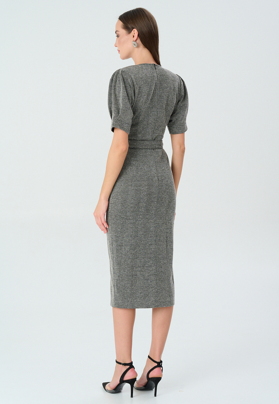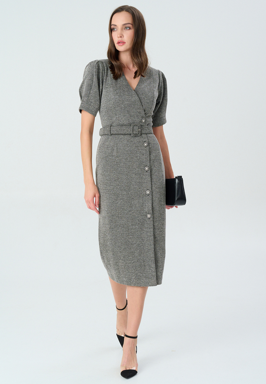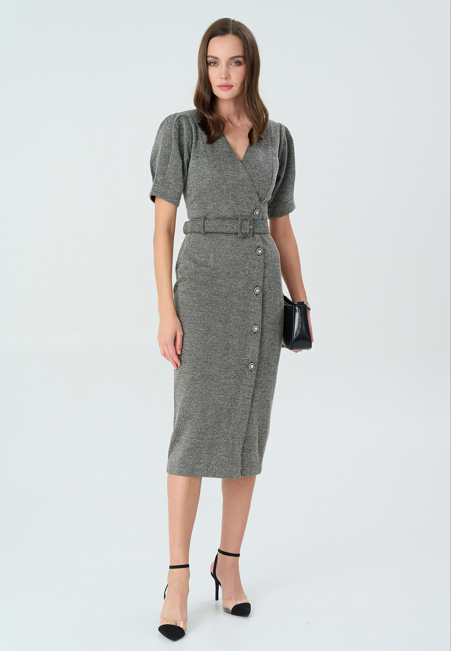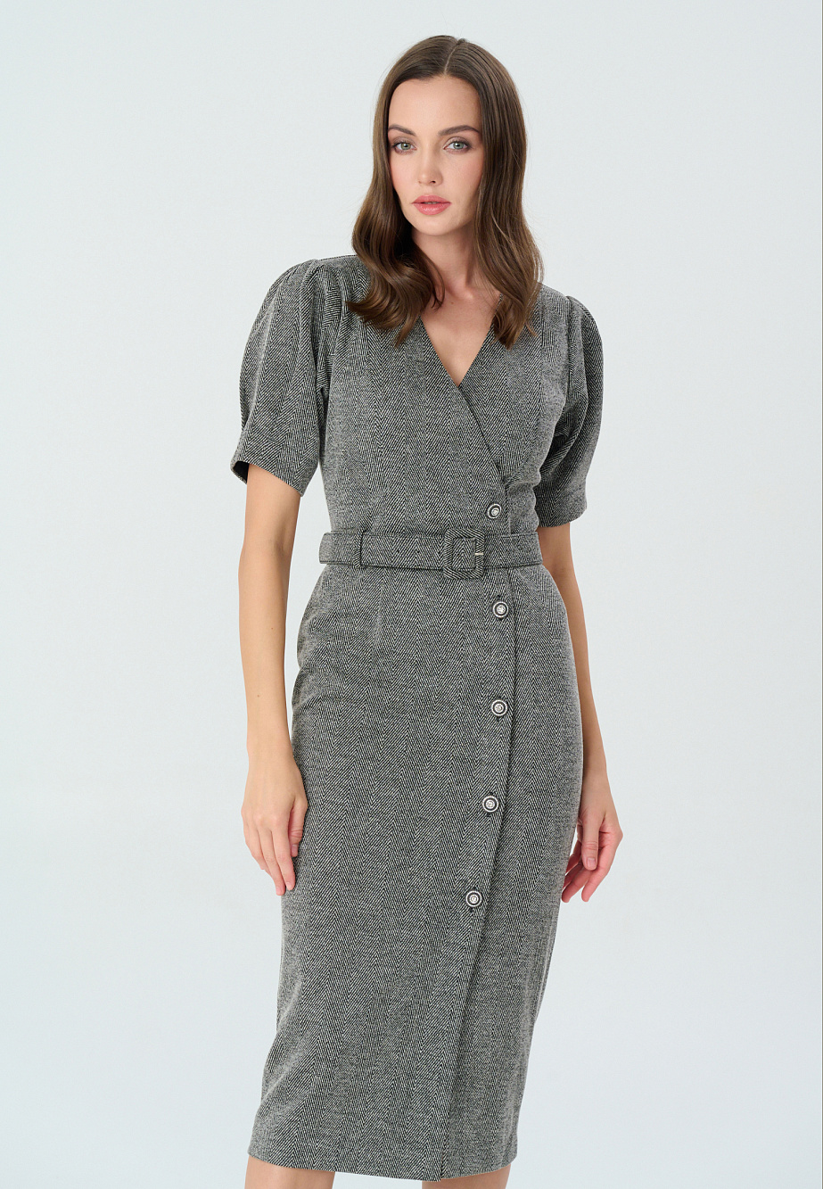 Платье из приятного трикотажа с хлопком, приталенного силуэта, с имитацией запаха -актуальный вариант в качестве офисной и повседневной одежды. Выверенные пропорции,четкая и спрямленная линия плеч,подчеркнутая подплечниками, объемные рукава и ткань с жаккардовым переплетением в елочку отсылают нас в 80-е гг. прошлого столетия. Четкий силуэт, декоративные пуговицы и ремень, подчеркивающий талию помогают создать женственный и современный деловой образ.