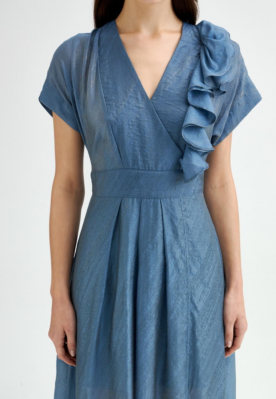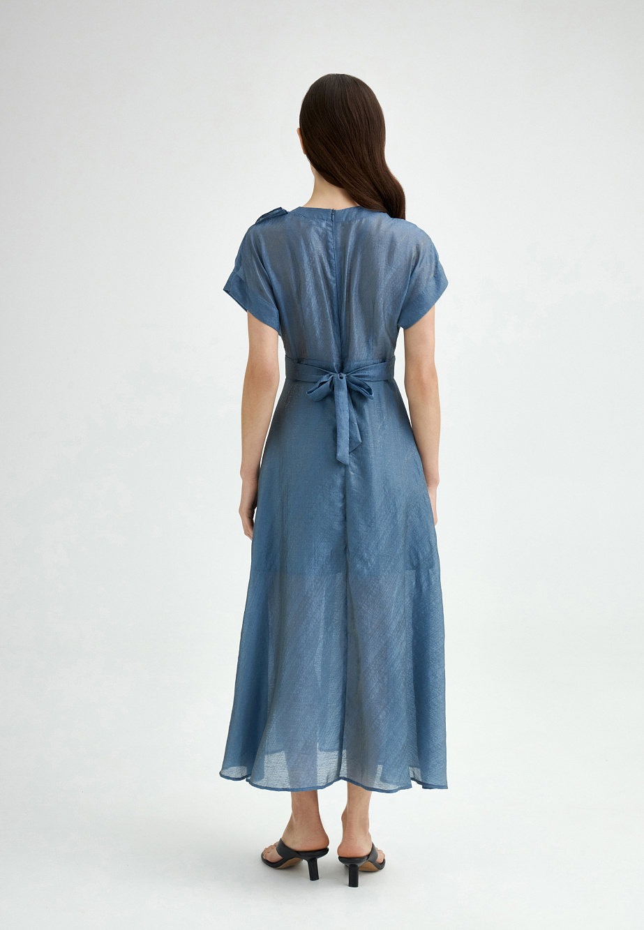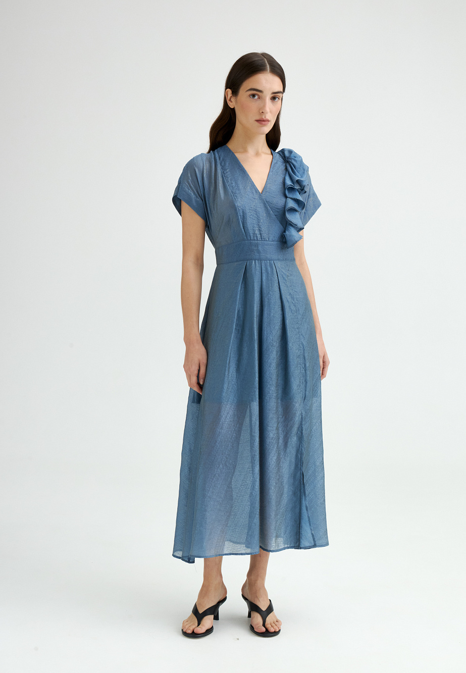 Легкое платье из мерцающей ткани с добавлением тенселя гармонично сочетает в себе повседневную практичность и нотки торжественности. Декор в виде волана, собранного в цветок, добавляет образу деликатного объема и индивидуальности. Модель представлена в двух актуальных оттенках — бронзовом и серо-голубом, которые эффектно подчёркнуты золотистым сиянием. Спущенная линия плеч, лиф на запах, расклешённая юбка и пояс, завязывающийся сзади, формируют элегантный силуэт, а разрез по ноге придаёт лёгкий флер притягательности.