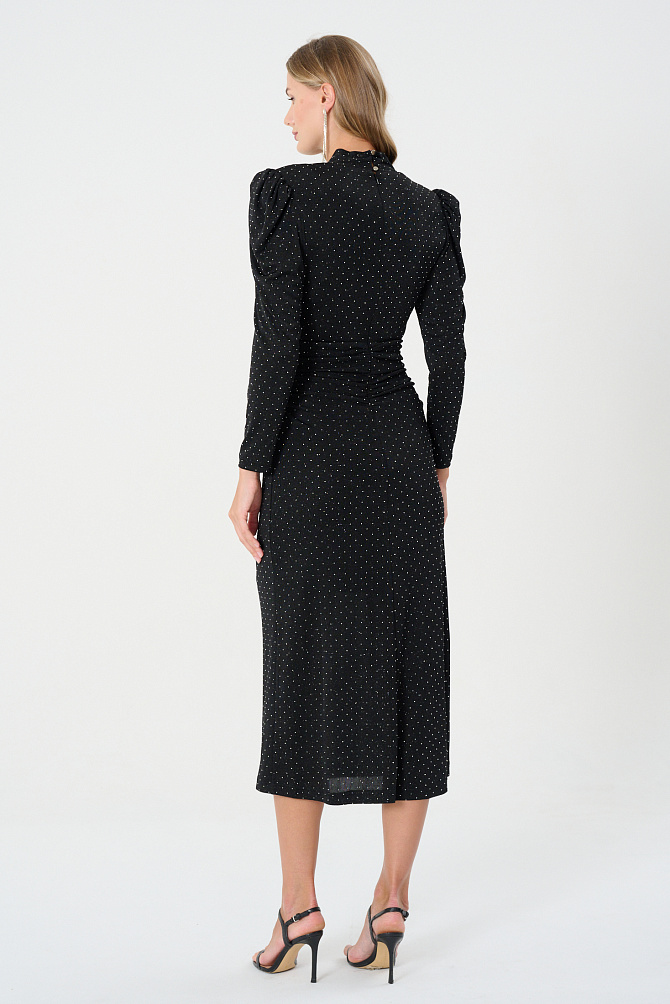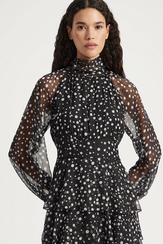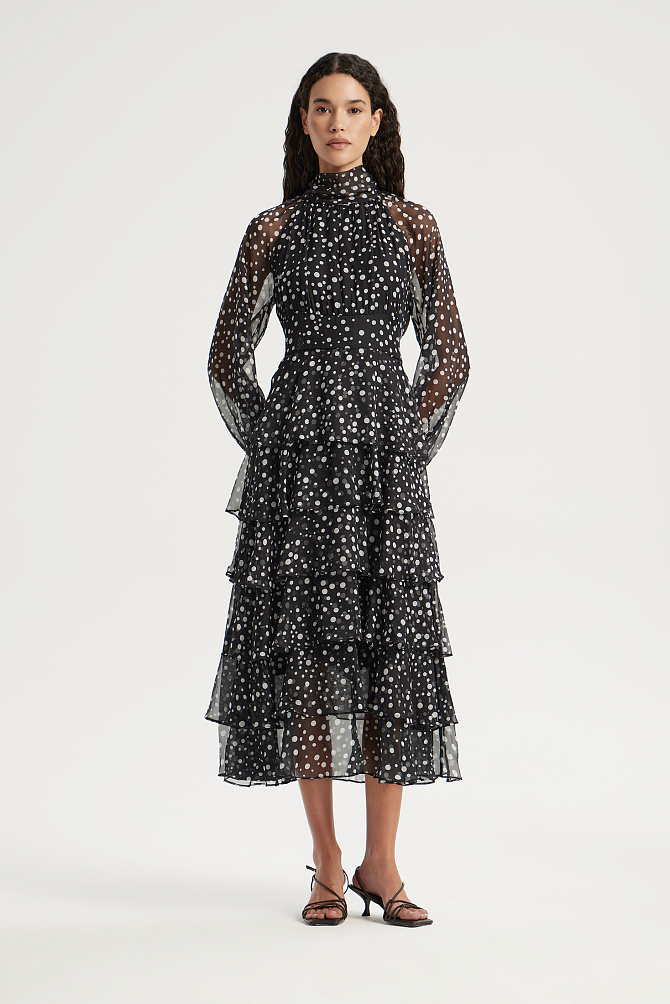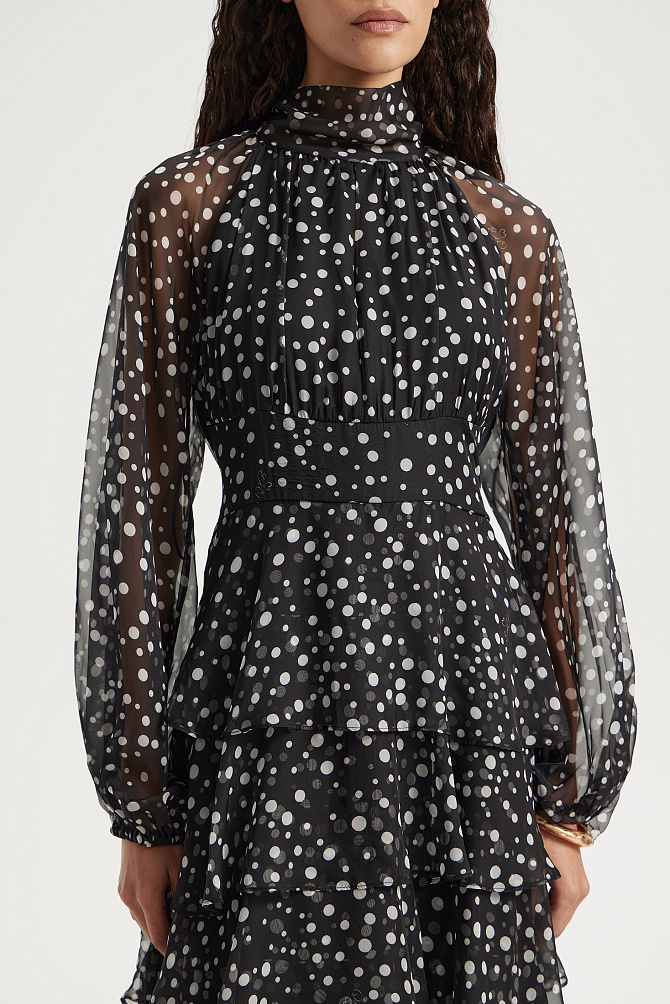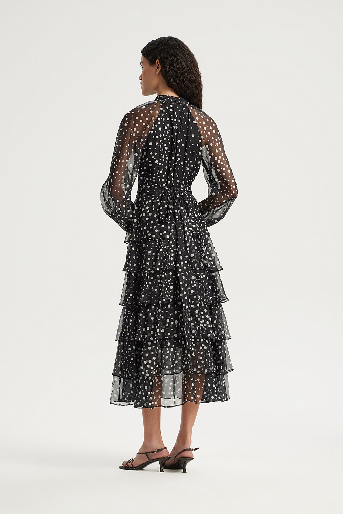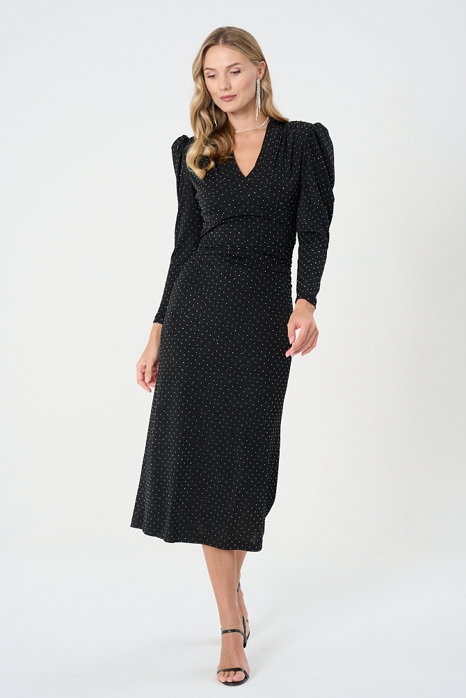 Легкое платье из мерцающей ткани с добавлением тенселя гармонично сочетает в себе повседневную практичность и нотки торжественности. Декор в виде волана, собранного в цветок, добавляет образу деликатного объема и индивидуальности. Модель представлена в двух актуальных оттенках — бронзовом и серо-голубом, которые эффектно подчёркнуты золотистым сиянием. Спущенная линия плеч, лиф на запах, расклешённая юбка и пояс, завязывающийся сзади, формируют элегантный силуэт, а разрез по ноге придаёт лёгкий флер притягательности.