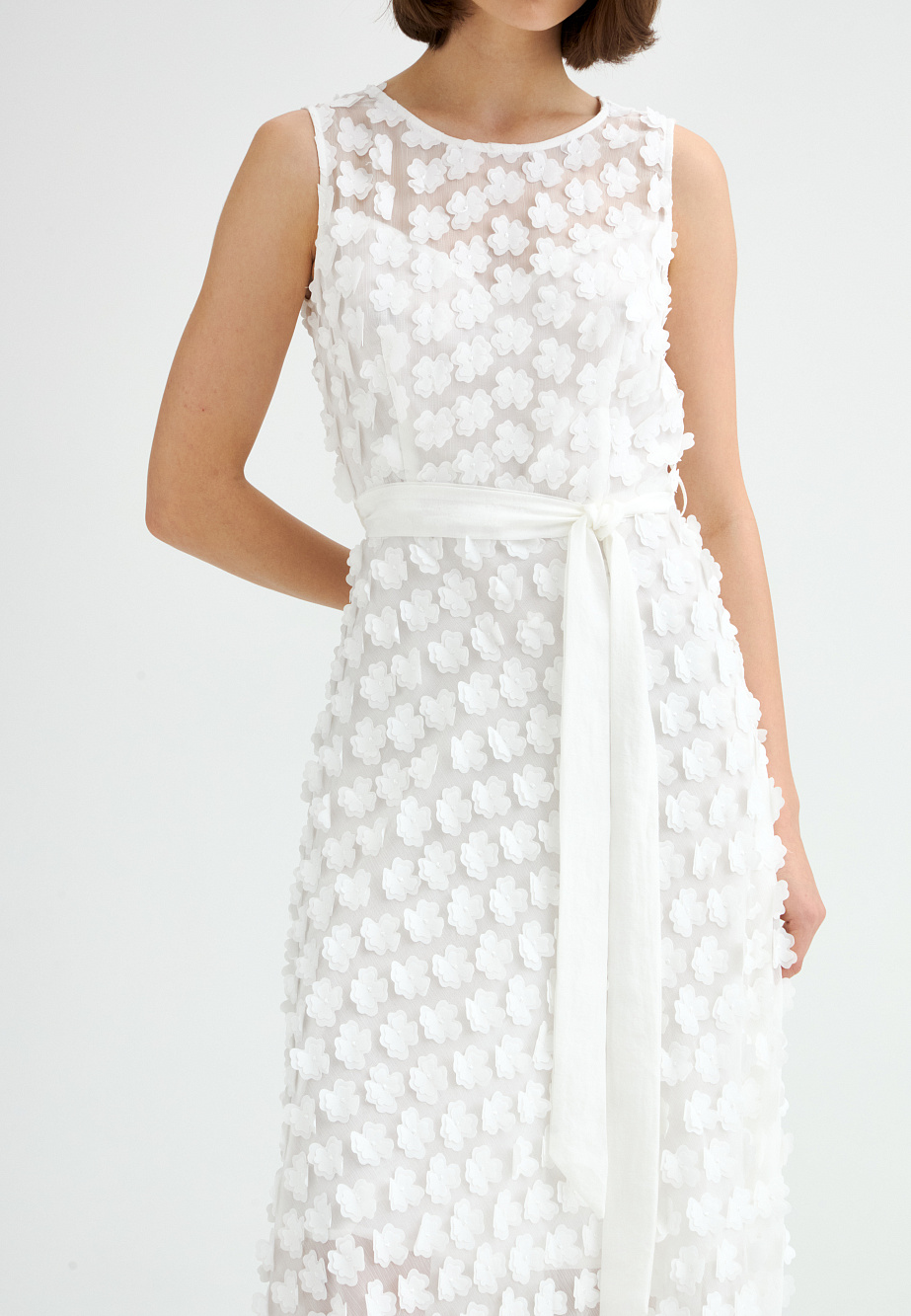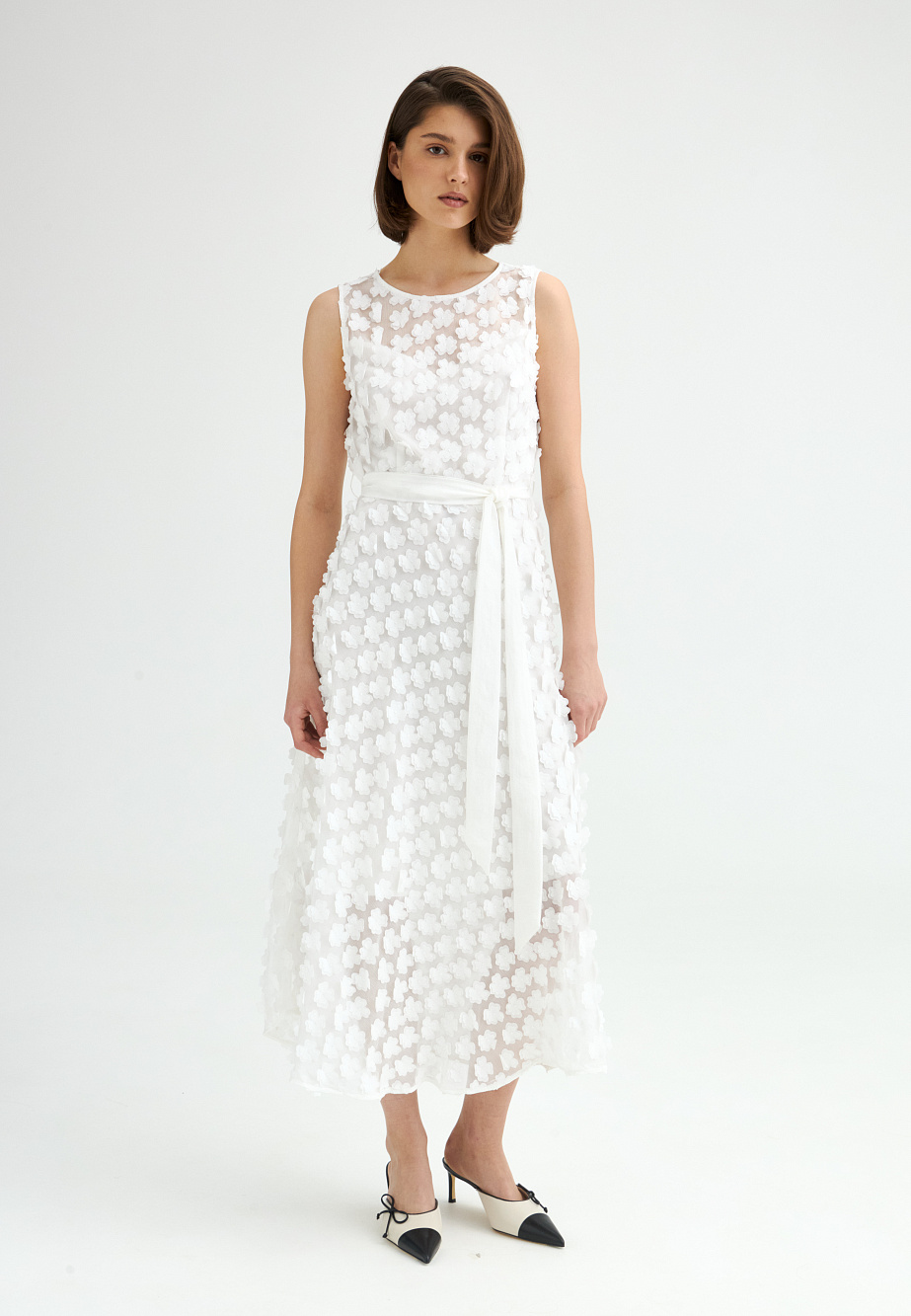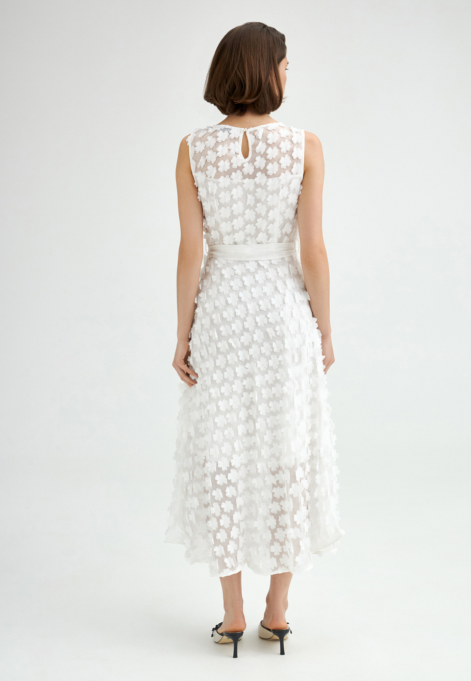 Платье в лаконичном силуэте мидакси из ткани с эффектом 3D сочетает высокое качество обработки, актуальные пропорции и продуманные детали. Круглый вырез горловины, юбка, скроенная по косой, и мягкий пояс из шифонового крепа придают модели элегантность и утонченность. Потайная молния сбоку и подкладка из вискозной ткани завершают образ, обеспечивая идеальную посадку.