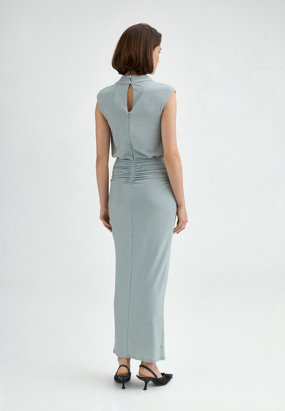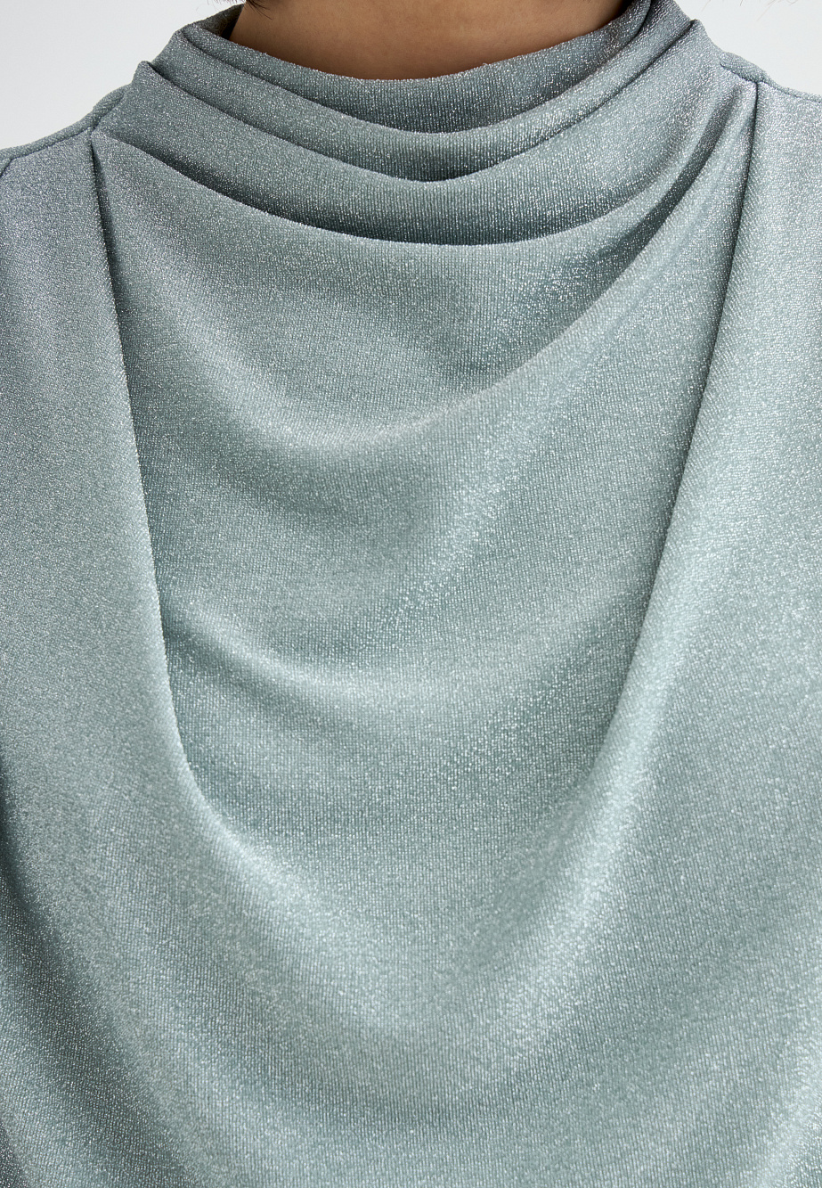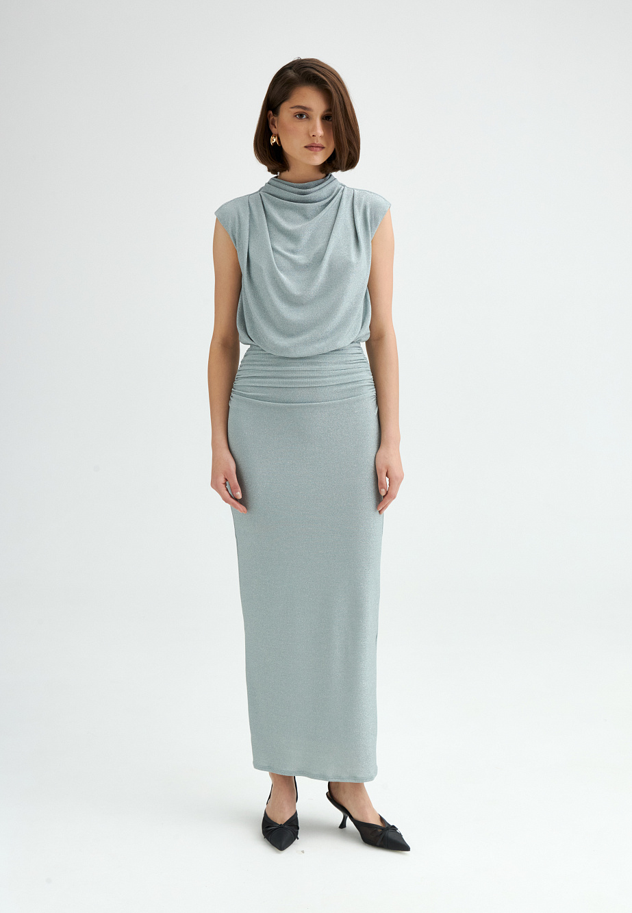 Трикотажное платье макси в изысканном оттенке тиффани выполнено из мерцающей ткани с люрексом и дополнено подкладкой из эластичной сетки. Свободный лиф со спущенной линией плеч и воротником-стойкой эффектно сочетается с зауженной юбкой, украшенной драпировками и мягкими складками. Контраст объемов подчёркивает фигуру и создаёт выразительный силуэт с нотами утончённой элегантности.