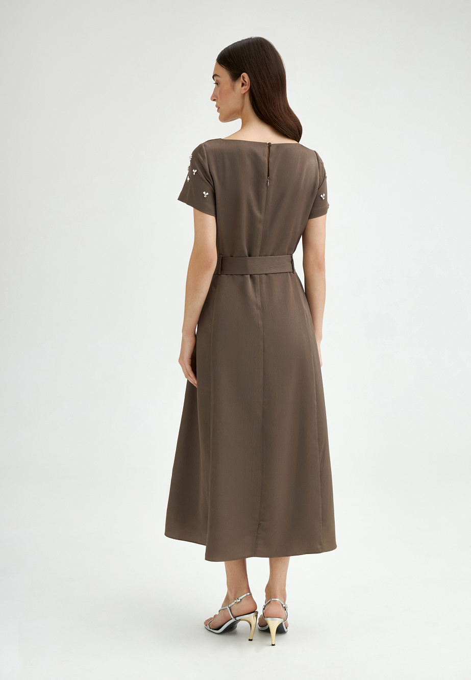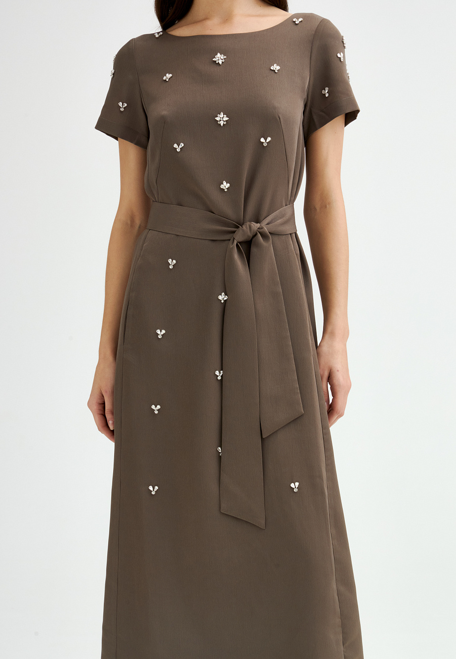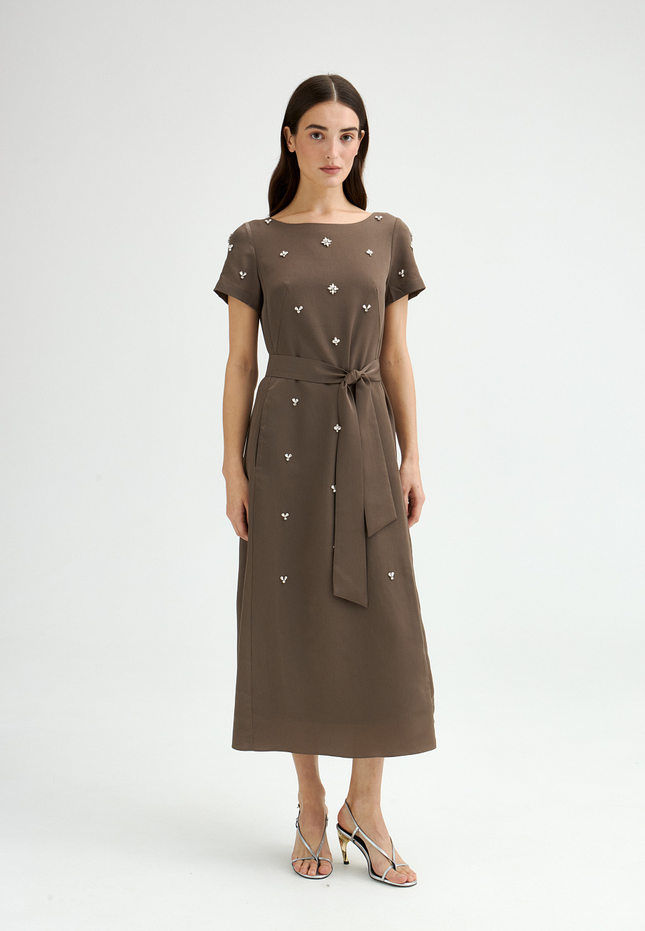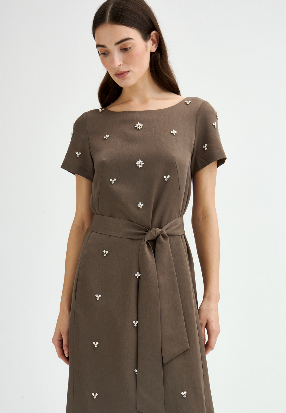 Элегантное платье с универсальным А-образным силуэтом украшено вручную стразами. Ткань с районом обладает приятной струящейся текстурой и сатиновым блеском, создавая ощущение уточенности и тихой роскоши. Талия подчеркнута мягким поясом из основной ткани. Внутри подкладка из тонкой смесовой ткани с районом. Карманы скрыты в рельефах, а застежка выполнена на потайную молнию в среднем шве спинки и пуговицу.