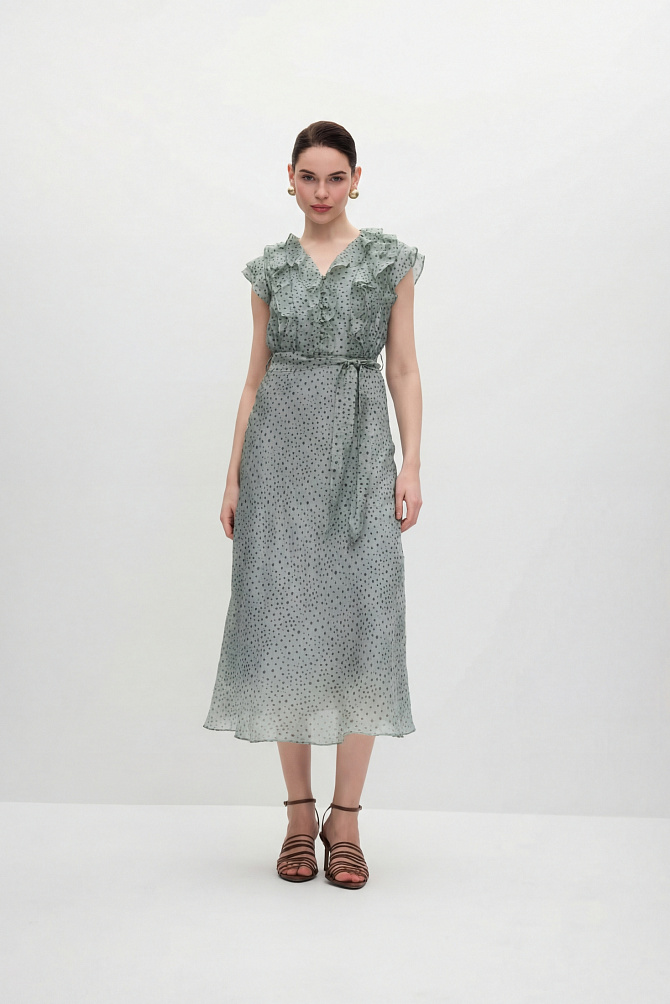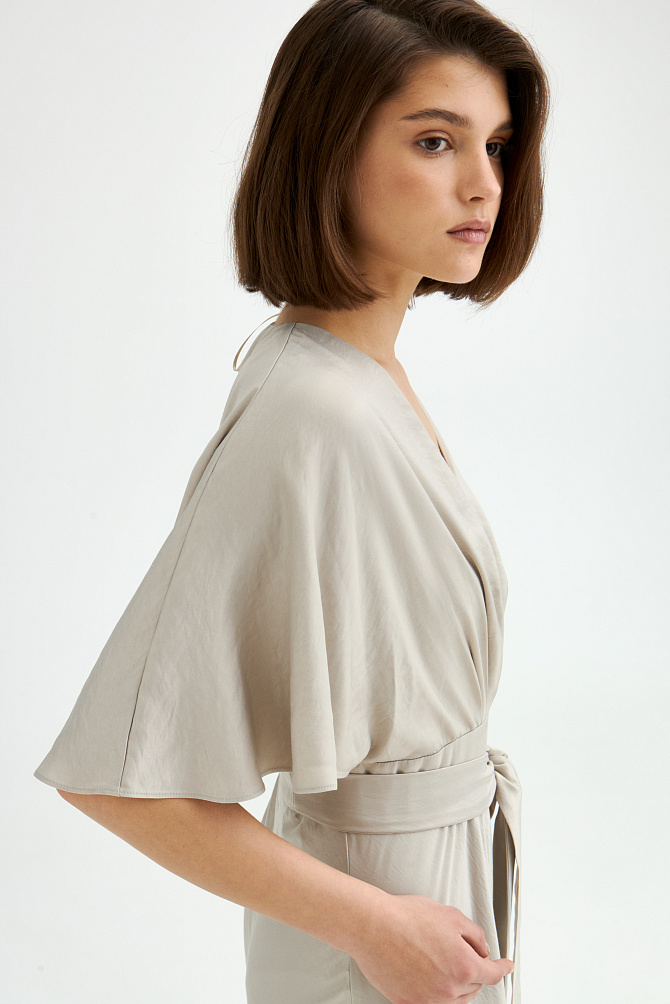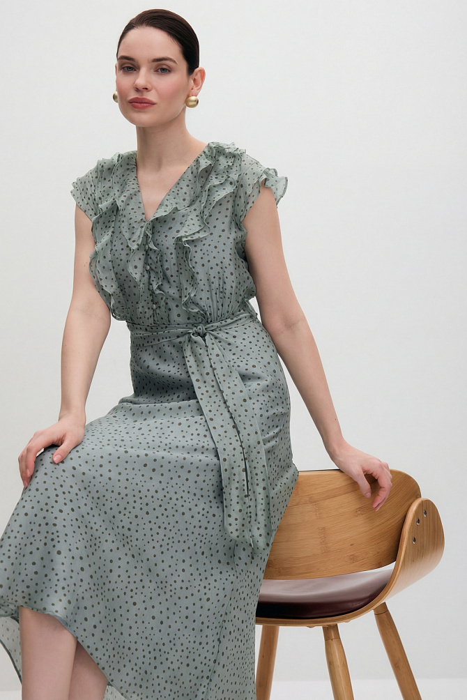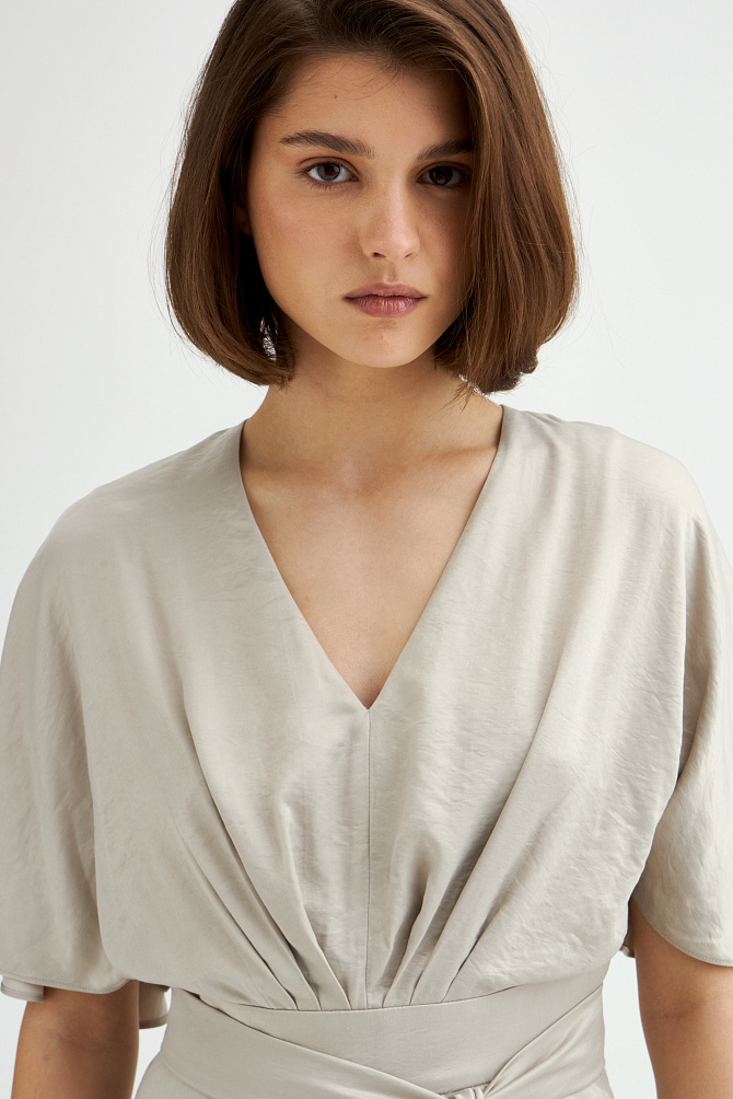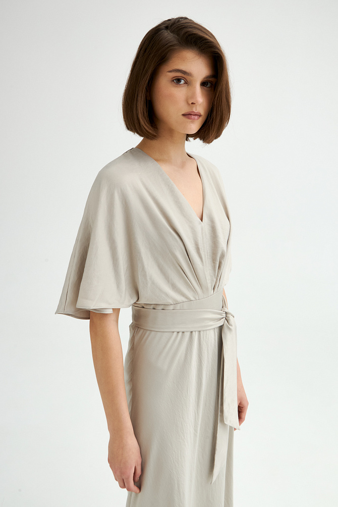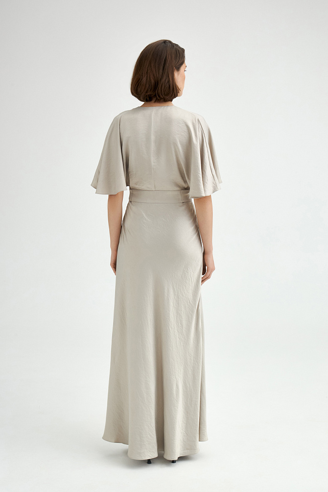 Элегантное платье с универсальным А-образным силуэтом украшено вручную стразами. Ткань с районом обладает приятной струящейся текстурой и сатиновым блеском, создавая ощущение уточенности и тихой роскоши. Талия подчеркнута мягким поясом из основной ткани. Внутри подкладка из тонкой смесовой ткани с районом. Карманы скрыты в рельефах, а застежка выполнена на потайную молнию в среднем шве спинки и пуговицу.