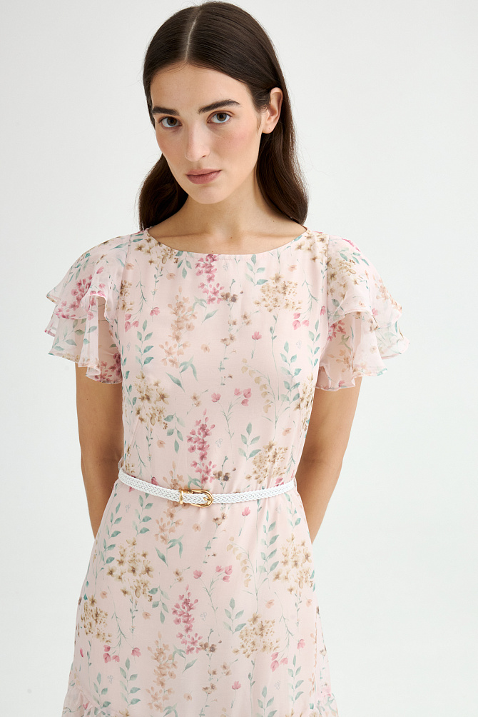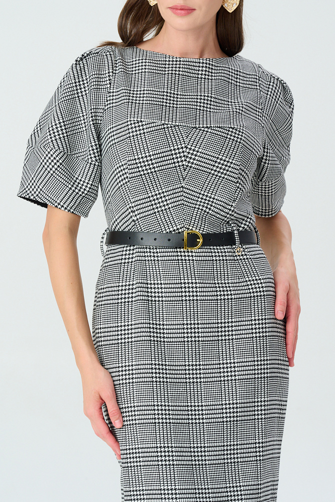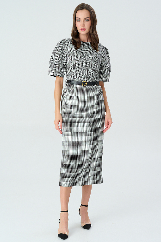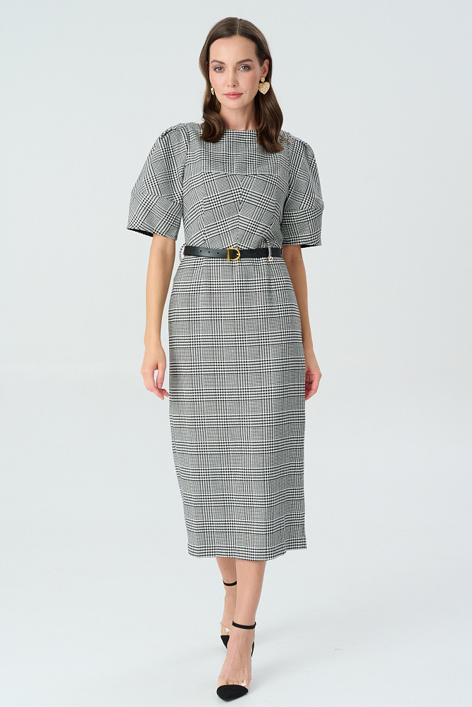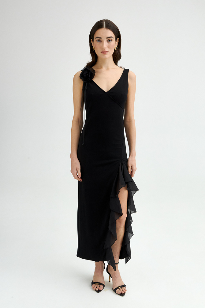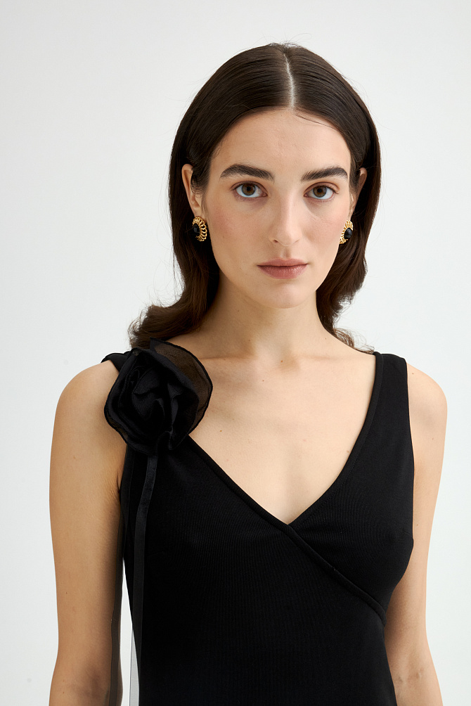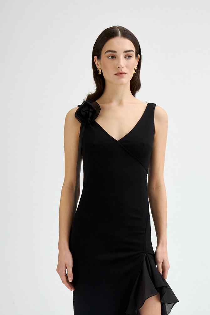 Элегантное платье с универсальным А-образным силуэтом украшено вручную стразами. Ткань с районом обладает приятной струящейся текстурой и сатиновым блеском, создавая ощущение уточенности и тихой роскоши. Талия подчеркнута мягким поясом из основной ткани. Внутри подкладка из тонкой смесовой ткани с районом. Карманы скрыты в рельефах, а застежка выполнена на потайную молнию в среднем шве спинки и пуговицу.