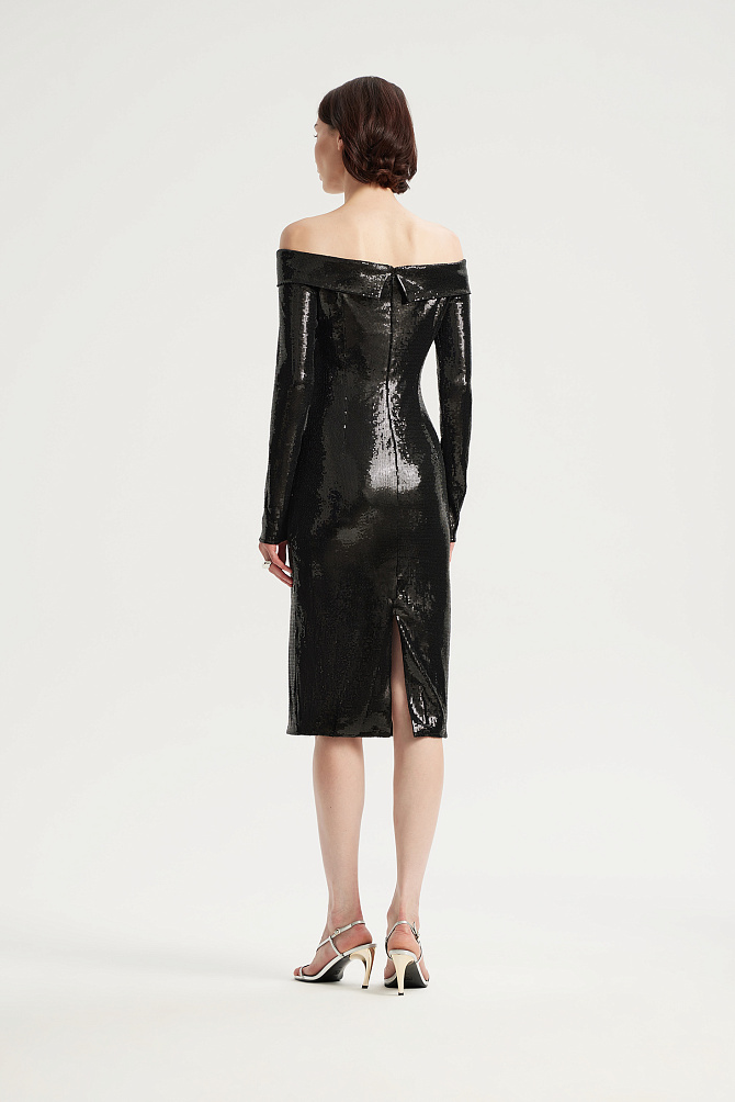 Элегантное платье с универсальным А-образным силуэтом украшено вручную стразами. Ткань с районом обладает приятной струящейся текстурой и сатиновым блеском, создавая ощущение уточенности и тихой роскоши. Талия подчеркнута мягким поясом из основной ткани. Внутри подкладка из тонкой смесовой ткани с районом. Карманы скрыты в рельефах, а застежка выполнена на потайную молнию в среднем шве спинки и пуговицу.