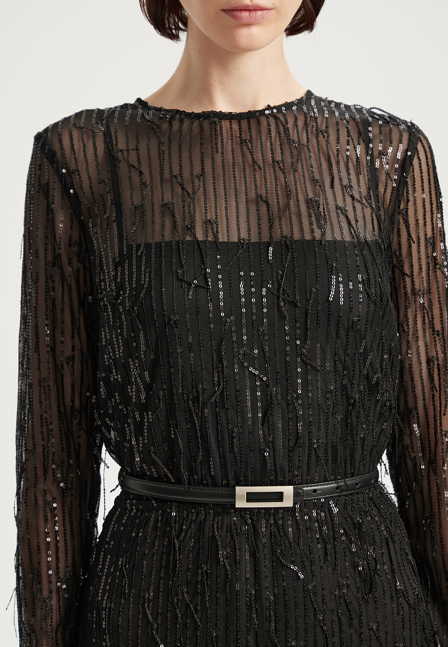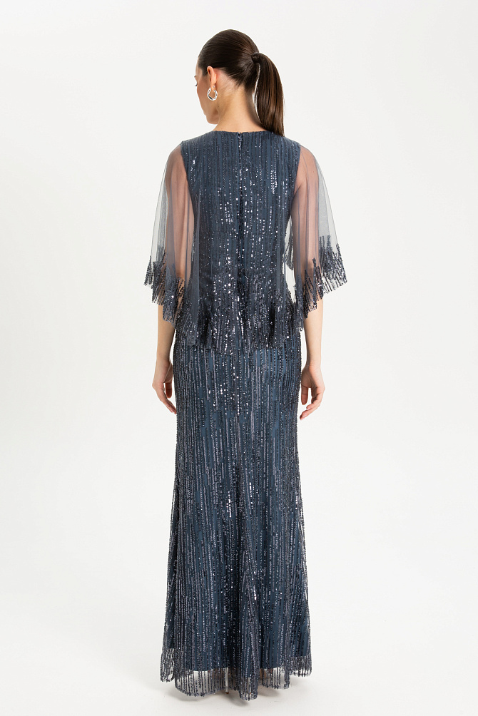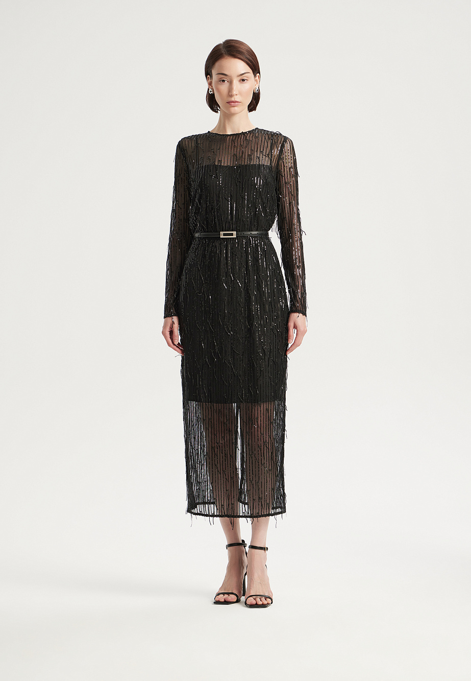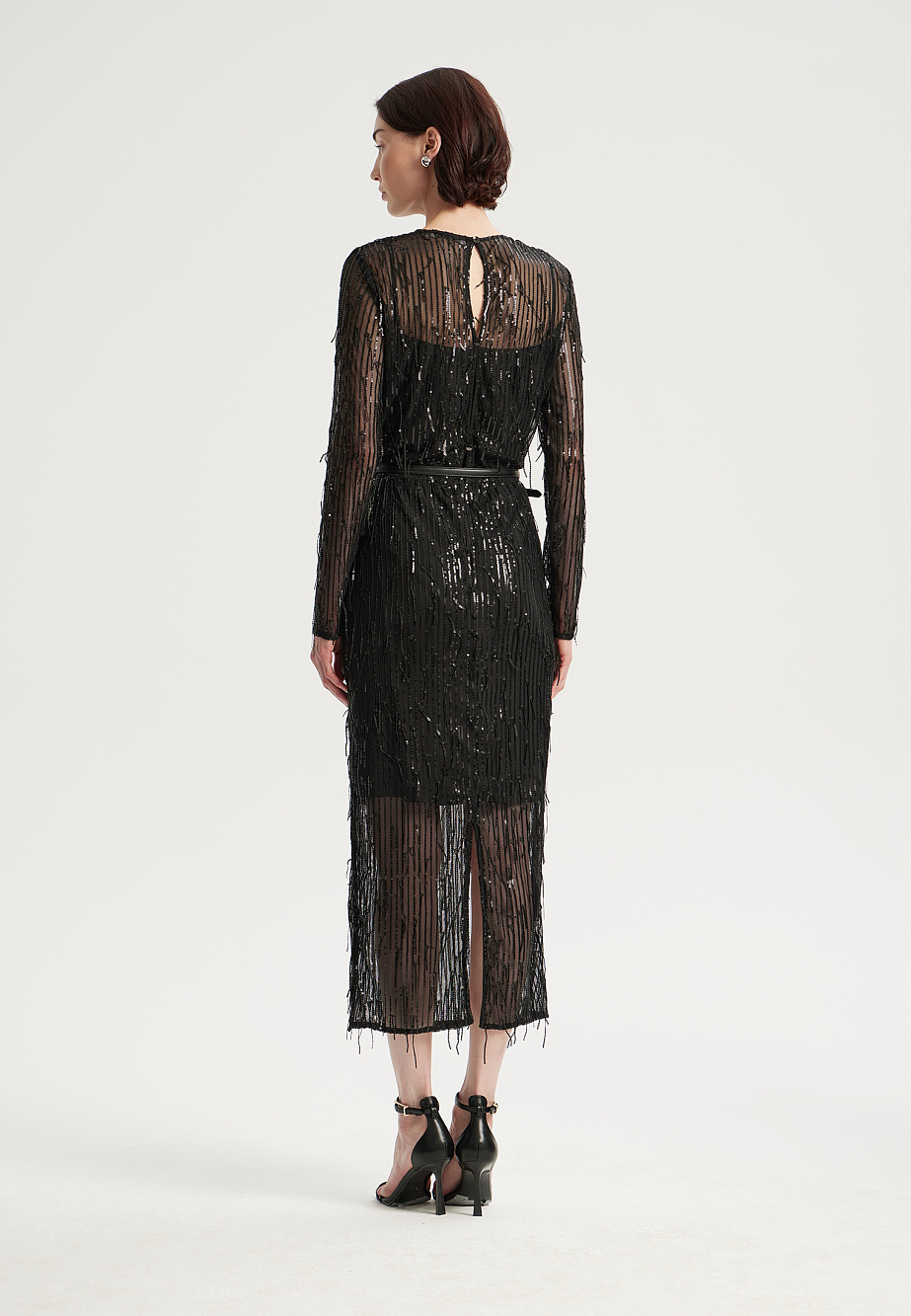 Элегантное коктейльное платье миди из ажурной сетки, декорировано мерцающей бахромой с пайетками. Модель с резинкой на талии и регулируемыми бретелями на подкладке подчеркивает фигуру, а разрез сзади добавляет образу легкости. Застежка на потайную молнию и декоративные пуговицы с навесными петлями обеспечивают идеальную посадку. В комплекте тонкий кожаный ремень для акцента на талии. Специальная обработка срезов делает швы мягкими, а изделие удобным для носки.