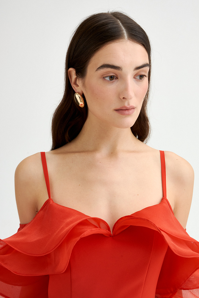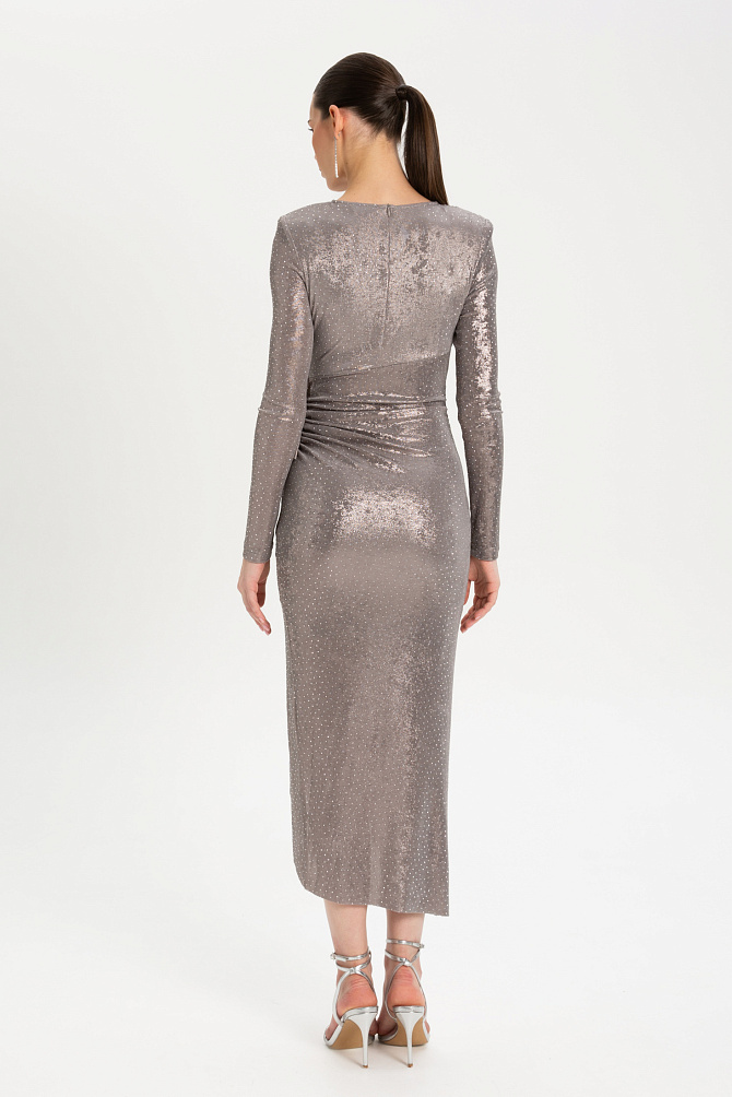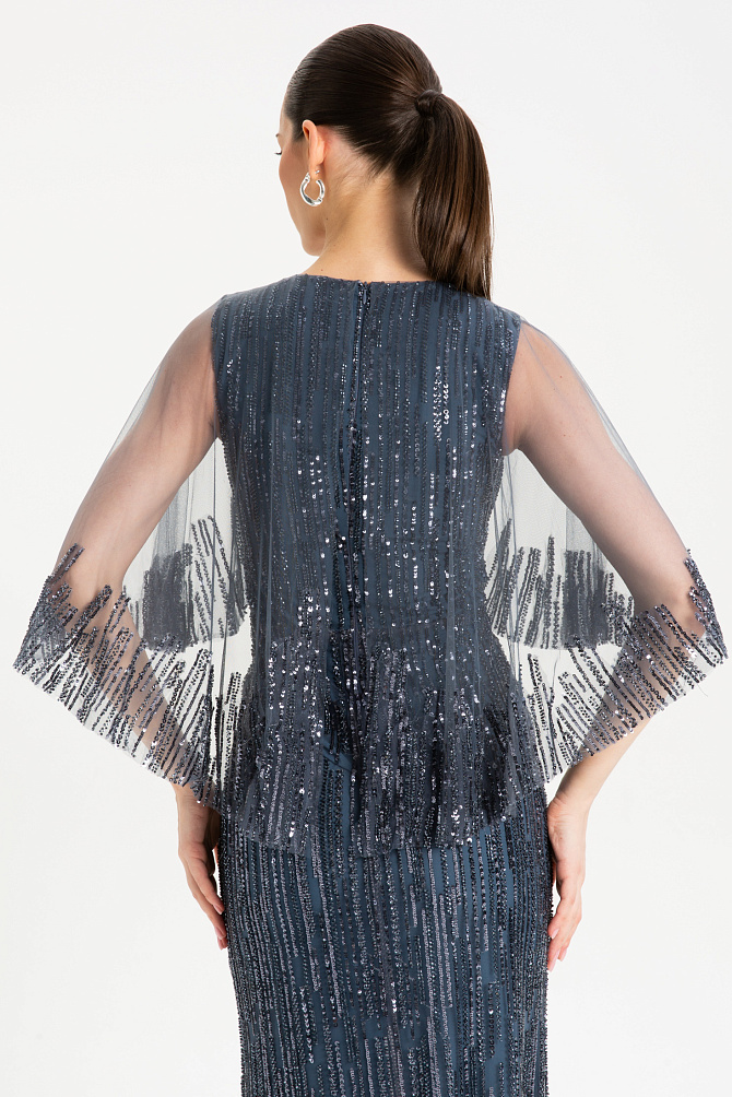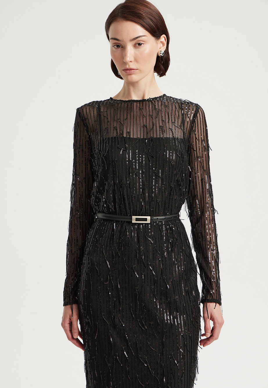 Элегантное коктейльное платье миди из ажурной сетки, декорировано мерцающей бахромой с пайетками. Модель с резинкой на талии и регулируемыми бретелями на подкладке подчеркивает фигуру, а разрез сзади добавляет образу легкости. Застежка на потайную молнию и декоративные пуговицы с навесными петлями обеспечивают идеальную посадку. В комплекте тонкий кожаный ремень для акцента на талии. Специальная обработка срезов делает швы мягкими, а изделие удобным для носки.