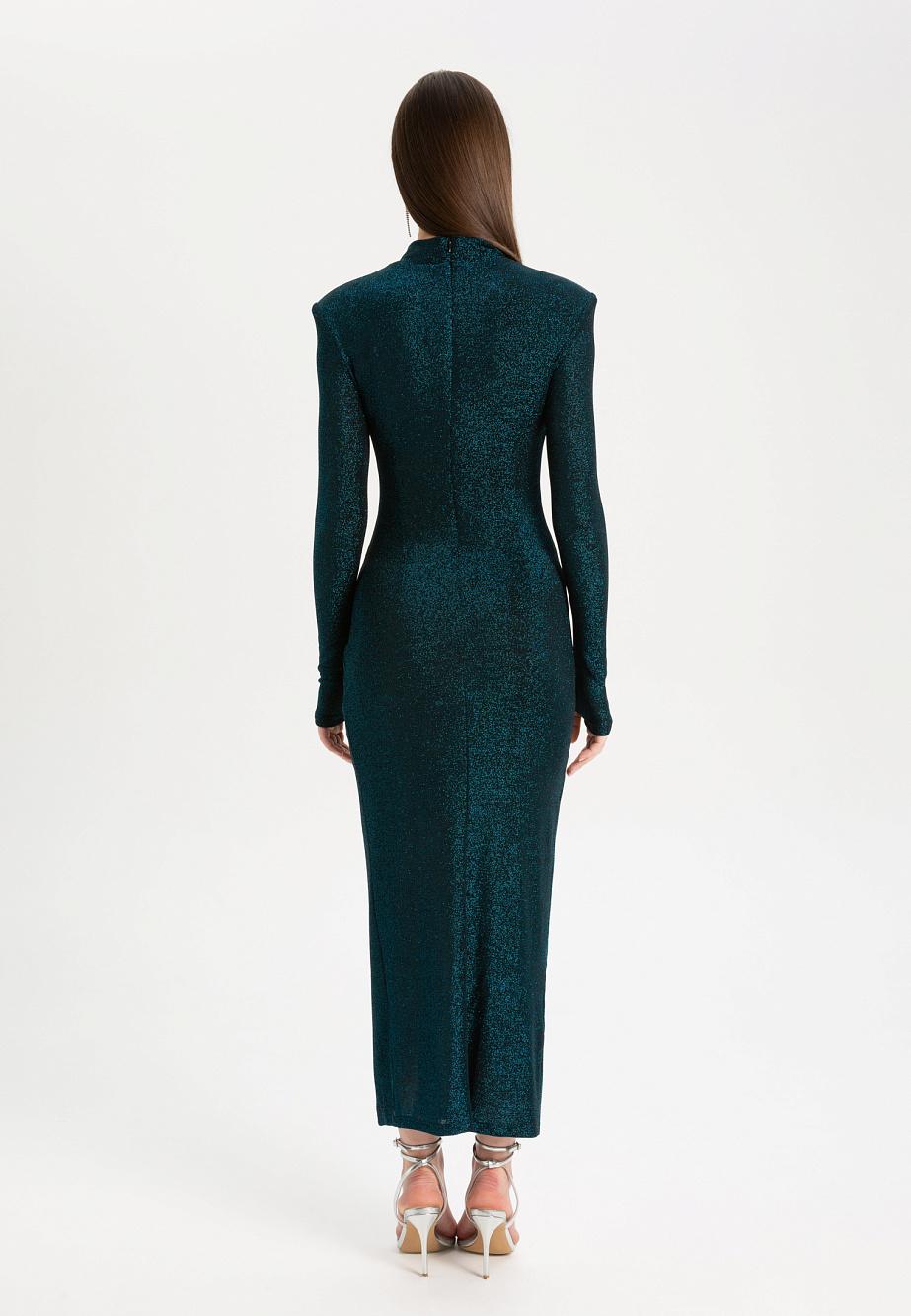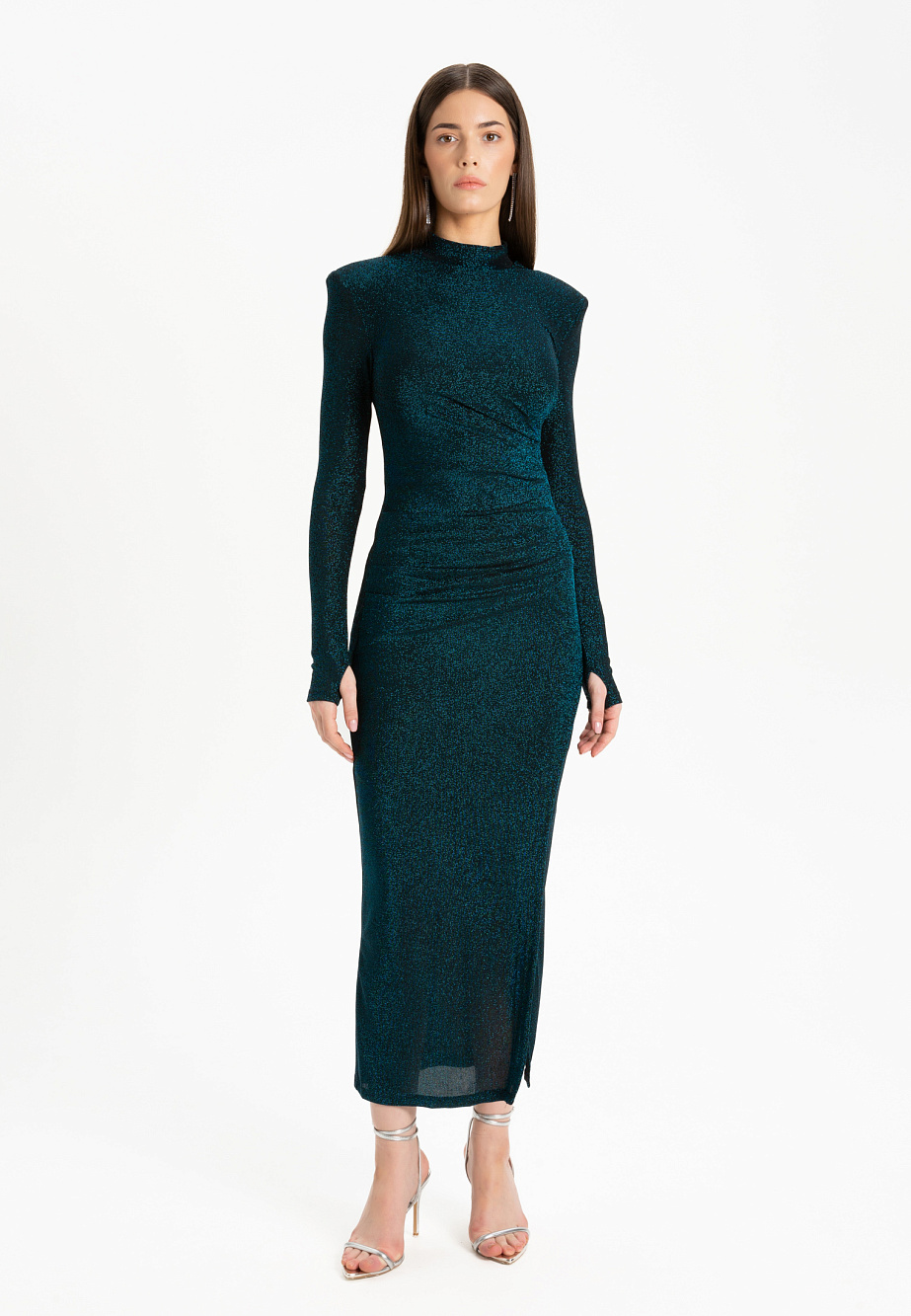 Элегантное вечернее платье миди из мягкого струящегося трикотажа с мерцающей люрексовой нитью. Облегающий силуэт с акцентными плечами подчеркивается драпировками на талии и эффектным разрезом по ноге. Горловина-стойка и длинные рукава с отверстием для большого пальца создают модный образ. Модель сзади застегивается на потайную молнию и дополнена эластичной сетчатой подкладкой.