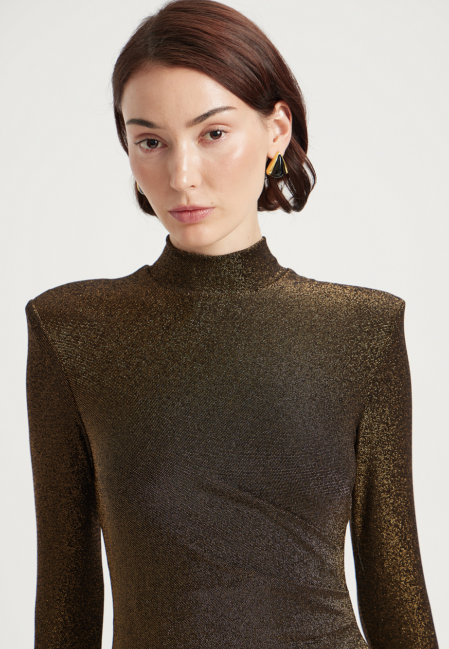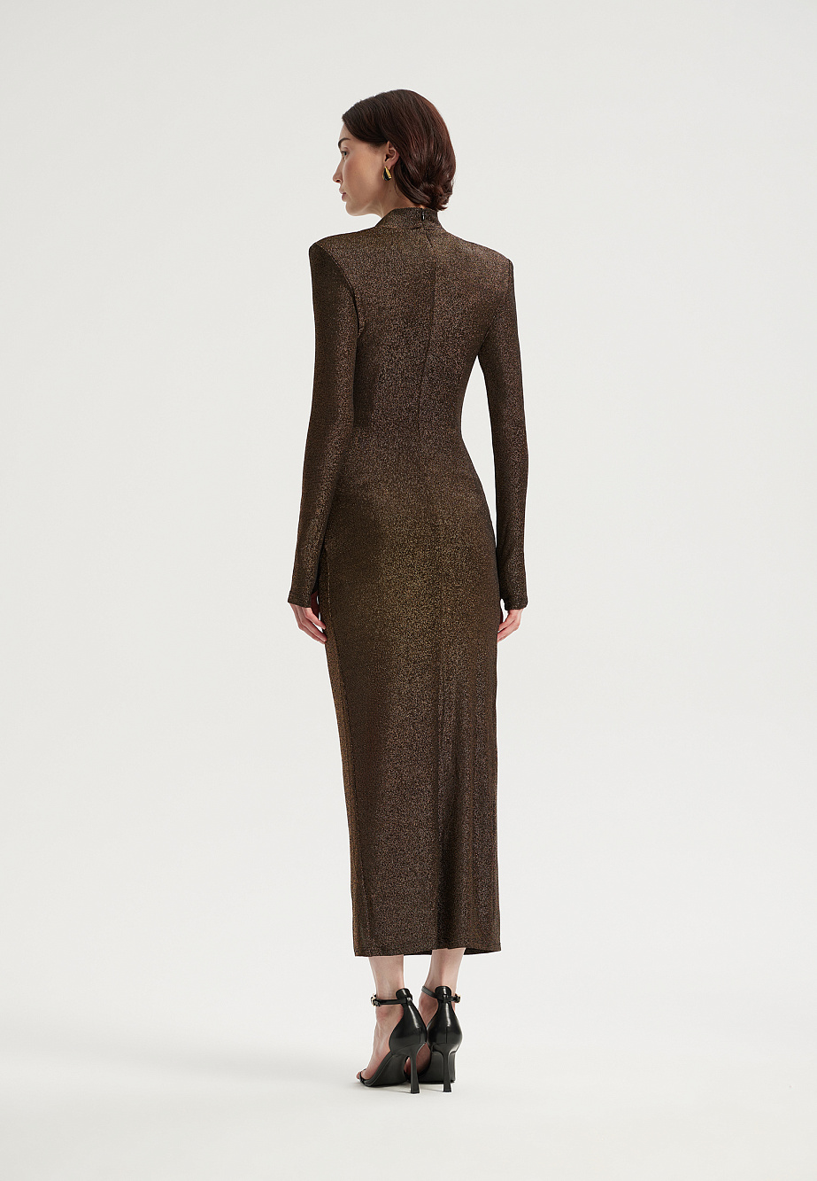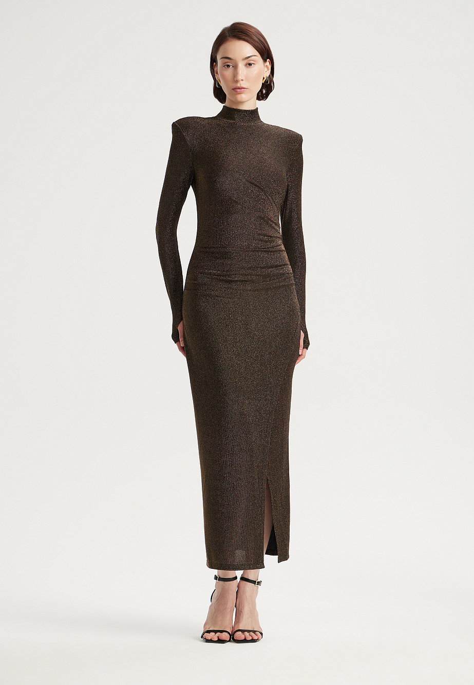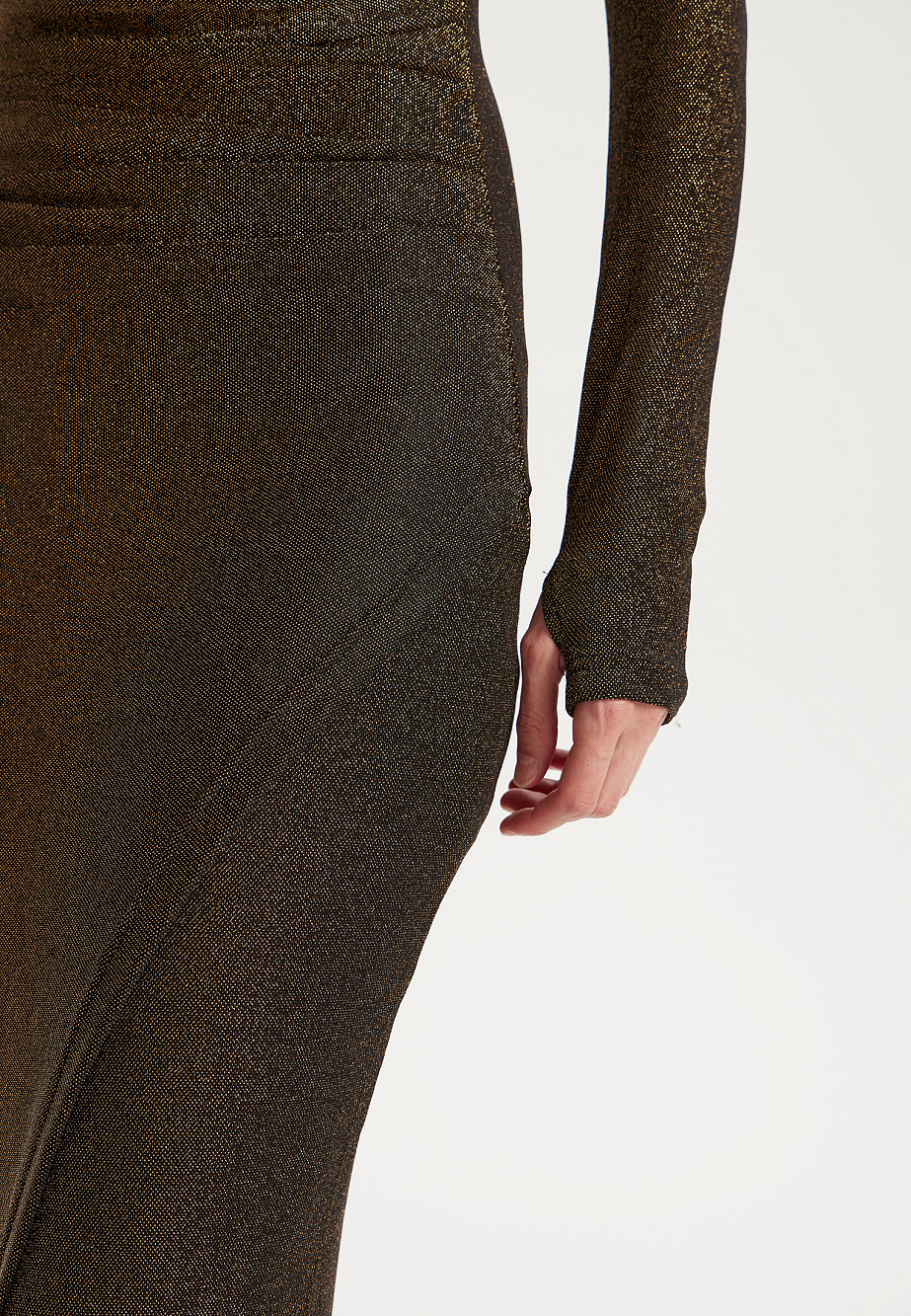 Элегантное вечернее платье миди из мягкого струящегося трикотажа с мерцающей люрексовой нитью. Облегающий силуэт с акцентными плечами подчеркивается драпировками на талии и эффектным разрезом по ноге. Горловина-стойка и длинные рукава с отверстием для большого пальца создают модный образ. Модель сзади застегивается на потайную молнию и дополнена эластичной сетчатой подкладкой.