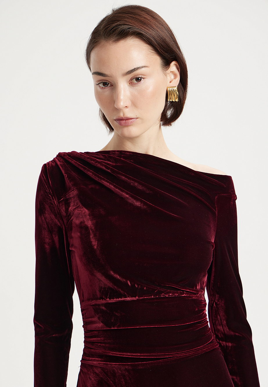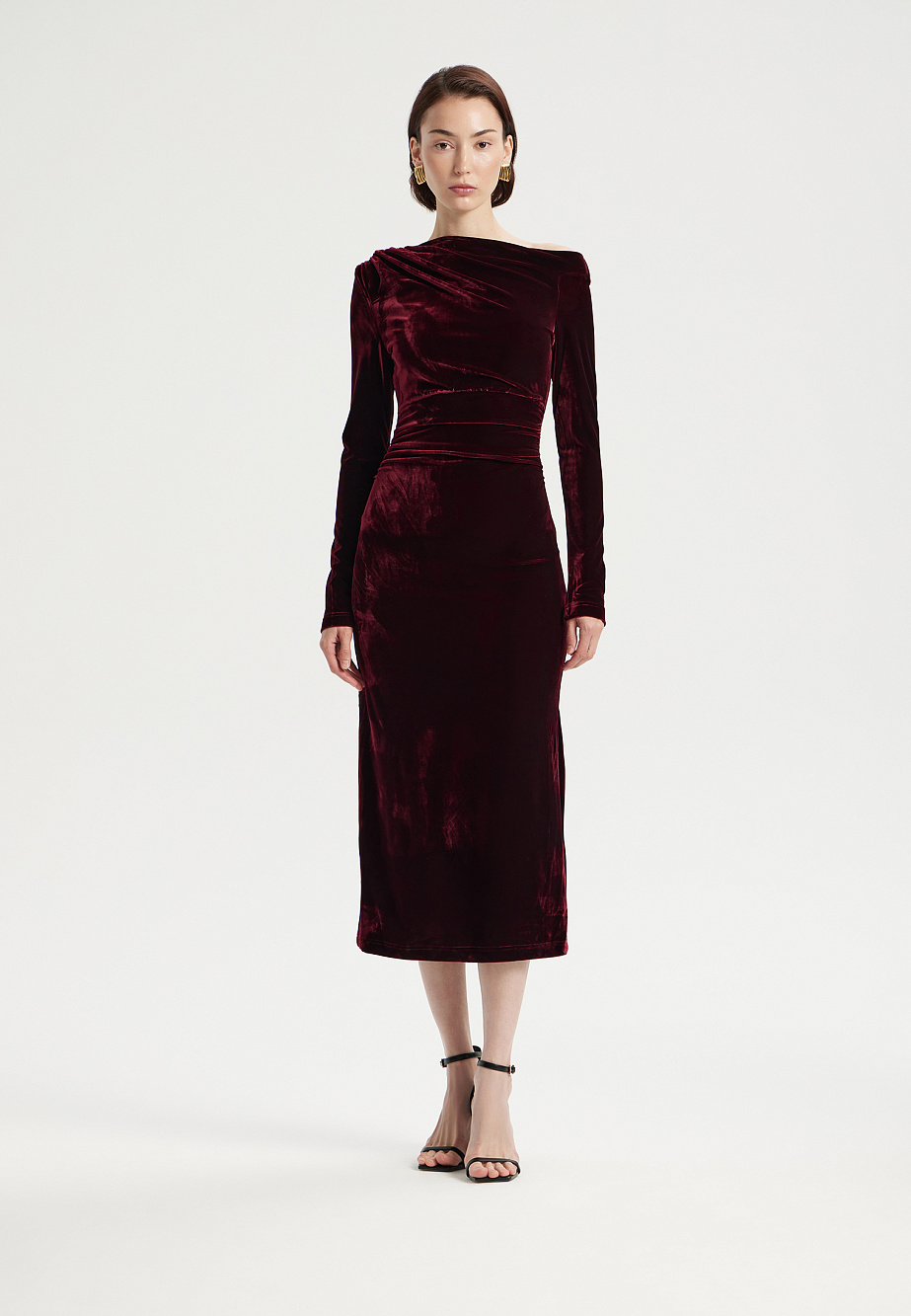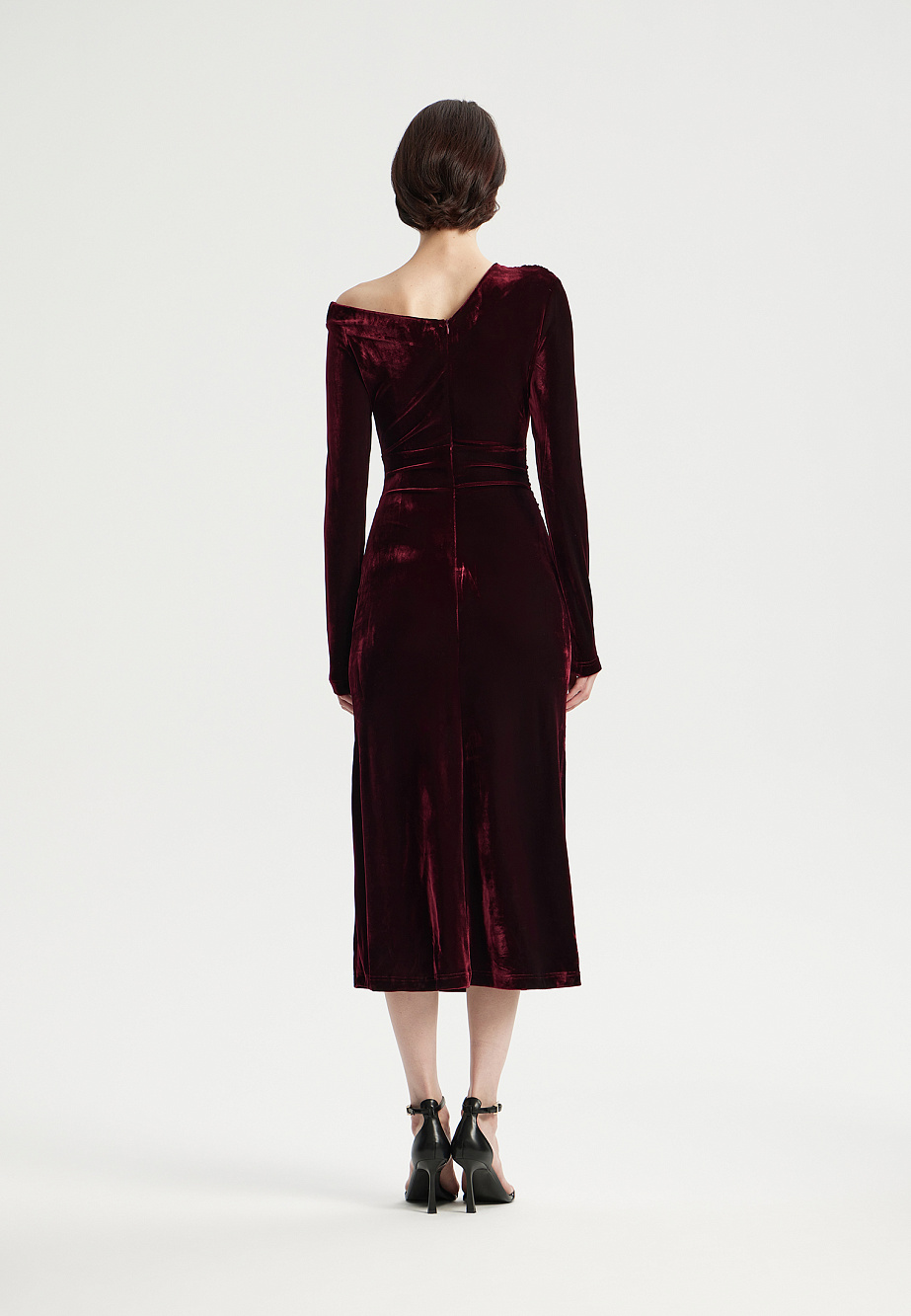 Элегантное вечернее платье миди из плотного эластичного бархата насыщенного цвета. Асимметричная горловина с открытым плечом и изящные драпировки создают современный силуэт, мягко подчеркивая или корректируя фигуру. Эластичная горловина и подкладка из стрейч-сетки обеспечивают идеальную посадку и удобство в носке. На спинке – потайная молния.