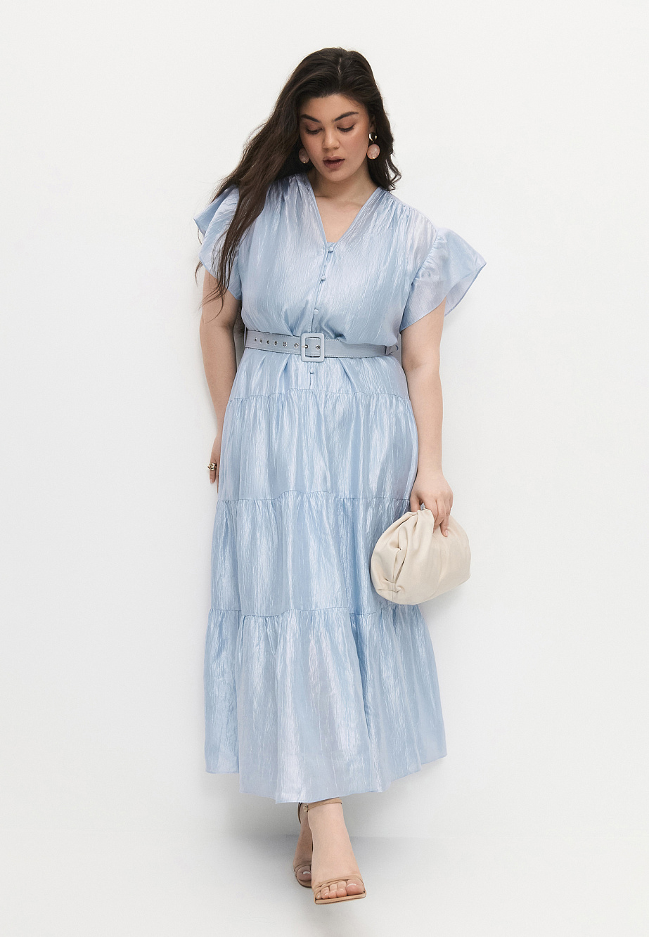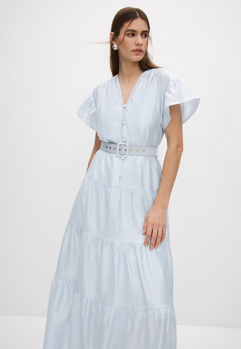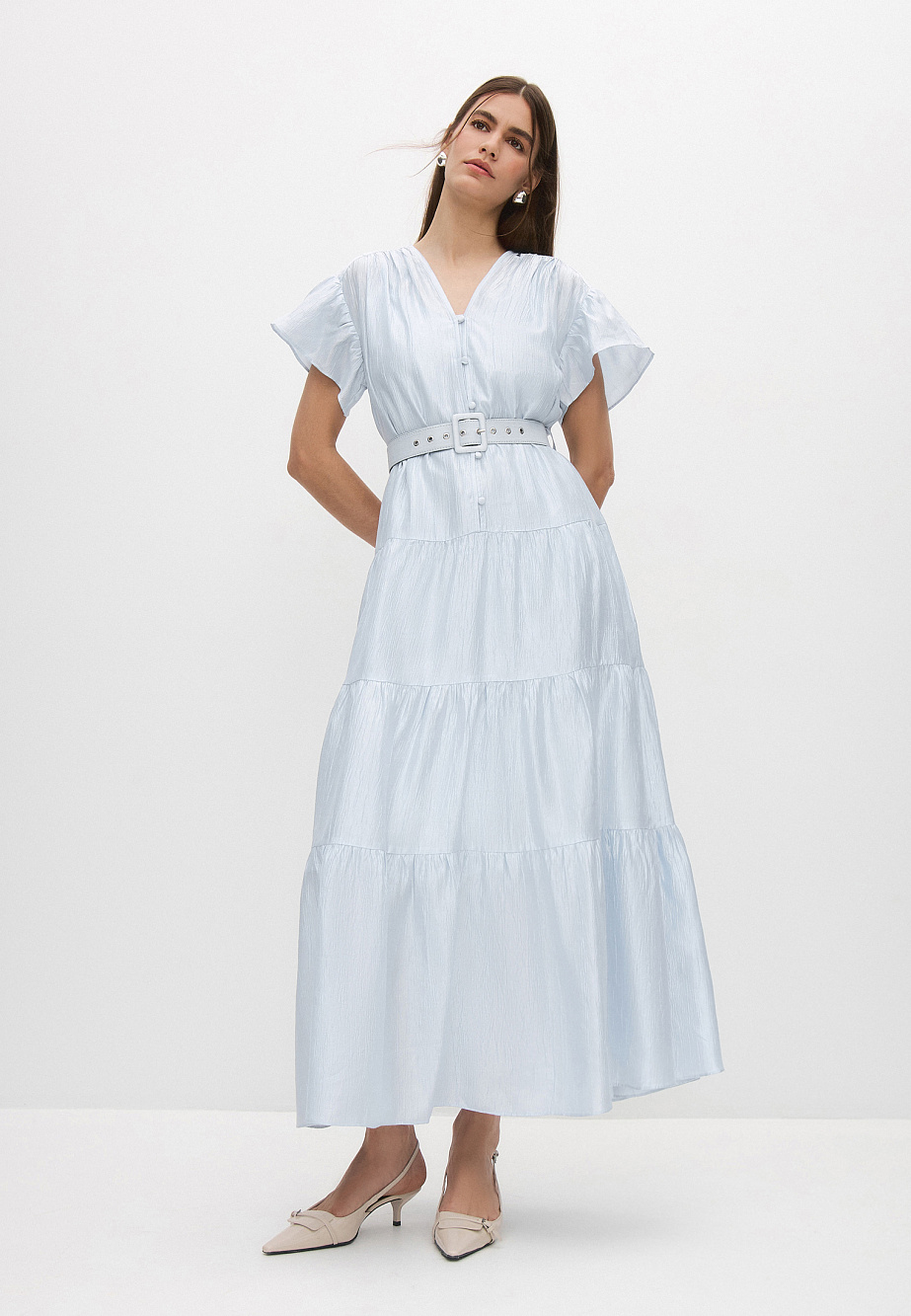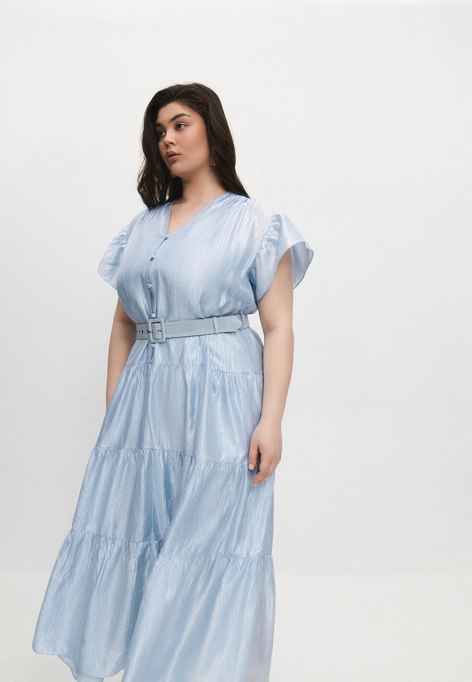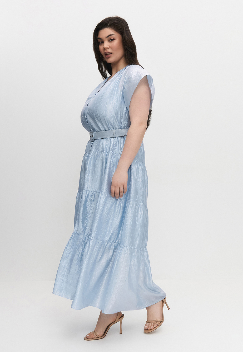 Платье из смесовой ткани с жатым эффектом крэш и глянцевым финишем, свободного силуэта и расклешенное книзу ярусами. Линию талии можно подчеркнуть обтяжным ремнем. Застежка с навесными петлями и обтяжными пуговицами по V-образному вырезу. В комплекте с платьем есть подкладка-комбинация с регулируемыми бретелями. Универсальная модель, которая подходит для любого типа фигуры и на самые разные случаи.