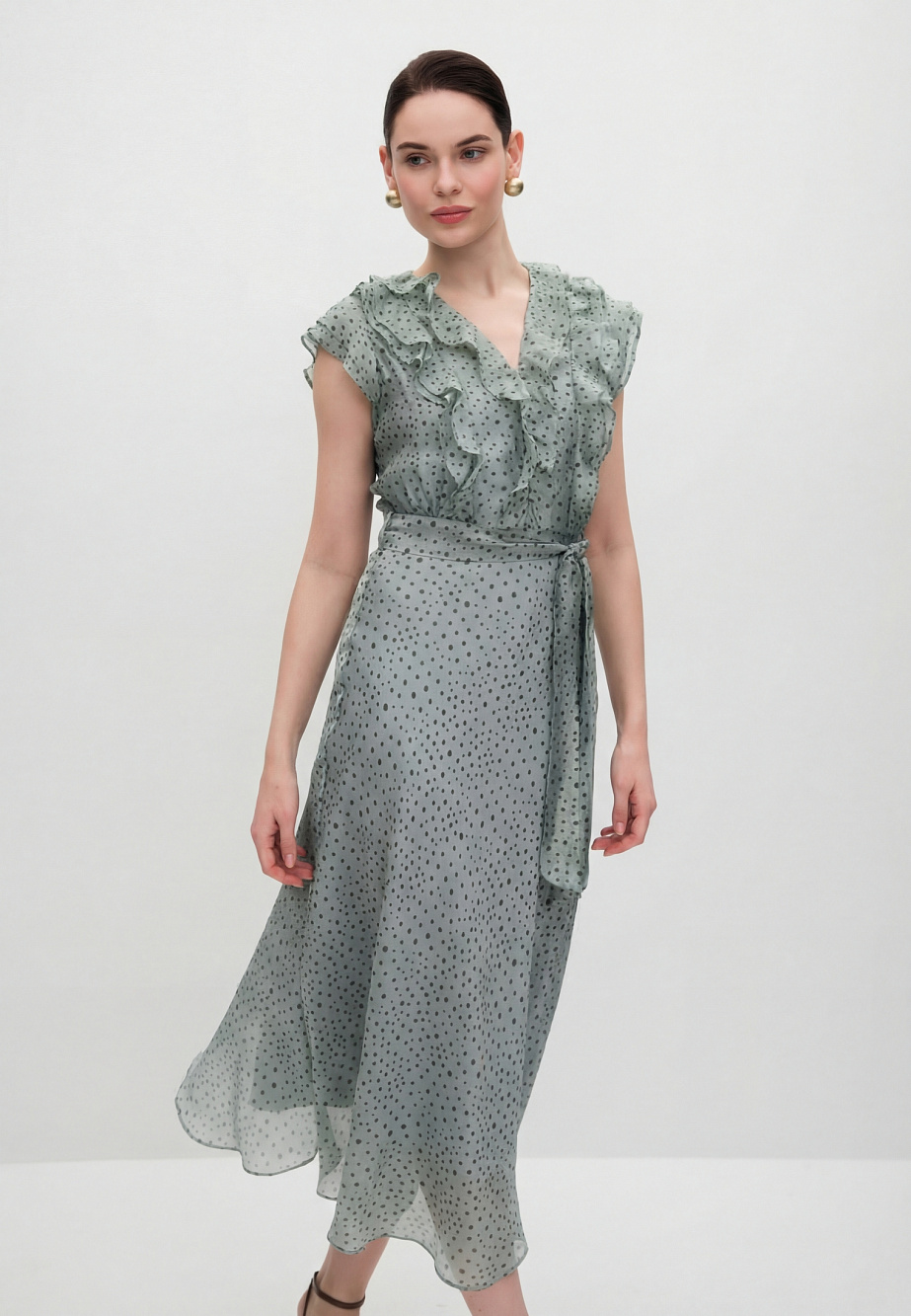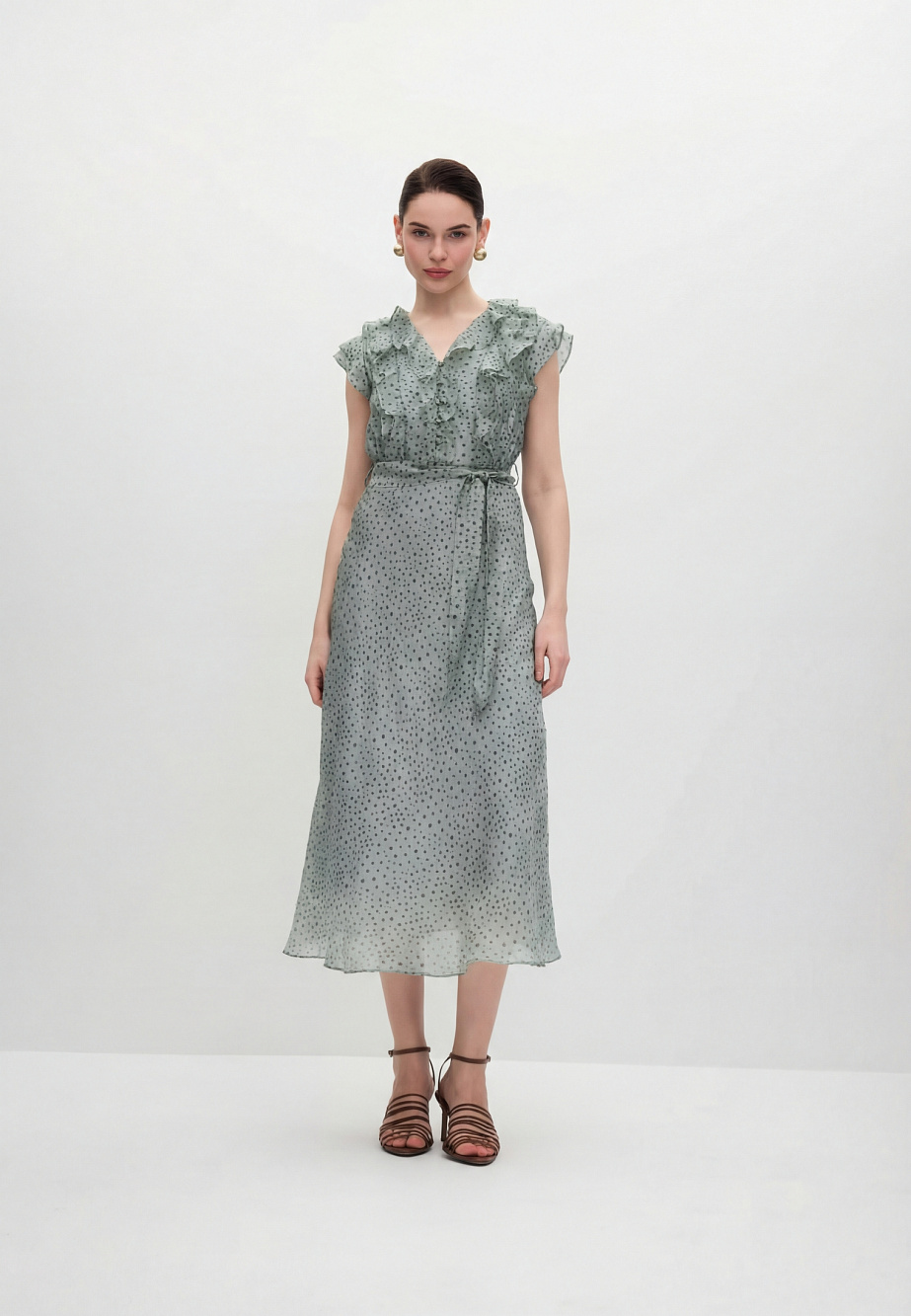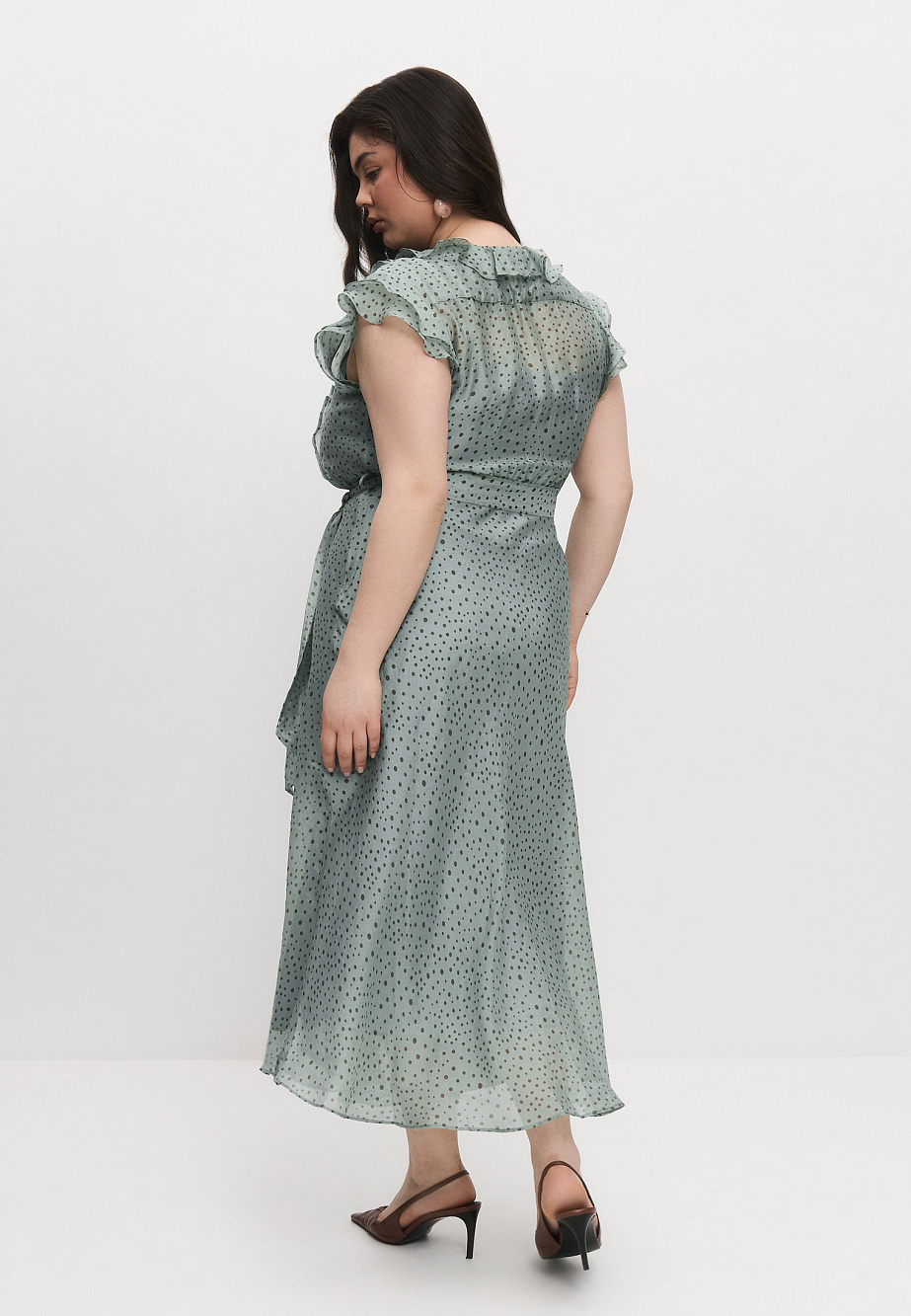 Романтичное платье из полупрозрачной вискозной органзы и принтом Polka Dot для солнечных летних дней. Изящные рюши на груди и рукава-крылышки придают платью легкость и наполняют его воздухом. Крой юбки по косой позволяет добиться аккуратной посадки и равномерных фалд по низу платья. Модель застегивается на потайную молнию в боковом шве и на воздушные петли и пуговицы по переду лифа. В комплекте с платьем есть поливискозная подкладка- комбинация на регулируемых бретелях и текстильный пояс.