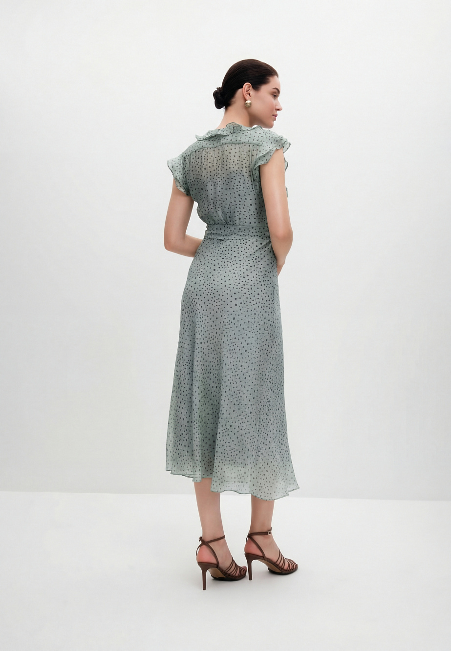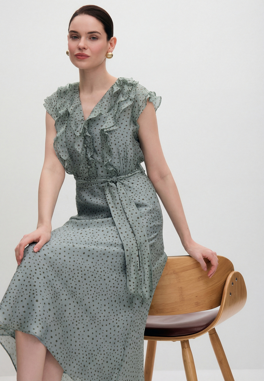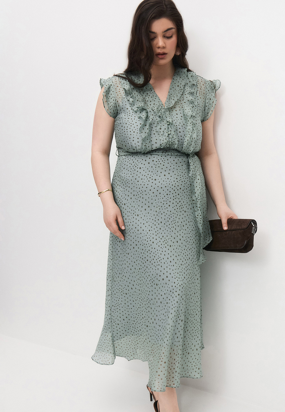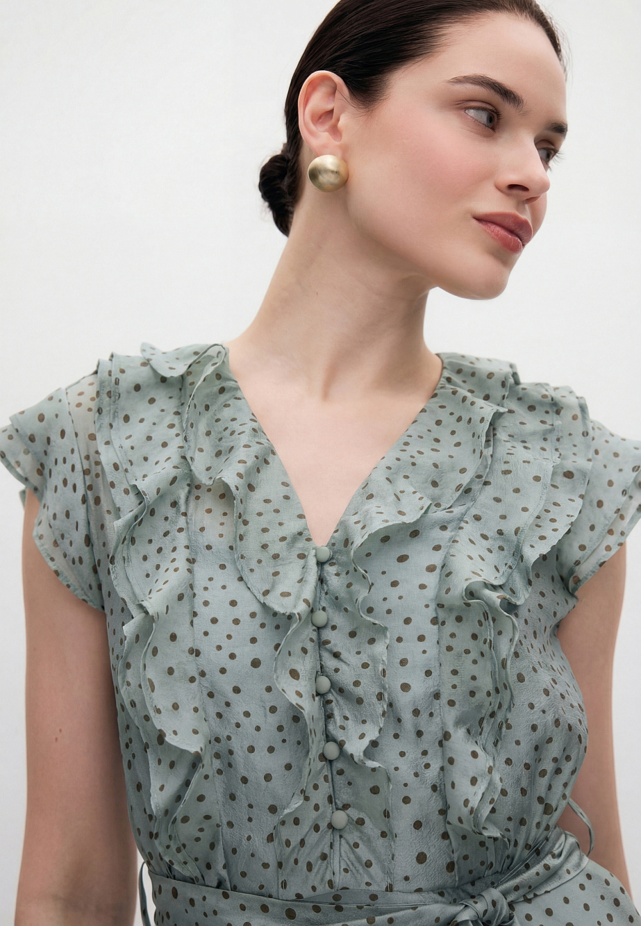 Романтичное платье из полупрозрачной вискозной органзы и принтом Polka Dot для солнечных летних дней. Изящные рюши на груди и рукава-крылышки придают платью легкость и наполняют его воздухом. Крой юбки по косой позволяет добиться аккуратной посадки и равномерных фалд по низу платья. Модель застегивается на потайную молнию в боковом шве и на воздушные петли и пуговицы по переду лифа. В комплекте с платьем есть поливискозная подкладка- комбинация на регулируемых бретелях и текстильный пояс.