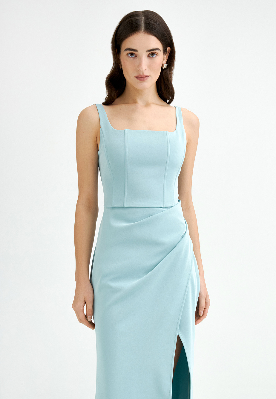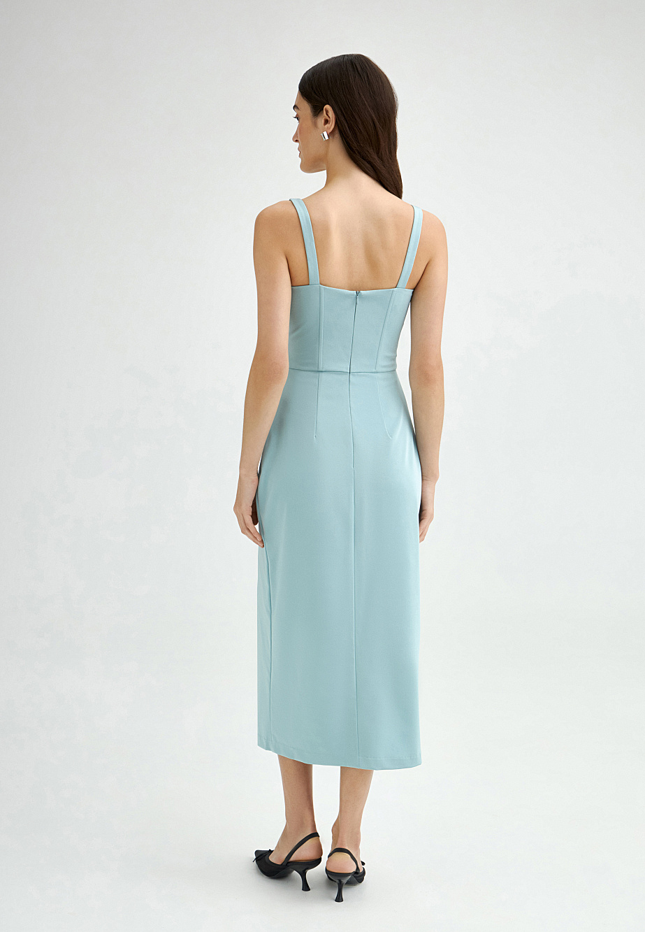 Платье из плотного стрейч-сатина с корсетным лифом и миди-юбкой создано для ярких и запоминающихся выходов. Конструкция корсета усилена регилином по рельефам для точной посадки и поддержки, а юбка с асимметричными защипами и разрезом выделяет плавные линии силуэта. Плотная ткань и точные пропорции подчеркивают фигуру, создавая выразительный образ. Запас по длине бретелей позволяет адаптировать посадку под индивидуальные парметры фигуры.