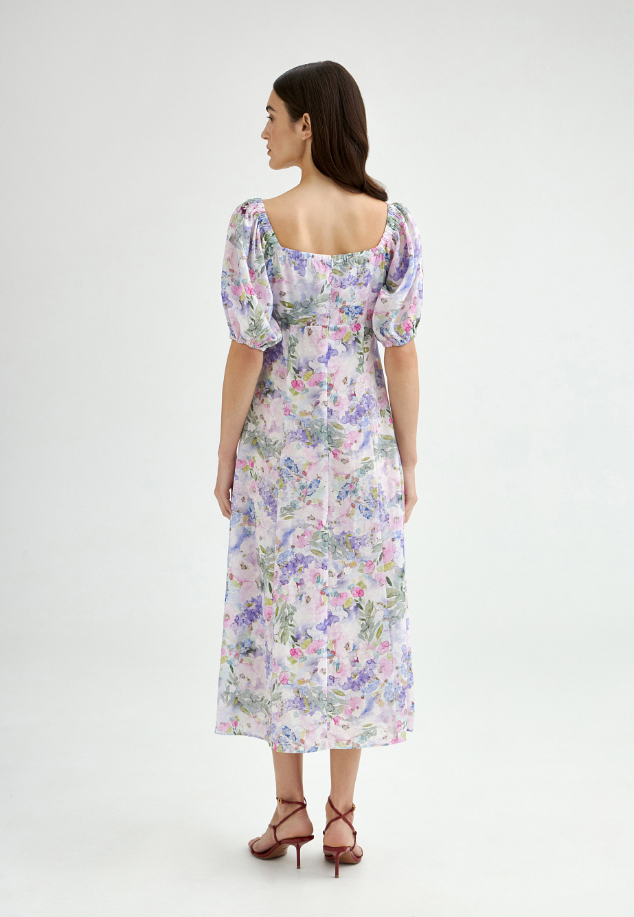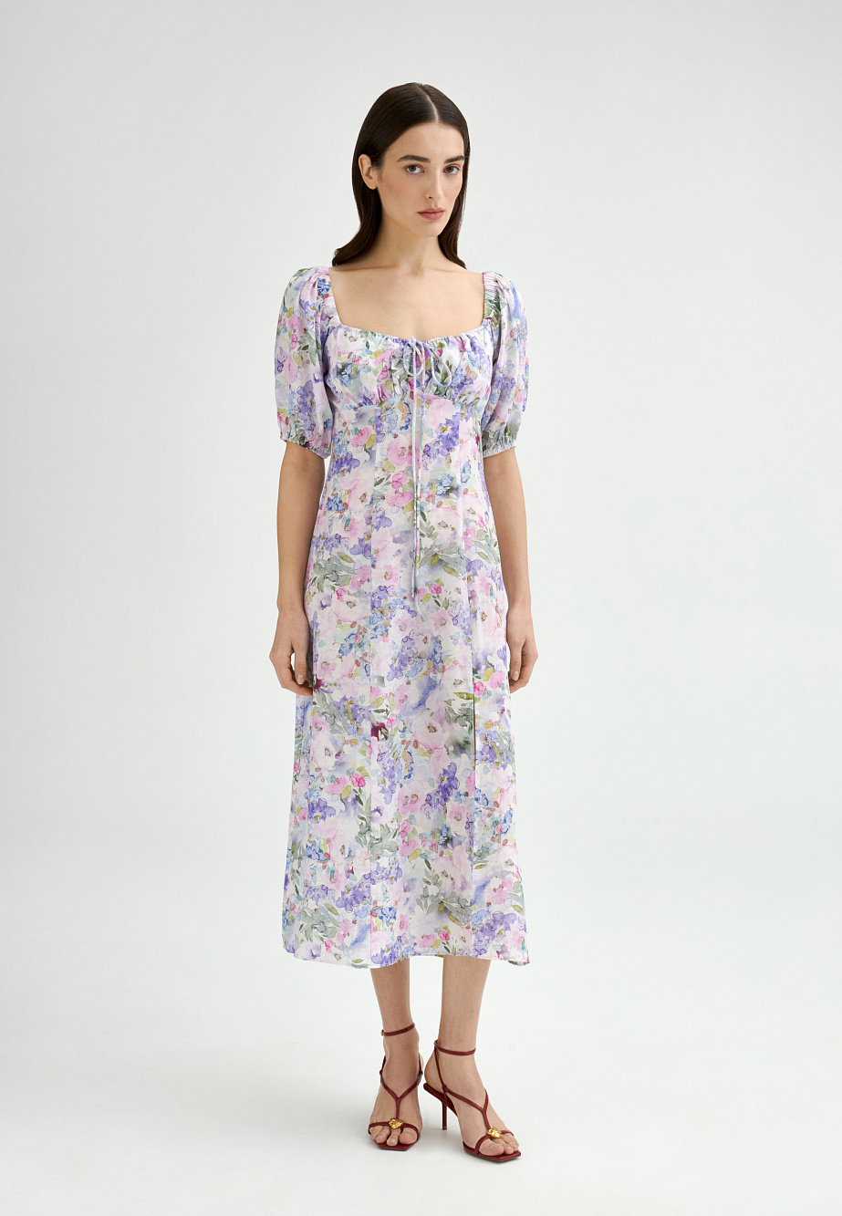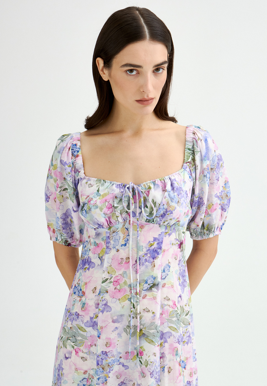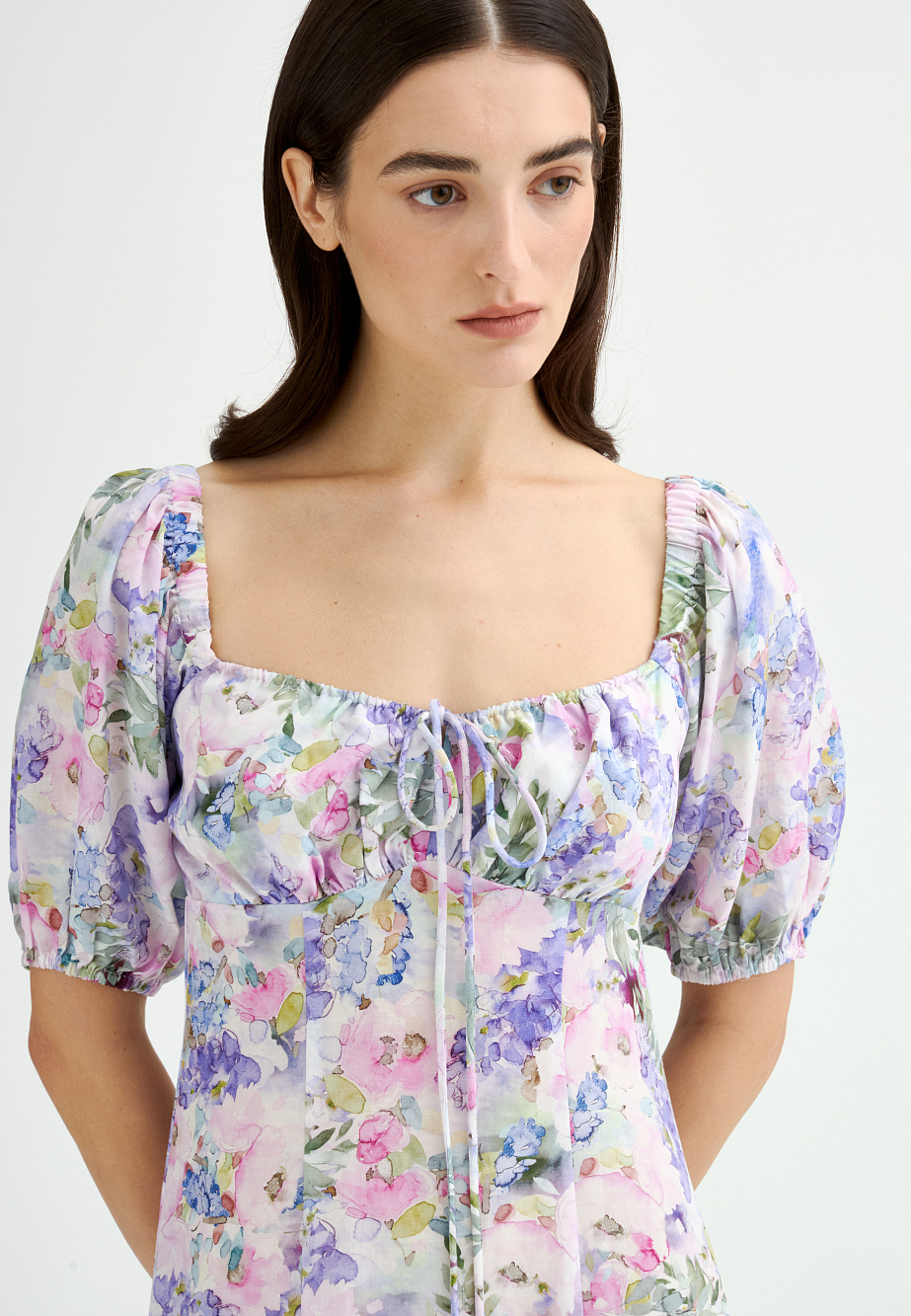 Легкое и летнее платье в стиле Provence из прохладного и струящегося модала в нежном акварельном принте, слегка расклешенного силуэта, с подрезом под грудью. Драпировка на груди, которая позволяет регулировать комфортное прилегание и объемный рукав придают образу удобство и романтичность. Нежный принт и женственные детали ассоциируются с ароматом лаванды и пряных трав, солнцем и свежим ветром и дарят неповторимое ощущение летнего настроения даже в условиях мегаполиса.