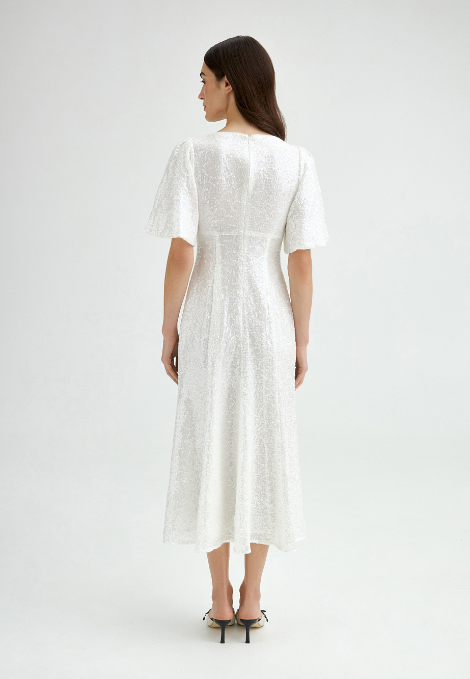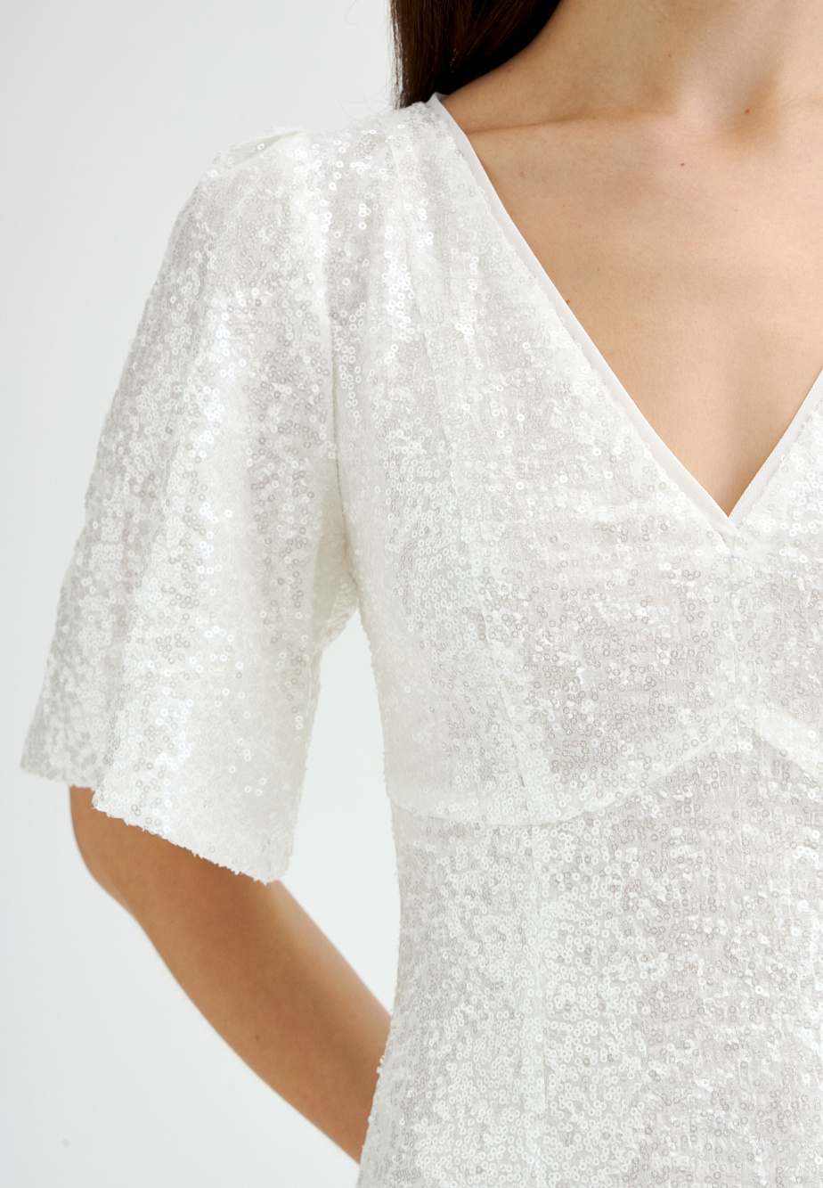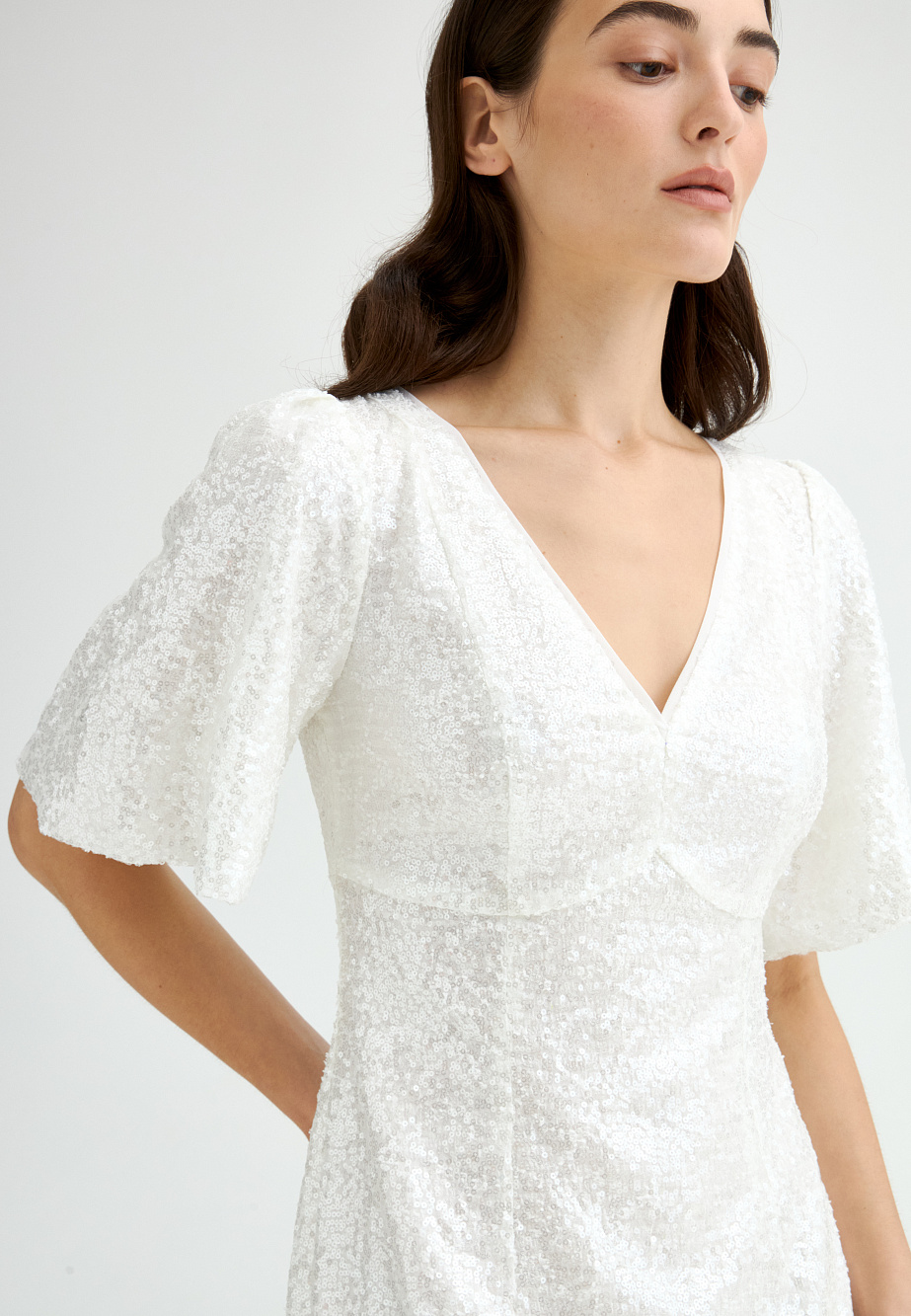 Платье из шифона с прозрачными пайетками сделает вам главной героиней торжественного вечера или праздника. Искрящаяся фактура ткани, элегантные пропорции и утончённый белый оттенок создают эффектный, запоминающийся образ. V-образный вырез, подрез под грудью, объемные рукава с буфами и приталенный силуэт акцентируют внимание на женственных линиях. Подкладка из района, отделочный кант по краю горловины, предотваращающий контакт с пайетками, обеспечивают удобство и практичность.