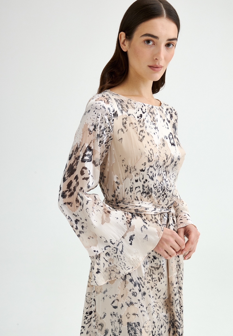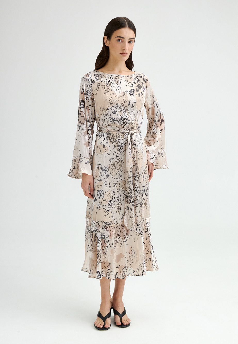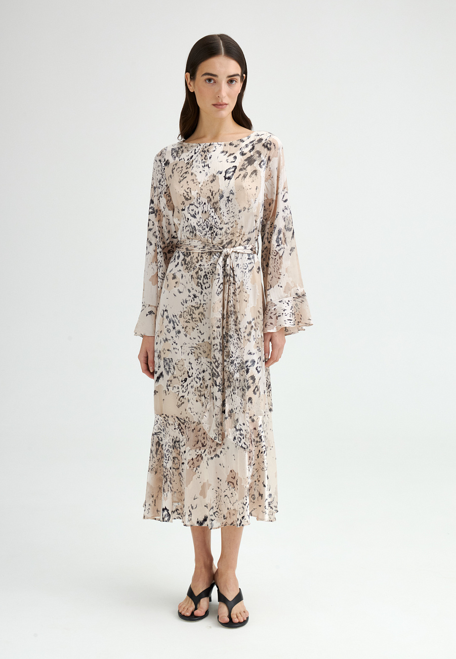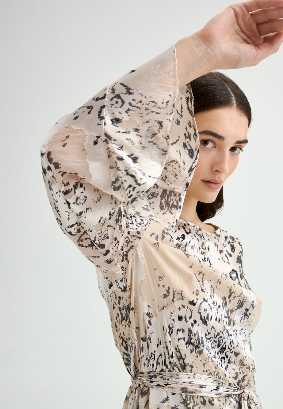 Платье из легкой вискозной ткани с эффектом devore и анималистичным принтом сочетает в себе лаконичный крой и выразительный рисунок. Свободный силуэт, расклешенные рукава, воланы и воротник-лодочка добавляют женственности и комфорта. Пояс, завязывающийся на талии, делает акцент на фигуре. Платье дополено подкладкой из района.