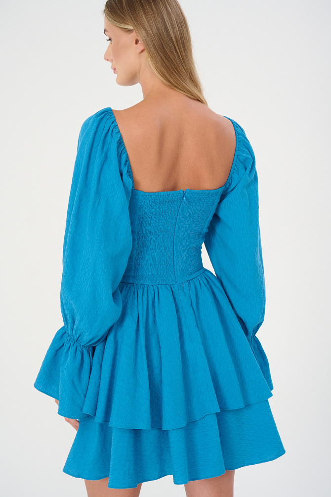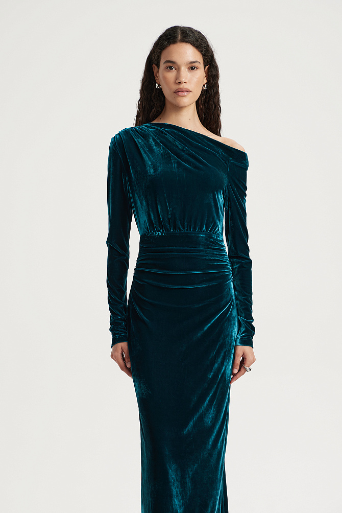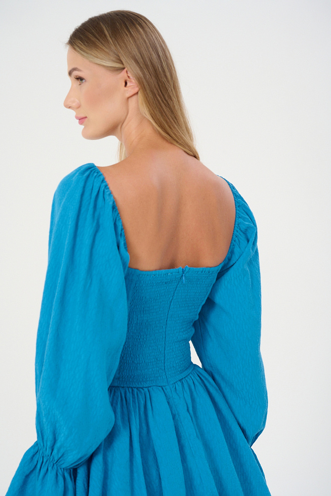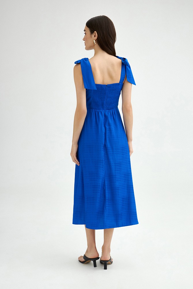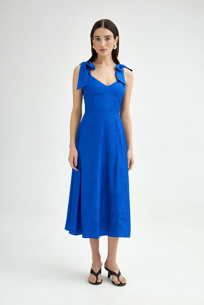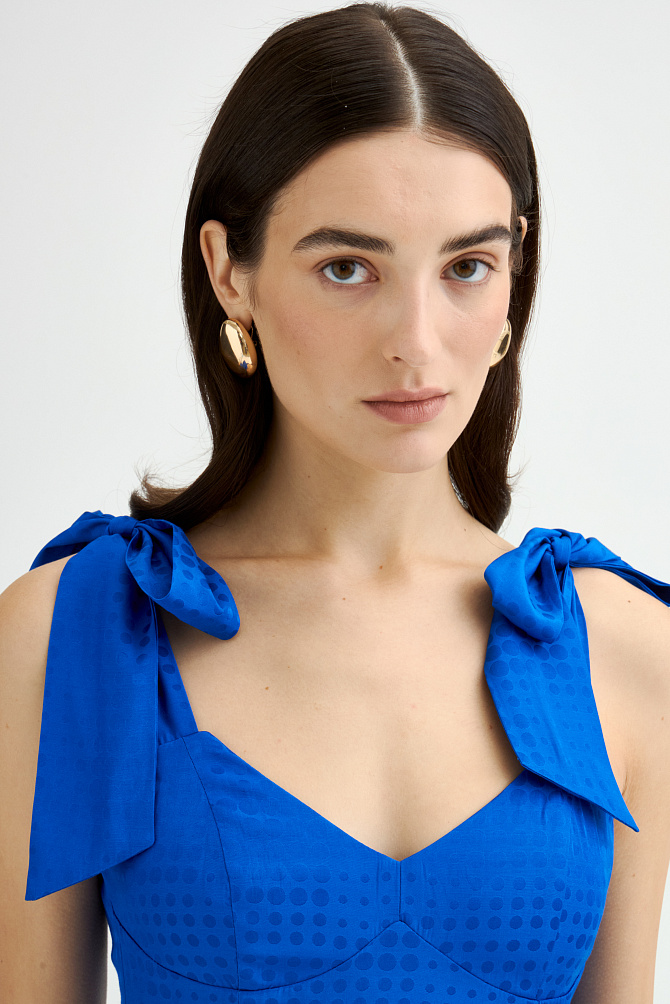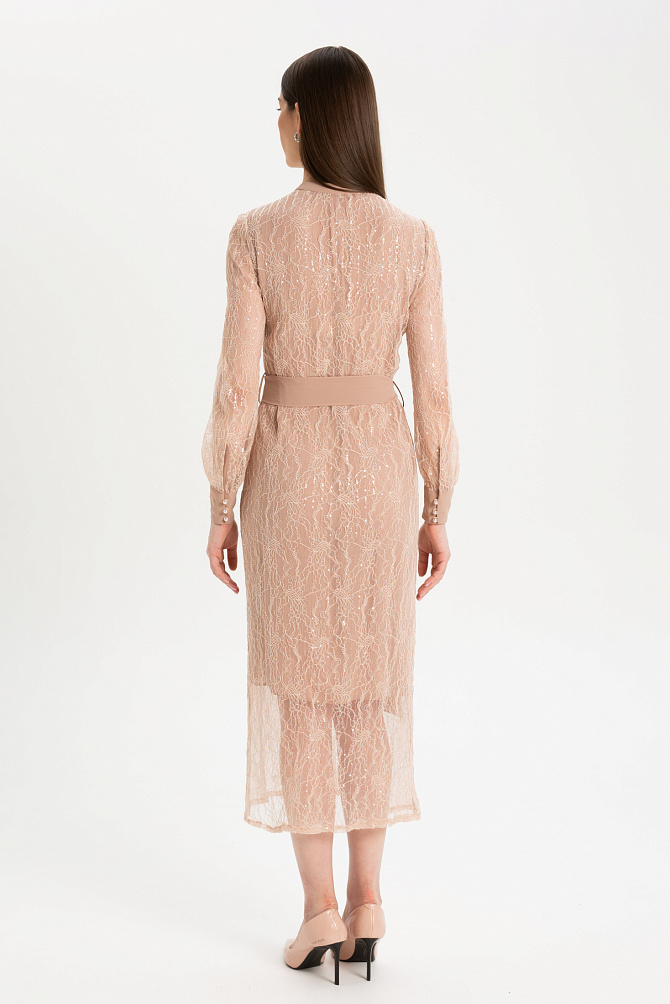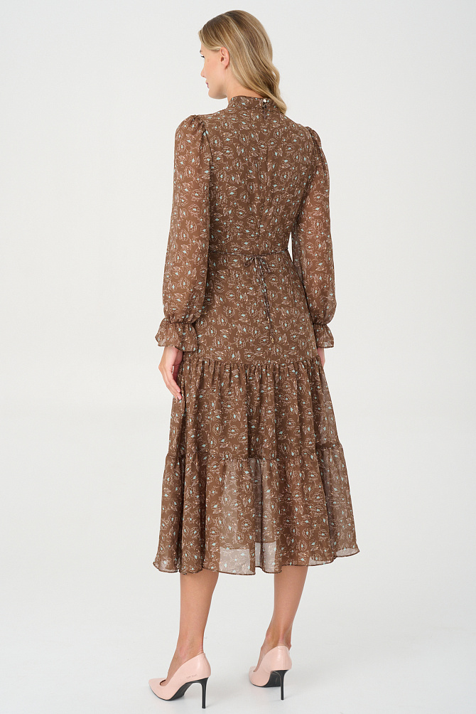 Платье из легкой вискозной ткани с эффектом devore и анималистичным принтом сочетает в себе лаконичный крой и выразительный рисунок. Свободный силуэт, расклешенные рукава, воланы и воротник-лодочка добавляют женственности и комфорта. Пояс, завязывающийся на талии, делает акцент на фигуре. Платье дополено подкладкой из района.
