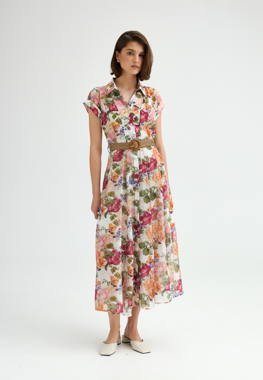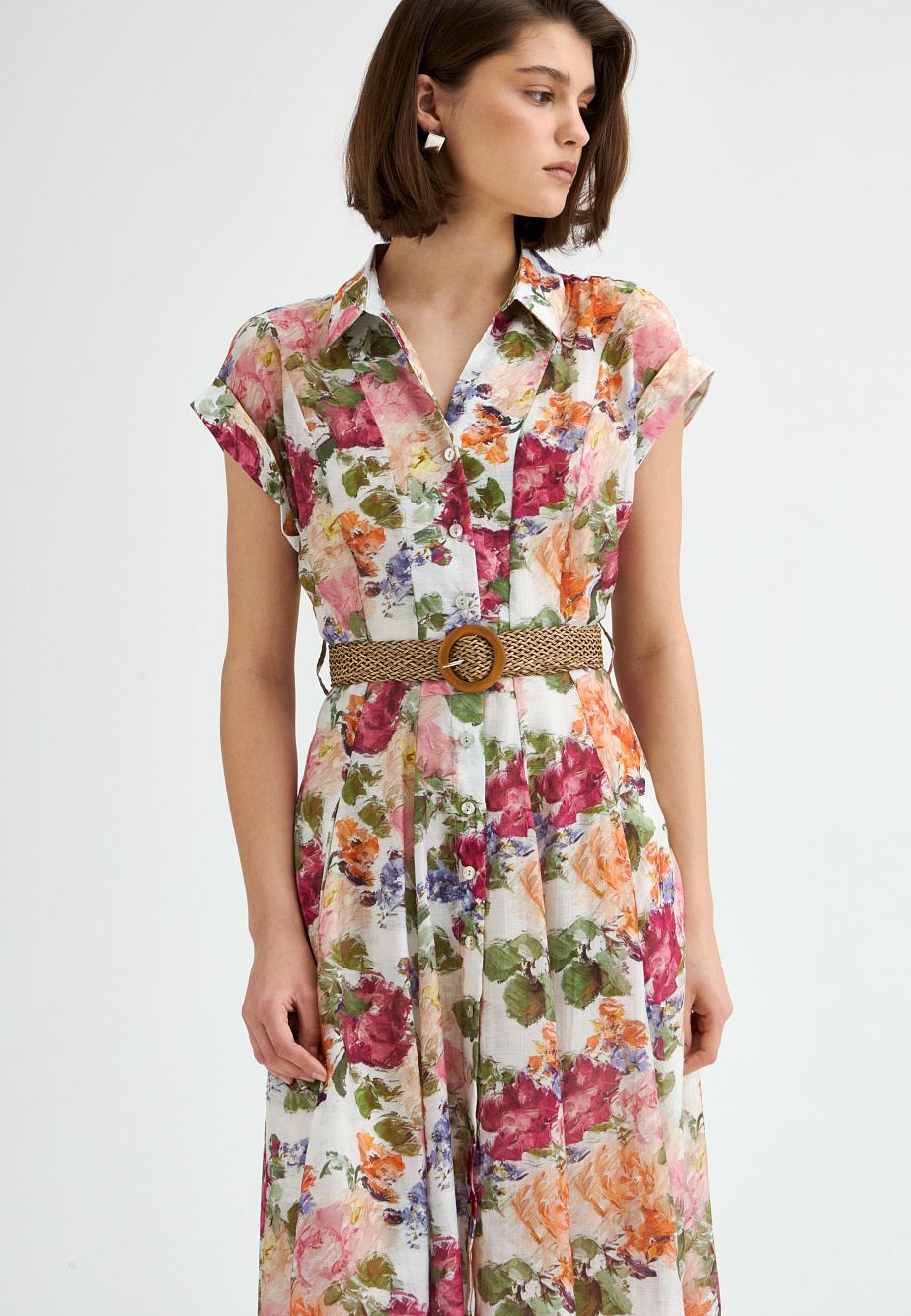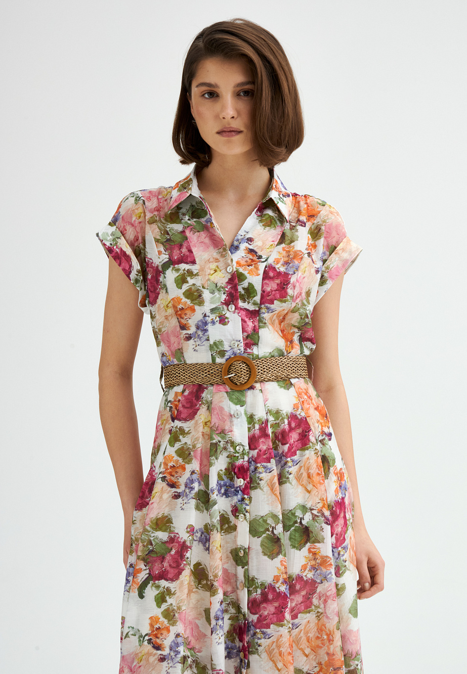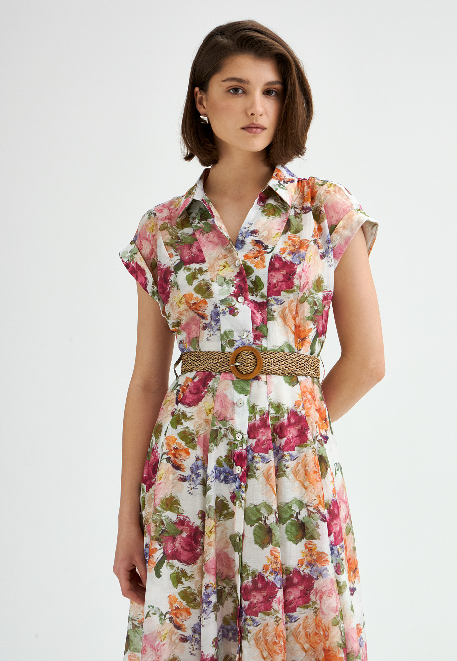 Платье-рубашка, выполненное из полупрозрачной ткани с тенселем и ярким цветочным принтом, станет главным героем в летнем гардеробе. Спущенные свободные рукава с манжетами, рубашечный воротник и элегантная юбка, расклешенная клиньями, придают модели легкость и элегантность. Подрез под грудью с плетеным ремнем на талии создает эффектные пропорции, подчеркивая женственность силуэта. В комплекте — подкладка в виде платья-комбинации из района с регулируемыми бретелями. Тенсель - экологически чистое волокно из древесины эвкалипта.